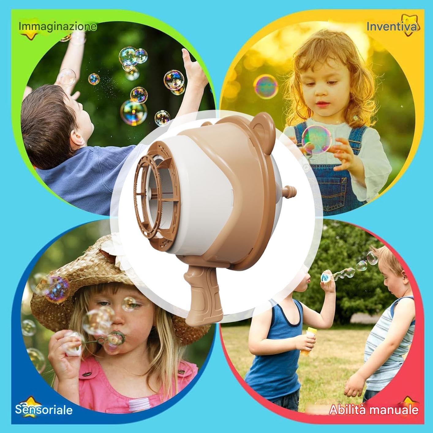 Funzionamento intuitivo: Si senza istruzioni complesse per creare bolle fino a 5 metri, prolungando il divertimento durante incontri familiari o gite all'aperto con momenti di allegria condivisa Condividi la Felicità: Diffondi gioia con il gioco delle bolle, un'idea regalo creativa che aumenta l'intrattenimento e ti aiuta a mostrare attenzione, creando connessioni naturali tra le persone care Trasporto Semplice: Ispira i bambini a esplorare l'esterno con portabilità leggera e senza sforzo, adatto a parco, spiaggia e cortile, migliorando naturalmente la scoperta attiva e momenti felici senza peso extra o complicazioni Gioco Completo: Ideale per bambini oltre i 3 anni, promuove la coordinazione occhio-mano, potenzia la creatività e nutre competenze sociali essenziali in un ambiente di apprendimento ludico con bolle Intrattenimento Assicurato: Porta allegria creando un ambiente di gioco gioioso con bolle colorate robuste; includendo 10 flaconcini di liquido, questo articolo potenzia il divertimento e supporta momenti ricreativi per bambini attraverso il gioco interattivo