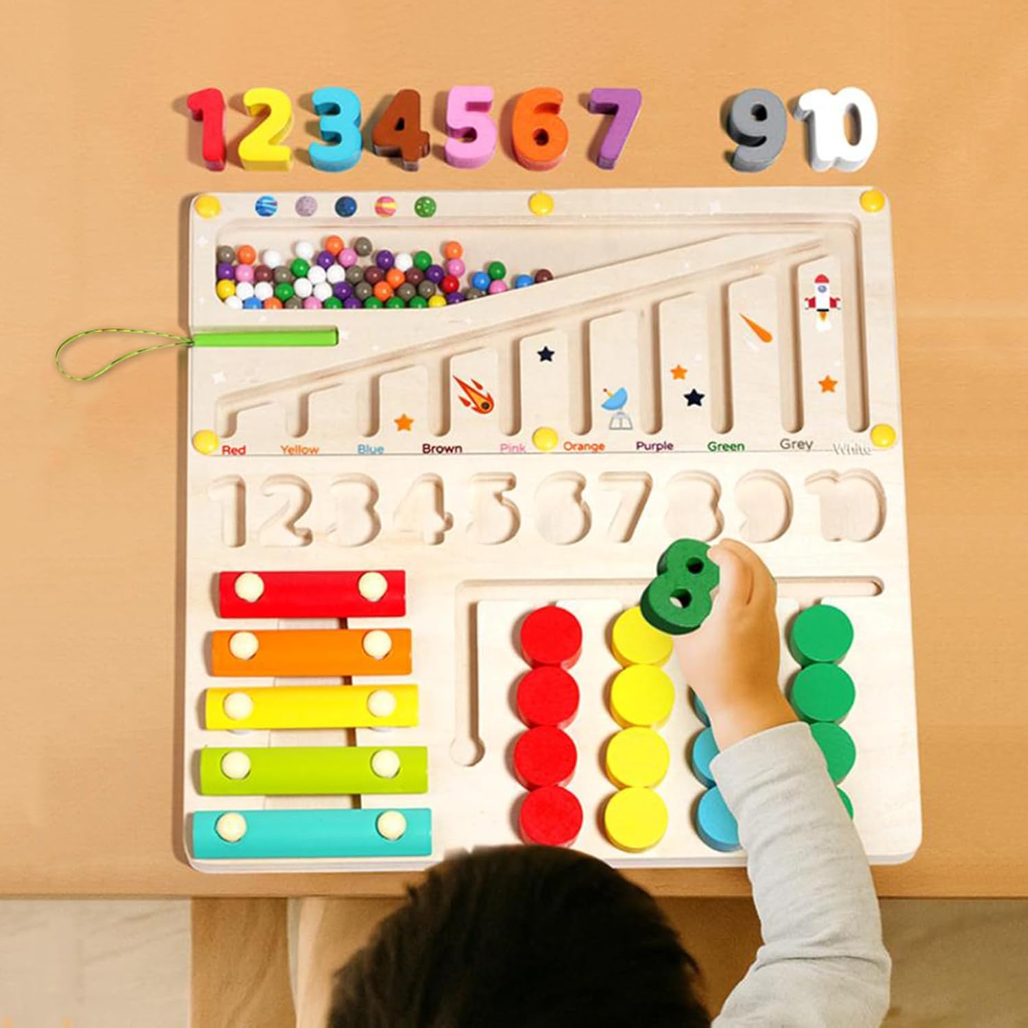 Design Strutturale Robusto: La costruzione con pannelli ispessiti e profili arrotondati assicura durabilità a lungo termine e interazione di gioco ripetuta senza usura. Regalo Raffinato: Realizzato per celebrare momenti felici come Natale, trasmette senso di cura. Offre gioia ai bambini incoraggiando l'esplorazione tattile e supportando lo sviluppo cognitivo con materiali naturali e stimolanti. Caratteristiche Educative: 4 modalità con attività labirinto perline, apprendimento numeri, sviluppo motricità fine ed effetti sonori coinvolgenti per un gioco istruttivo Pensiero Logico: Realizzato per migliorare il riconoscimento cromatico, nutre il pensiero logico e la coordinazione occhio-mano con esercizi di tracciamento percorsi stimolanti progettati per la prima infanzia Giocattolo Interattivo Educativo: Combinazione unica di sequenze numeriche, stimoli visivi e sonori con effetti percussivi per moduli di apprendimento diversificati, potenziando la percezione musicale durante il gioco in modo coinvolgente e intuitivo