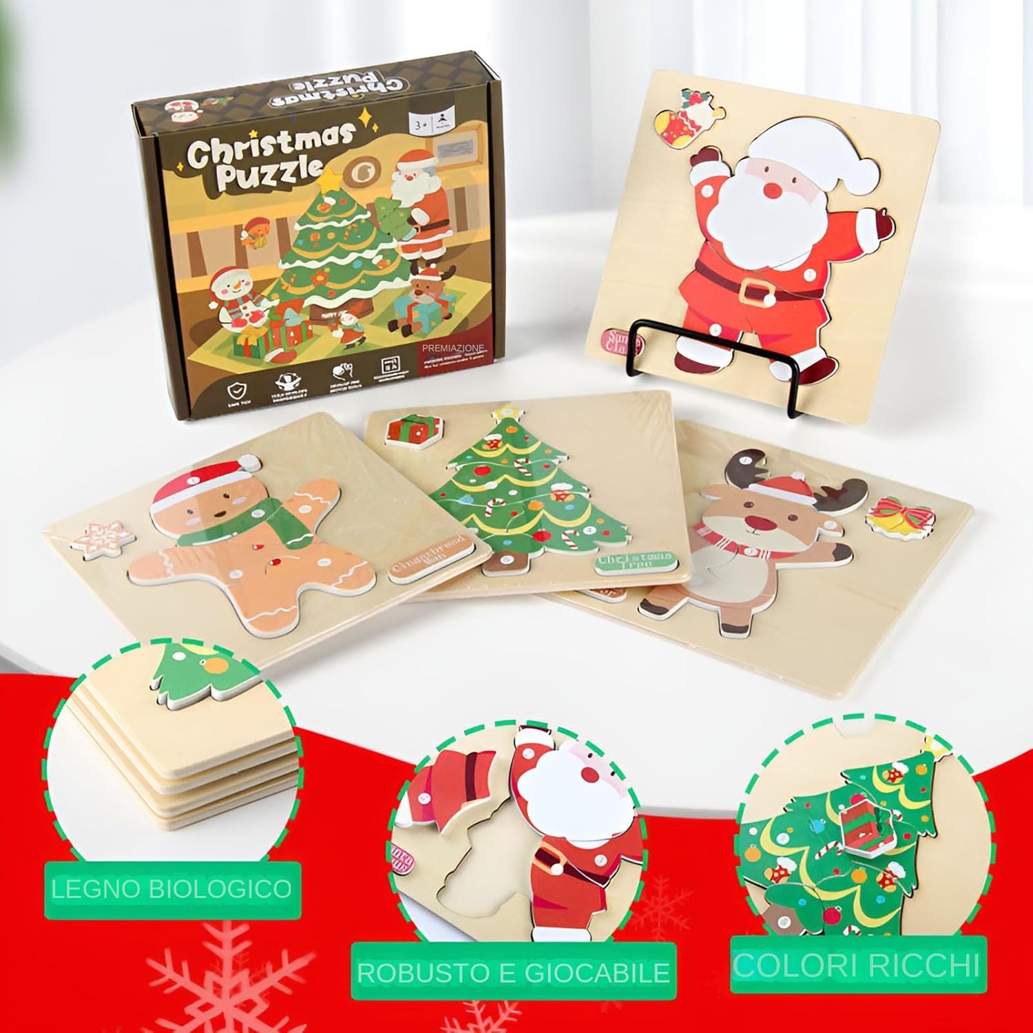 Personaggi Festivi Vibranti: Con vivaci figure natalizie e motivi stagionali che portano un'atmosfera festosa nella stanza, introducendo al contempo tradizioni di Natale care, migliorando naturalmente lo spirito di celebrazione con colori brillanti Materiale Solido e Colori Brillanti: Costruito con struttura robusta e colori resistenti sbiadimento, i pezzi del puzzle assicurano una lunga durata mantenendo una vivace visuale, per un'esperienza natalizia coinvolgente e memorabile Esposizione Natalizia: Trasforma il tuo spazio con un puzzle completato in mostra, aggiungendo un tocco di decorazione interna per creare un'atmosfera allegra e accogliente in casa durante il periodo delle festività in modo semplice e originale Attività Apprendimento Coinvolgente: Promuove lo sviluppo di competenze educative attraverso il potenziamento delle capacità di problem solving, il supporto alla crescita cognitiva e il miglioramento della coordinazione occhio-mano e del controllo motorio fine Regalo Significativo: Questo coinvolgente puzzle natalizio è progettato come un giocattolo educativo adatto dai 3 anni in su, un regalo festivo emozionante che ispira creatività e capacità di problem solving nelle giovani menti attraverso un design accattivante e a tema festivo