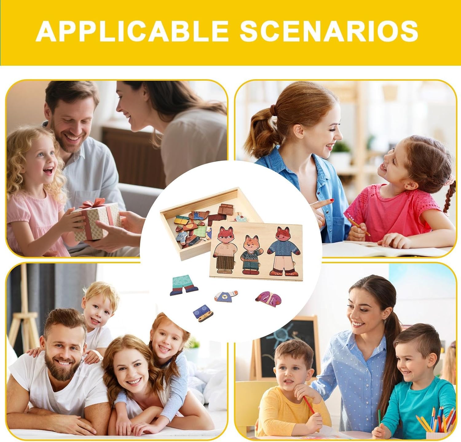 Divertimento Collaborativo di Vestire: Partecipate a giochi multiplayer creati per costruire il lavoro di e affinare la comunicazione, assegnando ruoli interattivi a genitori e bambini, favorendo connessione e creatività in ogni sessione di gioco Sviluppo motorio fine: I giochi di vestire coinvolgenti inclubordi arrotondati sicuri e incastri incorporati per incoraggiare una manipolazione divertente, aiutare lo sviluppo delle capacità motorie fini e fornire compiti facili che aiutano a costruire fiducia naturalmente Abbinamento creativo: Incentiva l'abbinamento di outfit e il riconoscimento dei colori, mentre potenzia le abilità di pensiero e la logica, attraverso giochi di vestizione coinvolgenti per il gioco creativo dei bambini Sviluppo Cognitivo: Questi giochi di vestire assistono la comprensione dei ruoli cognitivi e sociali, stimolando la curiosità con compiti progettati per l'apprendimento progressivo, che variano da semplici a complessi per sviluppo costante e naturale Regalo con Significato: Scegli i giochi di vestizione come sentito, caratterizzati da tematiche varie che incoraggiano l'espressione emotiva e aiutano a rafforzare i legami familiari durante il gioco