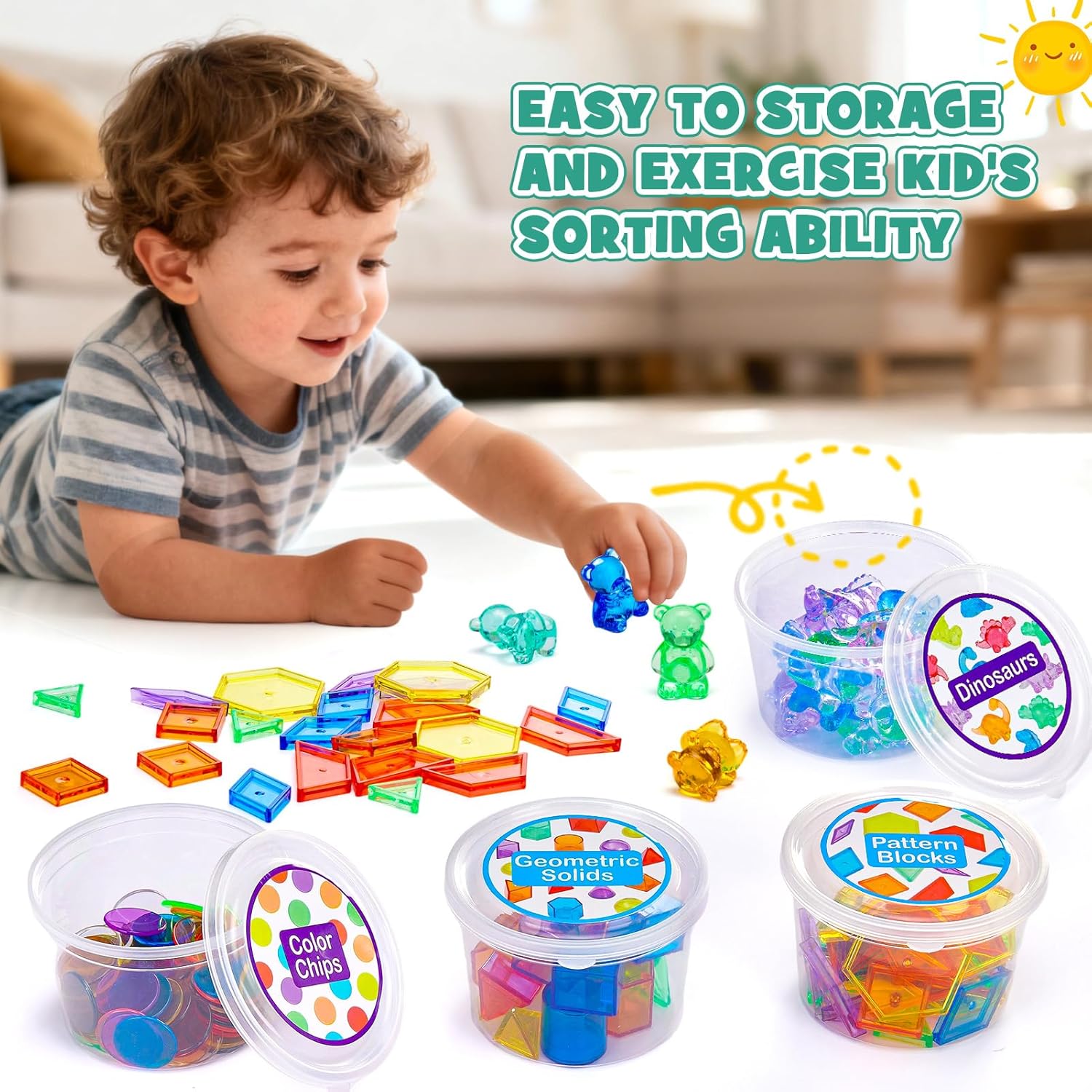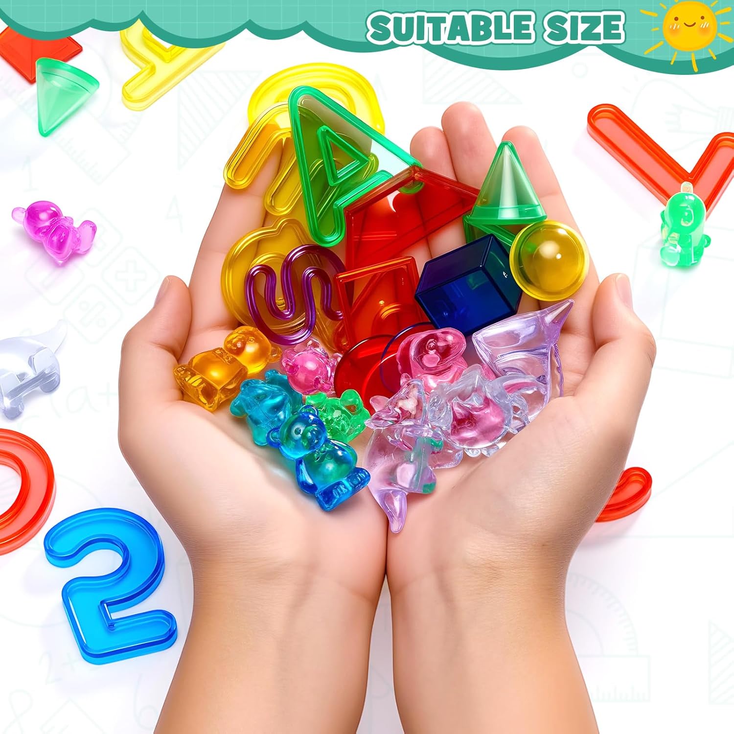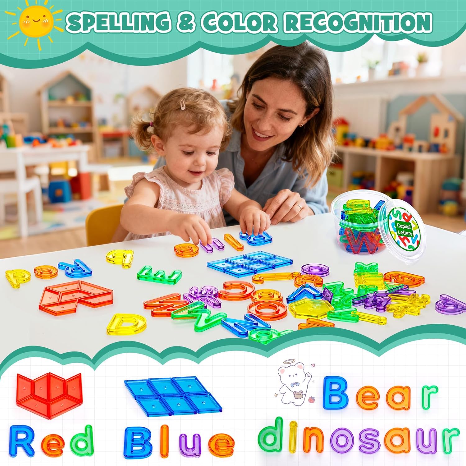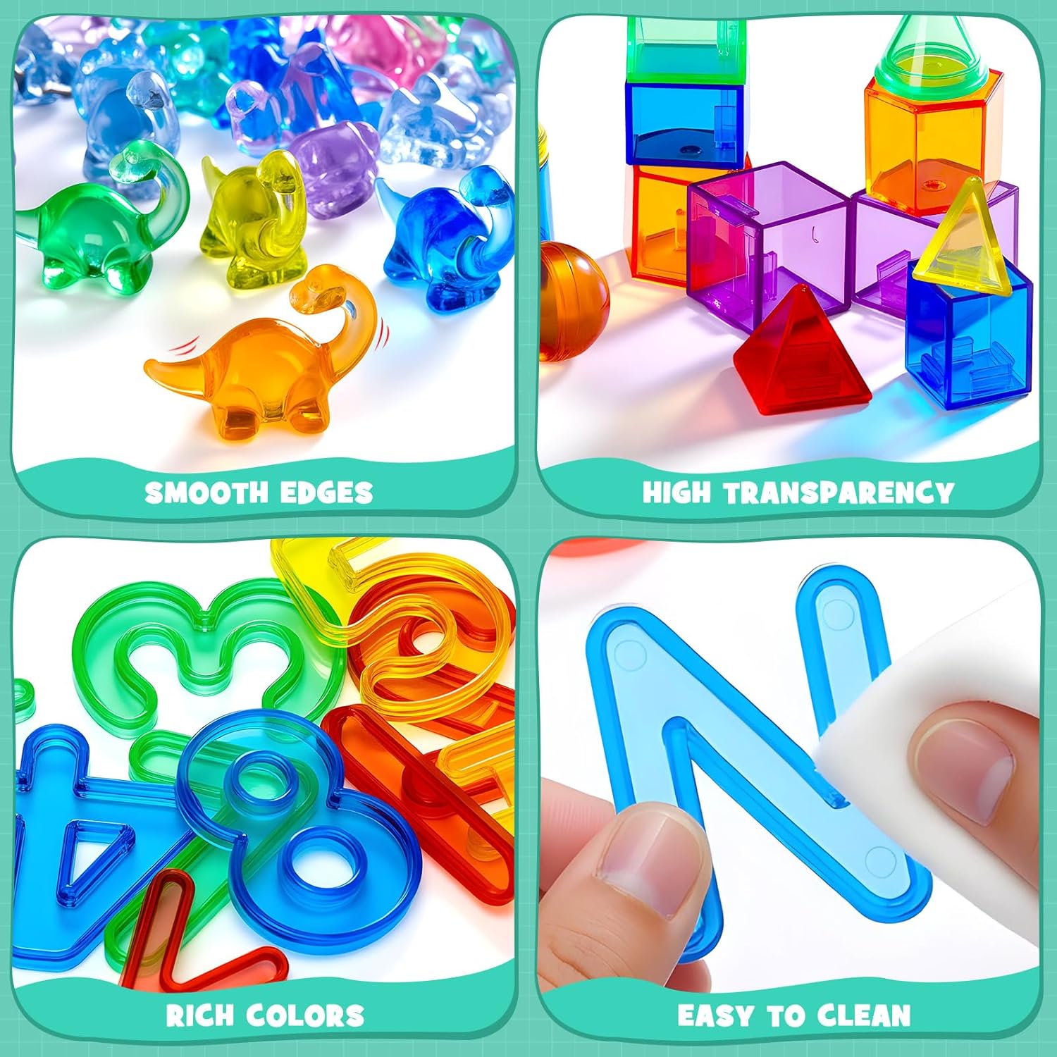 Giochi didattici 8 in 1: Questo set di giocattoli per la prima infanzia contiene 8 materiali didattici! Include 26 lettere maiuscole e 26 minuscole, 15 numeri e simboli, 100 fiches, 20 forme geometriche, 36 blocchi modello, 16 dinosauri di plastica e 30 orsetti contatori. Questo versatile gioco dell'alfabeto è perfetto per introdurre i bambini all'apprendimento delle lettere in modo giocoso ed è ideale come giocattolo Montessori dai 3 anni in su o come gioco di lettere per la scuola materna. Sviluppo completo: I bambini possono scoprire lettere, numeri, colori e forme 3D in modo giocoso ed educativo. Possono costruire blocchi modello, scrivere il proprio nome con lettere acriliche e persino capire "3 + 2 = 5" contando con i blocchi numerici. In pochissimo tempo, i bambini impareranno giocando tutte le competenze necessarie per la scuola materna. Questo giocattolo educativo è perfetto per giochi di apprendimento per bambini dai 4 anni in su, preparandoli in modo ottimale alla scuola e alla vita di tutti i giorni. Acrilico resistente: questo set è realizzato in acrilico spesso e robusto, che lo rende particolarmente resistente. I colori vivaci offrono un'esperienza visiva coinvolgente. I bordi lisci e la superficie liscia proteggono le mani del bambino. La pulizia è un gioco da ragazzi: basta rimuovere lo sporco con un panno umido. Le dimensioni sono ideali per le manine dei bambini ed è facile da afferrare. Questo giocattolo dell'alfabeto non è solo sicuro, ma è anche un ottimo esempio di giocattolo Montessori per bambini dai 4 anni in su. Ideale per bambini in età prescolare e famiglie: all'asilo, gli insegnanti possono usarlo con blocchi numerici e fiches del bingo per giochi di conteggio semplici e avanzati. A casa, tiene occupati i bambini e trasforma qualsiasi piccolo spazio in uno spazio di apprendimento divertente: è il perfetto accessorio sensoriale da scrivania. Questo giocattolo per bambini dai 2 anni in su supporta l'apprendimento dell'alfabeto, il conteggio e il riconoscimento dei colori, ed è uno strumento prezioso per gettare le basi per la comprensione di lettere e numeri attraverso il gioco. Un regalo che i bambini adoreranno: questi giocattoli dell'alfabeto sono disponibili in un pratico mini barattolo facile da riporre dopo il gioco, incoraggiando buone abitudini di conservazione. Questi giocattoli per l'apprendimento dell'alfabeto sono educativi e rappresentano un ottimo regalo di compleanno o un aiuto per esercitarsi con la matematica per i bambini. Che sia come sostituto di Scrabble Junior o come giocattolo Montessori, questo set è un must per ogni famiglia alla ricerca di un gioco di lettere di alta qualità o di un giocattolo educativo.