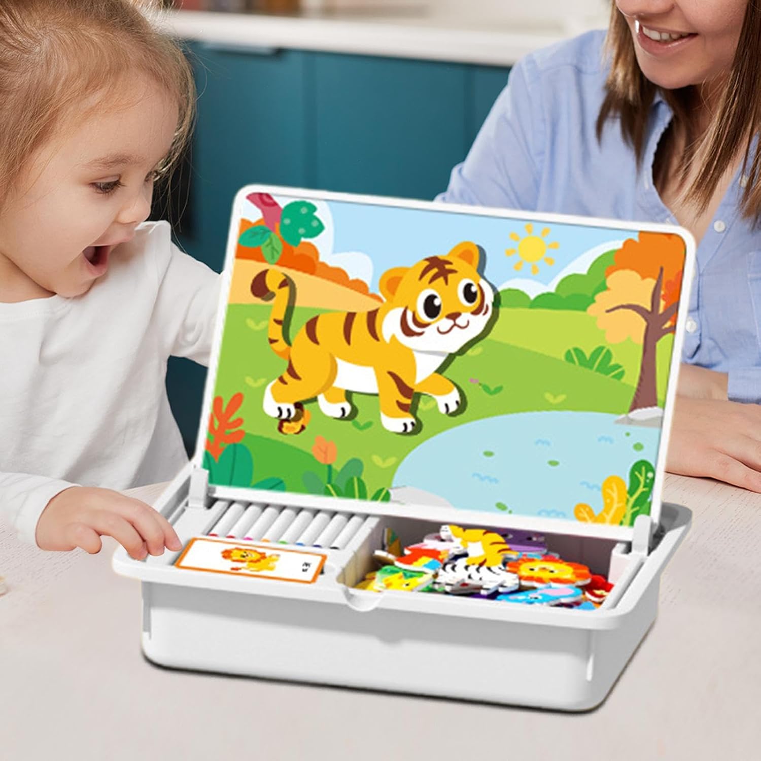 Sviluppo Artistico: Il puzzle magnetico di vestiti cattura l'interesse con opzioni di acconciature, abiti e per combinazioni infinite, stimolando il pensiero creativo e ideale per giochi di gruppo o esplorazione individuale Gioco creativo educativo: Questo magnetic puzzle game offre ore di esplorazione creativa per bambini, potenziando l'esperienza di apprendimento in ambienti prescolari e aggiungendo gioia ad occasioni speciali come Natale o compleanni, assicurando una scelta ponderata per genitori che cercano opzioni di gioco versatili e stimolanti per lo sviluppo infantile Puzzle Magnetico Resistente: Caratterizzato da materiali ABS di alta qualità, questo gioco offre e longevità. I bordi lisci e arrotondati garantiscono una manipolazione sicura, minimizzando rischi durante l'uso. I giovani possono esplorare capacità di problem-solving in sicurezza a casa o durante attività educative Costruttore di Abilità Creative: Il gioco magnetico potenzia la coordinazione occhio-mano nei bambini stimolando conraneamente creatività e immaginazione, rendendolo strumento educativo ideale per apprendimento giocoso durante in famiglia o momenti tranquilli, assicurando che divertimento e sviluppo delle abilità avvengano naturalmente durante l'interazione con i pezzi Tavola per Esplorazione Creativa: Superfici doppie con lato stampato per combinare pattern e lato bianco per doodling, incoraggiano il pensiero innovativo e offrono ore di intrattenimento per bambini e famiglie con questo gioco magnetico educativo e creativo
