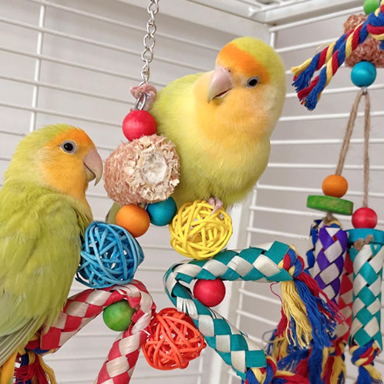 Motivi colorati coinvolgenti: Presenta colori visivamente accattivanti e forme complesse per attirare l'attenzione mentre stimola la curiosità, garantendo un ambiente arricchente e divertente per uccelli attivi che amano esplorare e giocare con giocattoli stimolanti Materiale Resistente: Realizzato in materiale PP sicuro e robusta corda di cotone, questo gioco masticabile per uccelli promuove attività di masticazione e strappo sicure che imitano efficacemente i comportamenti istintivi naturali degli uccelli, offrendo ore di divertimento stimolante e sicuro per pappagalli e altri volatili domestici Supporto Arricchimento Comportamentale: Supporta l'arricchimento comportamentale simulando azioni di foraggiamento naturale. Riduce la noia e promuove abitudini sane con coinvolgimento fisico e mentale, offrendo un modo efficace per gli uccelli occupati e stimolati in modo naturale Installazione e universale: Progettato con ganci mobili per abilitare un attacco rapido e un'installazione senza utensili, offrendo una compatibilità con una vasta gamma di voliere per uccelli. Questo versatile garantisce un'esperienza utente ottimale, consentendo ai proprietari di uccelli di concentrarsi sul divertimento e sul benessere dei loro animali domestici senza doversi preoccupare di complicate procedure di montaggio Applicazione Multiuso:Questi giocattoli masticabili usano tubi di carta colorati per soddisfare gli istinti di beccare e sminuzzare, fornendo intrattenimento multifunzionale. Mantengono il vostro amico piumato attivo e divertito, garantendo ore di stimolazione mentale e fisica grazie ai materiali vibranti e interattivi che catturano l’interesse naturale degli uccelli