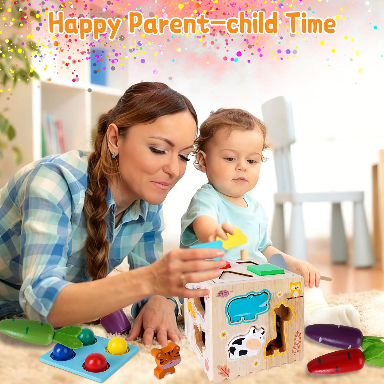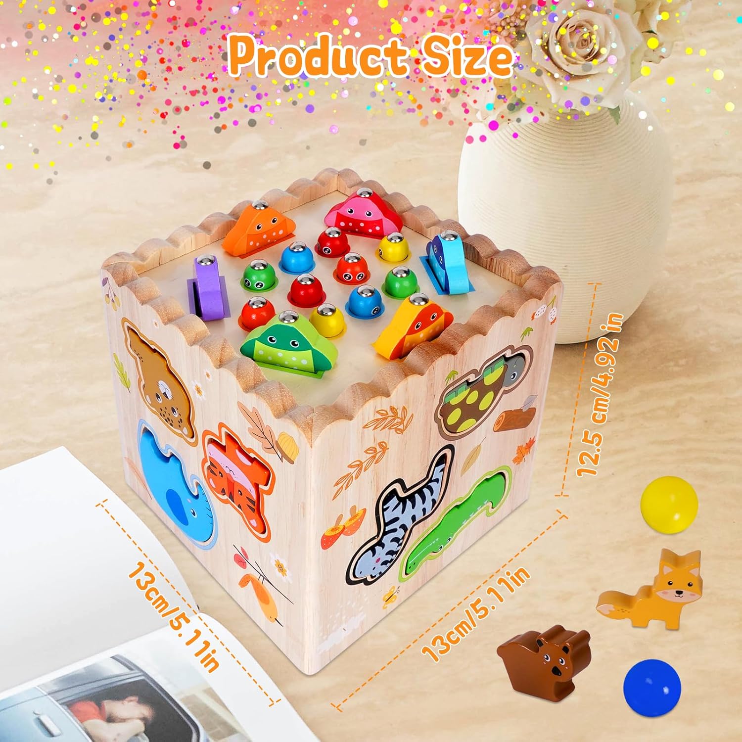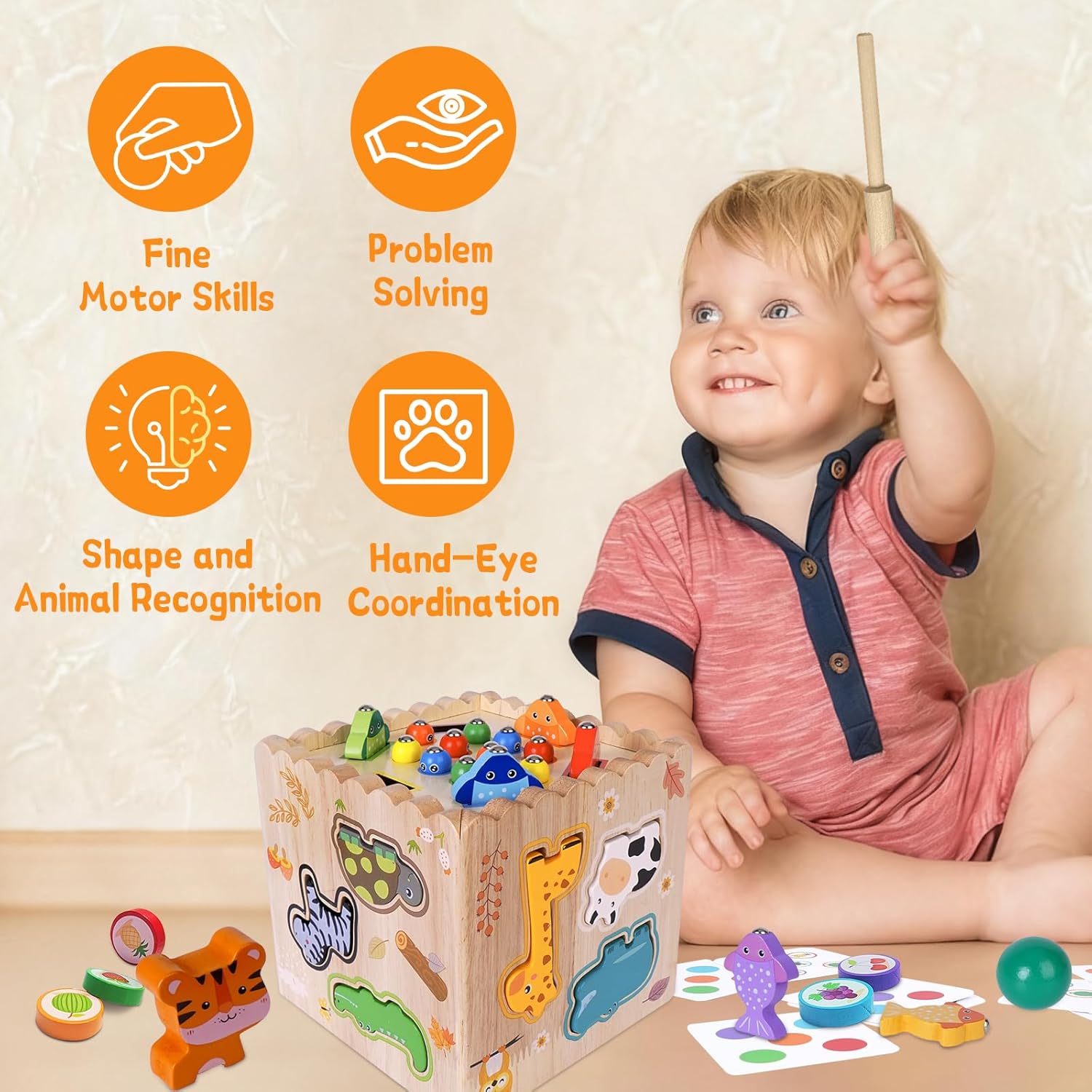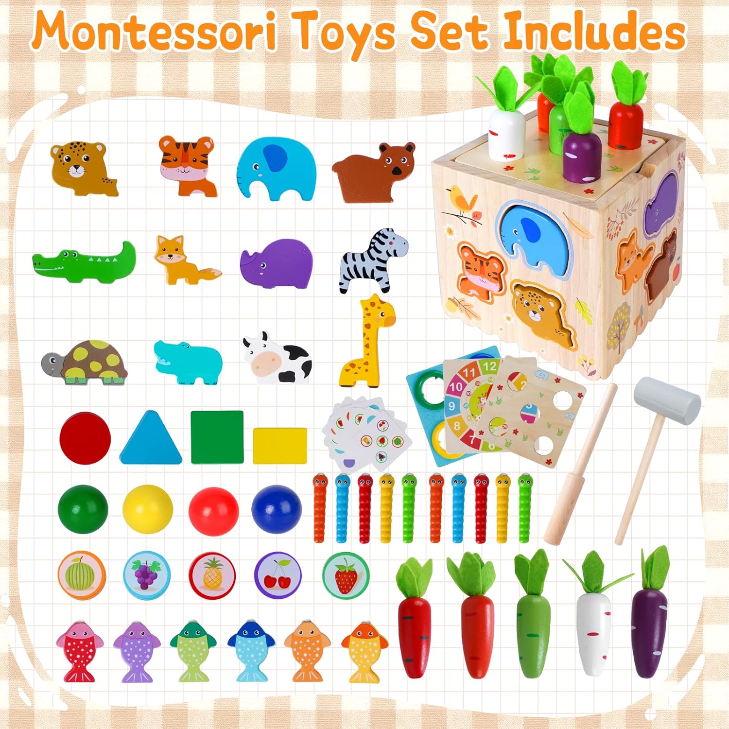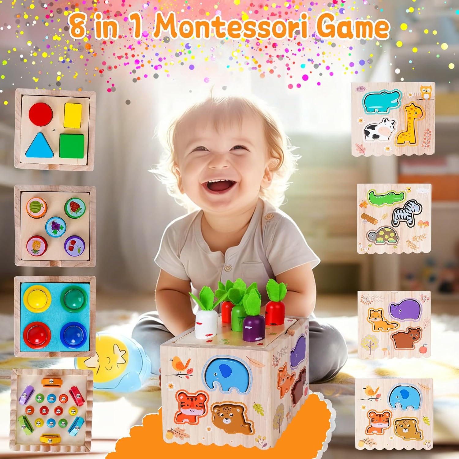 [Giochi montessori 1 anno]: Questo giocattolo in legno per la classificazione include 12 animali da fattoria, 10 simpatici vermi, 6 pesciolini di diversi colori, 5 carote, riconoscimento delle forme in diversi colori (quadrato, rettangolo, triangolo, cerchio, sfera) e un orologio con orario regolabile. I bambini piccoli possono riconoscere, classificare e abbinare diverse forme e colori. (Attenzione: contiene piccole parti - è richiesta la supervisione per i bambini di età inferiore ai 3 anni). [Gioco di impilamento 8 in 1 per bambini da 1 anno in su]: Giochi Montessori: oltre ai cinque lati della base, sono stati aggiunti tre lati aggiuntivi di forme diverse, offrendo otto modi di giocare. Lanciare palline, raccogliere vermi, raccogliere pesciolini, raccogliere carote, imparare l'orologio, abbinare animali, abbinare forme e ordinare la frutta. 8 diversi giocattoli puzzle per bambini, che incarnano la filosofia Montessori, regaleranno al tuo piccolo ore di divertimento. [Giocattoli interattivi Montessori per bambini]: Questo giocattolo Montessori per bambini presenta colori e forme vivaci e richiede un'attenta supervisione da parte dei genitori, soprattutto quando si tratta di ordinare i giocattoli per bambini di età compresa tra 1 e 3 anni. Lo slot per le carte sul lato della scatola consente di sostituire il tabellone di gioco per diverse funzioni. Aiuta a sviluppare le capacità sensoriali, motorie e di problem solving dei bambini. [Robusto e ben fatto]: Questo giochi montessori è realizzato in robusto legno naturale con una superficie liscia, è durevole e resistente allo sbiadimento, atossico, insapore e non danneggia la pelle del bambino. Tutti gli angoli sono arrotondati e privi di spigoli vivi. I giocattoli giochi in legno per bambini 1 anno in su soddisfano le esigenze dei bambini per un apprendimento coinvolgente e le aspettative dei genitori in termini di sicurezza e qualità. [Regali perfetti per bambini e bambine]: Se stai cercando un regalo fantastico per il tuo piccolo, adorerai i nostri giochi montessori per bambini da 1 a 3 anni. Sono perfetti per tutte le occasioni: feste, compleanni, festività, Pasqua, Natale e altro ancora. Questo set da gioco progettato con cura non solo offre intrattenimento, ma incoraggia anche l'apprendimento e la crescita, esplorando le capacità motorie fini e dimostrando curiosità.. Un ottimo giocattolo per bambini da 1 anno in su.