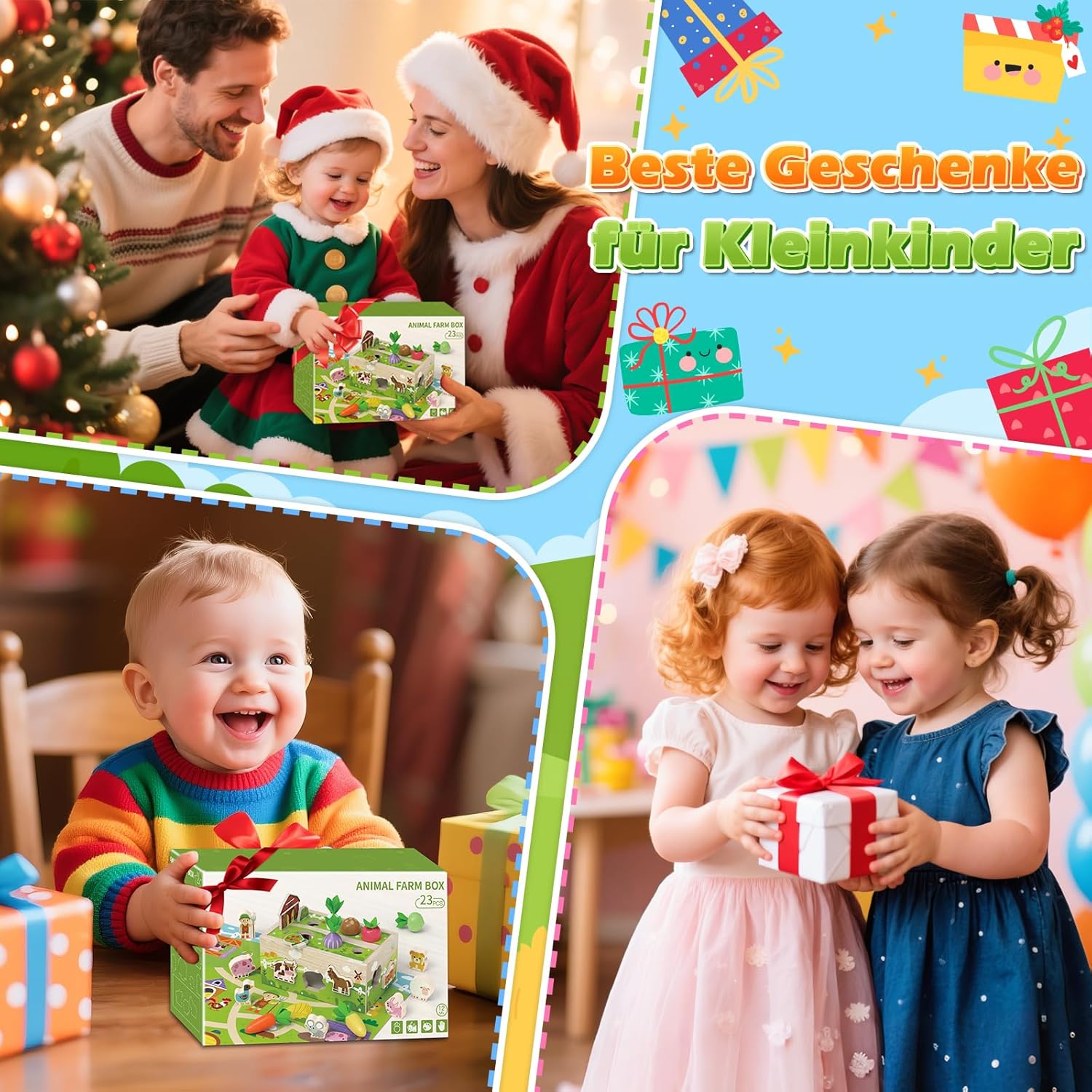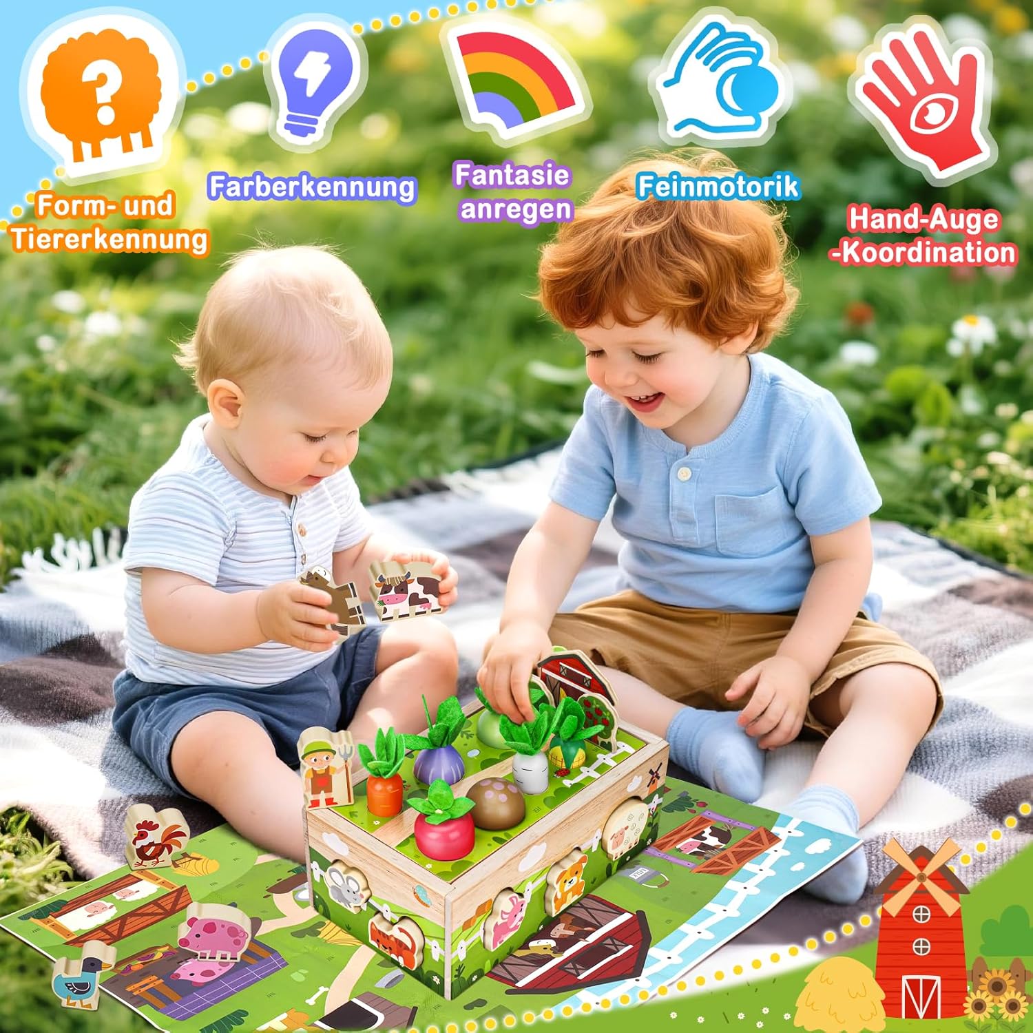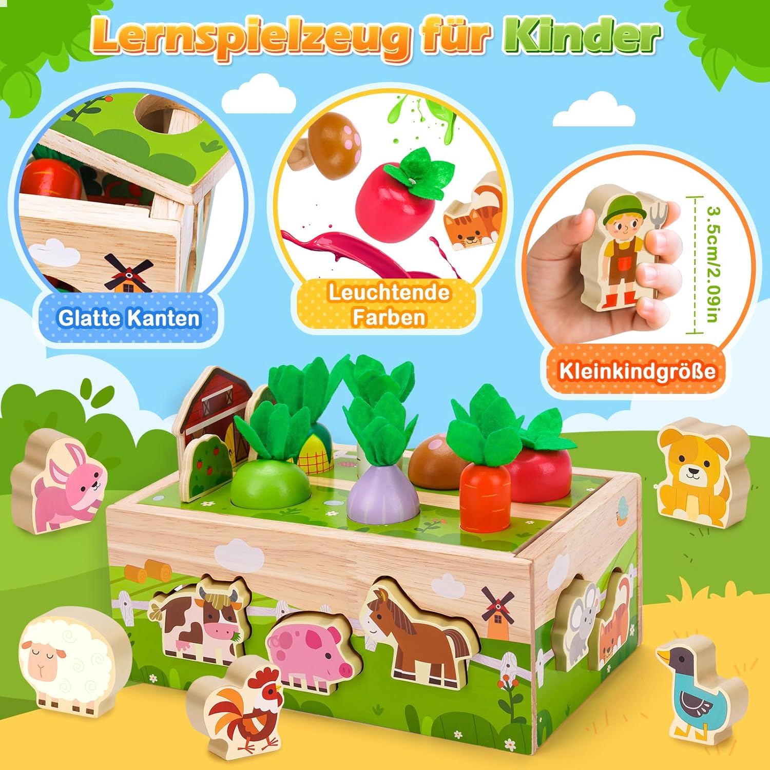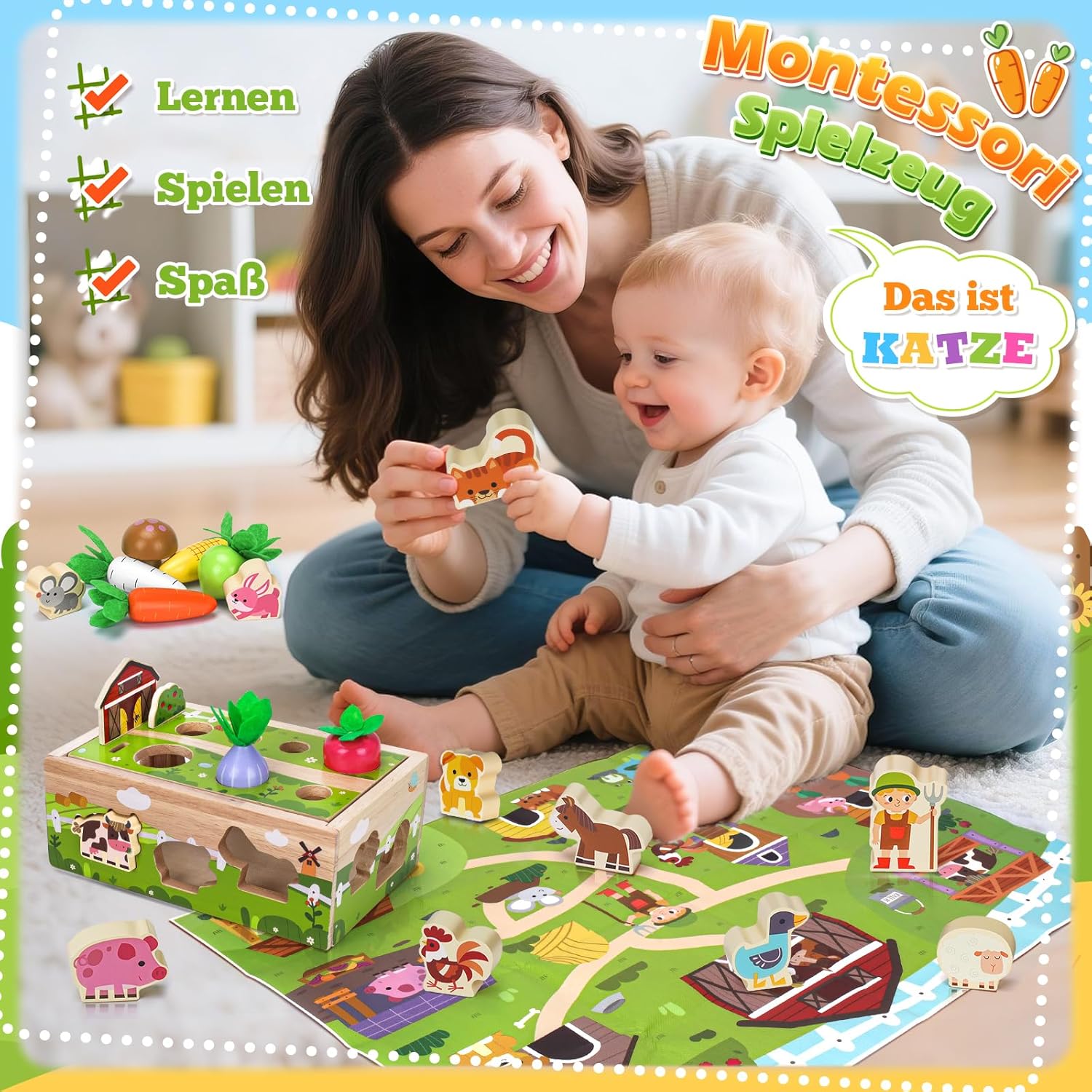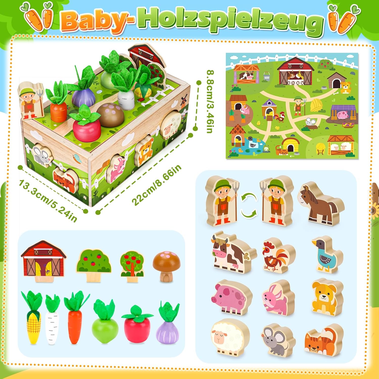 Giocattoli Montessori bambini 1 anno in su: Questo giocattolo legno progettato bambini 1 2 3 anni. Include una robusta base in legno, un personaggio contadino, una casa, 2 alberi, 7 graziose forme di verdure, 11 colorati animali della fattoria e un tappeto gioco a tema fattoria. Questo colorato giocattolo per le capacità motorie aiuta i bambini a imparare in modo giocoso a ordinare frutta e animali e ad abbinare i colori, rendendolo il regalo perfetto per bambini e bambine STEM - Giocattoli educativi per bambini piccoli: questo giocattolo per bambini offre una varietà di opzioni di gioco, come piantare verdure, abbinare forme di animali, lanciare monete e forme e identificare colori e animali. Questo gioco di ordinamento per bambini da 1 a 3 anni promuove le capacità motorie fini e la coordinazione occhio-mano. Perfetto per i bambini dai 12 ai 18 mesi per promuovere lo sviluppo cognitivo in modo giocoso Divertente Gioco Raccolta in fattoria: Questo giocattolo Montessori per bambini presenta colori vivaci e una varietà di forme. Combinato con un tappetino da fattoria, permette di organizzare e abbinare gli animali, mentre i bambini si divertono a piantare alberi e raccogliere verdure in fattoria. Promuove in modo giocoso l'amicizia tra bambini e costruisce un forte rapporto genitore-figlio. Questo giocattolo educativo in legno è un regalo per bambini da 1 a 3 anni Giocattolo sensoriale: questo gioco Montessori per l'ordinamento dei colori è realizzato in legno di alta qualità, atossico e inodore, con bordi arrotondati per la massima sicurezza ed è adatto ai bambini. È un gioco di impilamento ideale per bambini da 1 anno in su e un giocattolo per bambini e bambine dai 12 ai 18 o 24 mesi Regalo perfetto per i bambini di 1 anno: questo giocattolo dai colori dell'arcobaleno, splendidamente confezionato, catturerà sempre l'attenzione del tuo bambino. Un regalo di compleanno perfetto per bambini e bambine dai 12 ai 18 mesi. Per compleanni, Pasqua, Ringraziamento, Halloween, Natale o semplicemente come giocattolo da viaggio, questo set di giocattoli non solo intrattiene, ma promuove anche l'apprendimento e lo sviluppo del tuo bambino