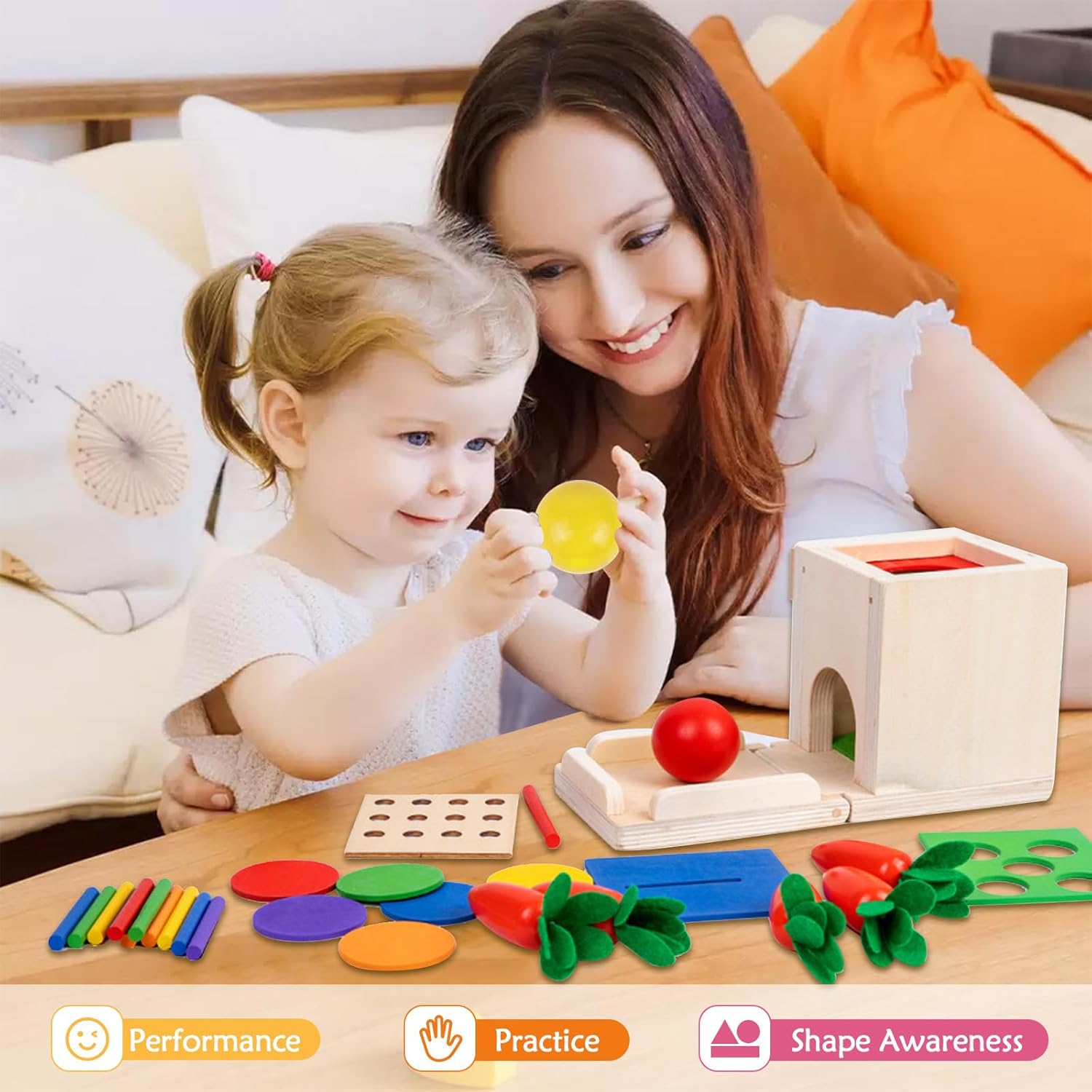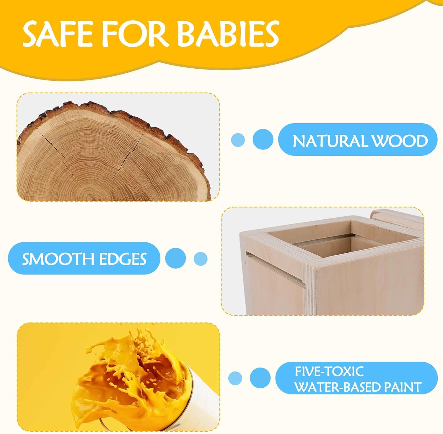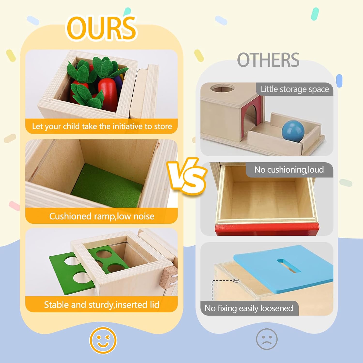 【Set Montessori 5 in 1】Questo giocattolo educativo combina 4 giochi: lancio delle palline, raccolta delle carote, abbinamento colori, inserimento monete e bastoncini, progettato per bambini 1-3 anni. 5 modalità diverse garantiscono ore di divertimento. 【Sistema educativo scientifico】Secondo i principi Montessori, con pannelli intercambiabili (4 coperchi inclusi), sviluppa la permanenza dell'oggetto, migliora coordinazione occhio-mano, riconoscimento colori e motricità fine, stimolando il pensiero logico. 【Interazione ludica】Design variopinti e pluriformi, come il gioco di raccolta carote dove vanno inserite nelle fessure corrispondenti, favorendo capacità di problem-solving attraverso il gioco di ruolo. 【Materiali naturali sicuri】giochi montessori è realizzato in legno massello con vernice ad acqua. Superficie liscia senza schegge, privo di BPA/piombo e altre sostanze nocive, totalmente sicuro per la pelle delicata. 【Design ripiegabile】Il nostro cubo multiattivita è richiudibile - tutti i pezzi si ripongono nella scatola. Chiudendo la "porta" e fissandola col bottone laterale, tutto rimane in ordine, insegnando al bambino a riordinare facilmente.
