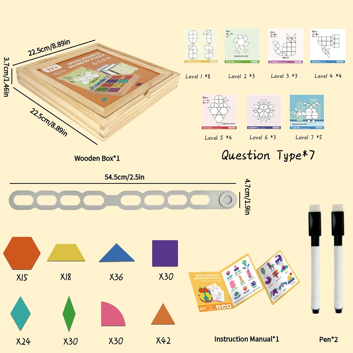 【Punti Puzzle a Forma Geometrica Magnetica in Legno】 Il set di puzzle di forma contiene 15 esagoni, 18 trapezoidi isosceli, 24 parallelogrammi, 30 quadrati, 30 forme di ventola, 30 diamanti, 36 triangoli di isoscele, 42 triangoli di iSoscele, 30 domande interrogative, 20 pagine di manuali, 2 pens e una scatola di fissaggio 【Introduzione ai Materiali】 La scatola del puzzle è realizzata in legno di betulla, con bordi lisci e durevoli. I pezzi del puzzle sono dotati di proprietà magnetiche e possono essere attaccati direttamente alla scheda artistica per un facile utilizzo. La fascia elastica grigia fuori dalla scatola di legno viene utilizzata per evitare che la copertura di legno cada. La scheda problematica e il manuale di istruzioni sono stampati chiaramente, quindi usalo con fiducia 【Il Modo Interessante per Giocare】 I giocattoli del puzzle a forma magnetica possono essere assemblati in varie forme sulla lavagna e dipinti con una penna cancellabile. Puoi anche posizionare la scheda di scena sulla lavagna e quindi posizionare il pezzo del puzzle sulla posizione corrispondente della scheda scena. I puzzle di forma sono colorati e vari e i bambini possono trasformare la loro immaginazione in forme contabili 【Selezione Regalo】 Il set di puzzle magnetico può essere trasportato in giro, adatto per il gioco interno ed esterno. Questo set di giocattoli magnetici può essere utilizzato come assistenza didattica per la casa e la scuola ed è anche un regalo per festività speciali e occasioni come la giornata per bambini, il Natale, il Ringraziamento e le feste che portano felicità e sorprese ai bambini 【Precauzioni】I pezzi del puzzle in questo set di giocattoli magnetici puzzle possono essere attaccati al coperchio del frigorifero per mostrare l'immaginazione dei bambini. Durante il trasporto, i pezzi del puzzle sono urtati e possono causare uno spostamento, ma ti preghiamo di essere certo che il numero di pezzi di puzzle è sufficiente