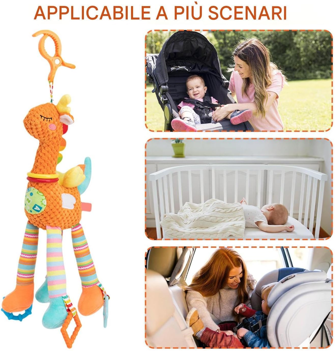 Compatibilità Versatile: Offre divertimento rilassante e intrattenimento coinvolgente con montaggio semplice su passeggini, seggiolini auto e lettini, soluzione pratica per tranquillità durante viaggi o relax Pensiero Premuroso: Scelta attenta per feste e compleanni, questi pratici giochi per passeggino bei momenti come regalo per persone care, familiari e amici nella tua vita Funzionale e Educativo: Il design a rotazione completa permette al sonaglio da passeggino di girare delicatamente con la brezza, creando melodie che stimolano lo sviluppo uditivo e visivo del neonato, promuovendo l'esplorazione sensoriale durante l'attività ludica. Rilassamento Sofficante: Il design accattivante del cervo attira l'attenzione dei contribuendo a rilassarli durante passeggiate e viaggi con il suo effetto rassicurante Materiali Sicuri: Realizzati in peluche morbido e imbottitura in cotone PP resistenti ai morsi, garantiscono sicurezza e durata nel per il tuo bambino durante l'utilizzo