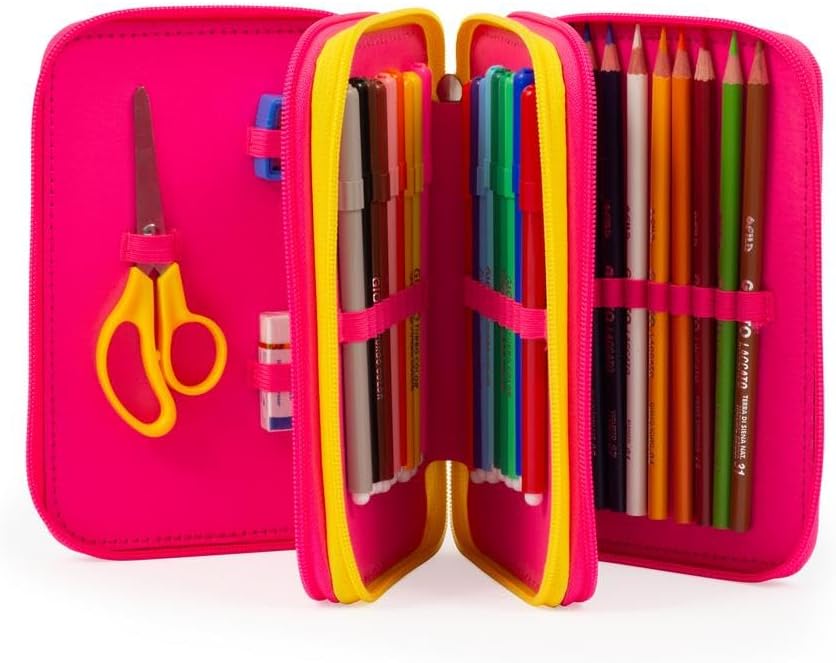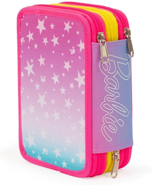 L'astuccio triplo Barbie contiene 18 matite colorate, 18 pennarelli, 1 penna a sfera blu, 1 penna a sfera rossa, 1 matita, 1 gomma, 1 righello, 1 temperino, 1 paio di forbici Dim. 19,5 x 13 x 6,5 cm per andare a scuola sempre alla moda e con la tua amica del cuore Barbie!