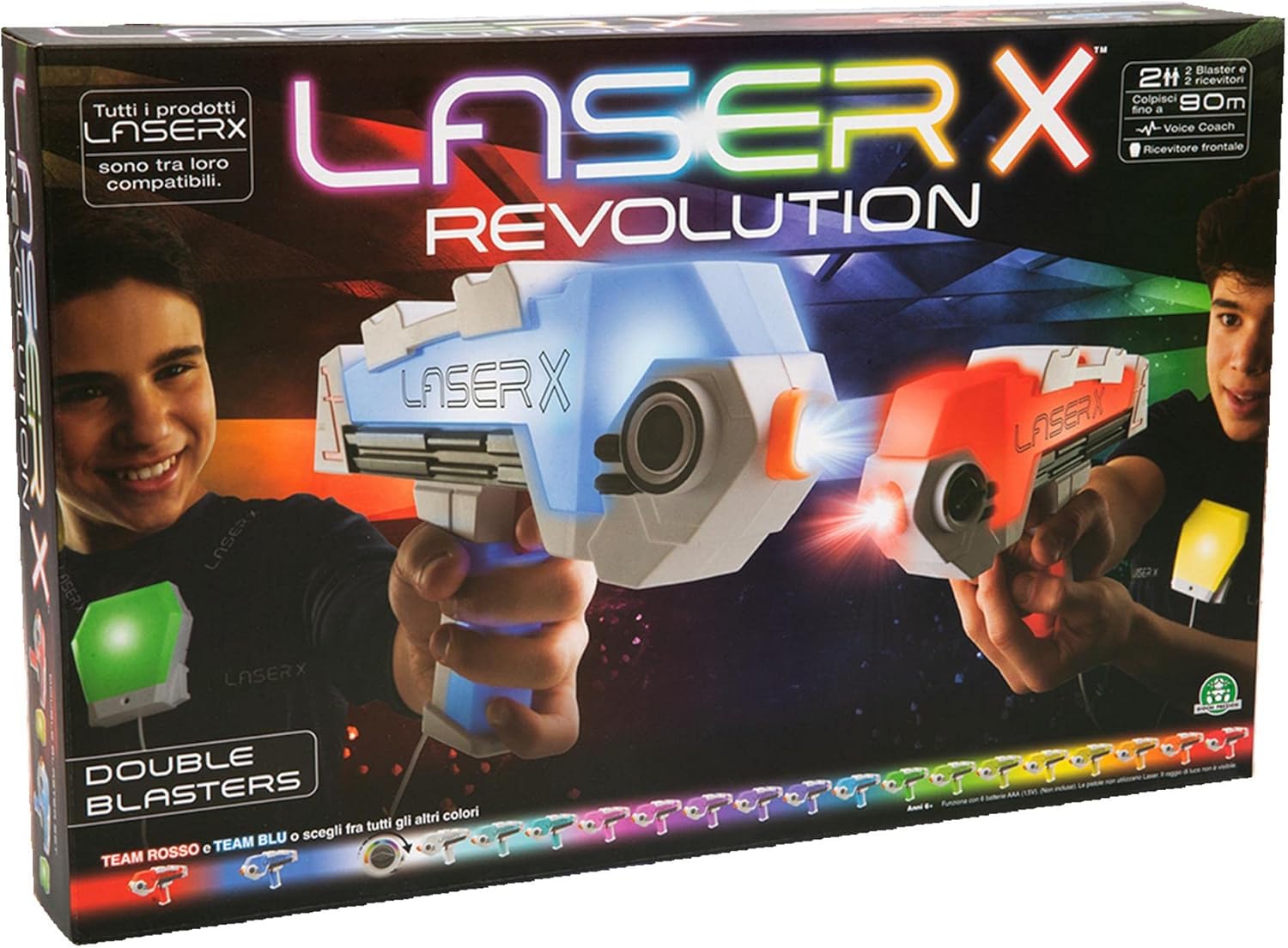 Set completo di 2 pistole laser per bambini: Il set "Laser X Revolution" comprende due pistole laser e due ricevitori, ottimi per epiche battaglie di laser tag tra amici e famiglia; Adatto per coinvolgere tutti in un'esperienza emozionante, ricreando l'atmosfera di un laser game direttamente nel comfort di casa Colpisci fino a 90 metri di distanza: Le pistole laser di questo set offrono una portata di tiro di ben 90 metri, rendendole adatte per partite sia indoor che outdoor; Questo significa che puoi giocare ovunque, dal cortile di casa al parco, e organizzare sfide su larga scala; La lunga portata permette di sviluppare tattiche e movimenti che rendono il gioco avvincente e realistico, proprio come in un vero laser tag Oltre 20 colori per la tua squadra: Personalizza l’esperienza di gioco selezionando tra oltre 20 colori diversi per identificare la tua squadra; Scegli il tuo team o gioca tutti contro tutti per un gioco sempre diverso e coinvolgente Il laser game a casa tua: Trasforma la tua casa in un’arena di laser tag grazie a questi blaster sicuri e facili da usare; Progettato appositamente per bambini, Laser X Revolution permette di vivere l’esperienza del laser game in modo pratico e coinvolgente; Con una configurazione semplice e intuitiva, il gioco può essere avviato in pochi minuti, portando divertimento immediato per tutta la famiglia Sicurezza e divertimento garantiti per bambini: Le pistole laser utilizzano un segnale infrarosso sicuro per i bambini, completamente inoffensivo per gli occhi e conforme agli standard di sicurezza; I suoni realistici di ogni sparo creano un'esperienza coinvolgente e immersiva, adatta per stimolare la fantasia e l’interazione tra bambini e adulti