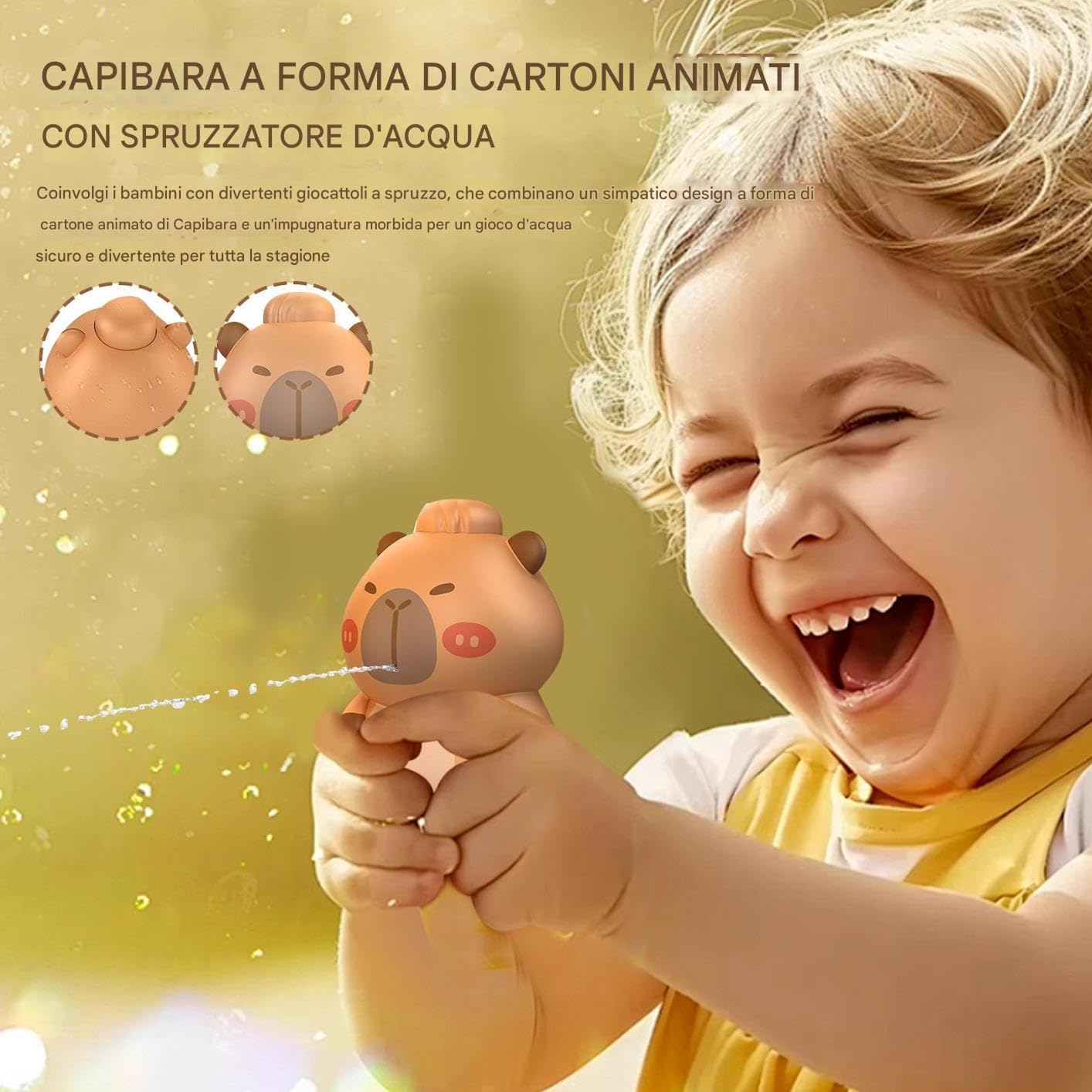 Comfort Portatile: Leggerezza e compattezza migliorano l'utilizzo in movimento, per giochi acquatici estivi con serbatoio d'acqua proporzionato che massimizza il divertimento con gestione intuitiva. Meccanismo Acqua Nascosto:Design con idrico integrato che genera una delicata nebbiolina tramite piccoli fori, arricchendo il gioco con sorprese piacevoli e intrattenimento acquatico coinvolgente Gioco protetto: Soddisfa gli standard sicurezza giocattoli, offre superfici morbide, bordi arrotondati e struttura sicura per momenti di gioco piacevoli e senza rischi. Companion : Progettati per scherzi in compagnia, divertimento familiare e momenti estivi memorabili, sono alleati ideali per lezioni di nuoto e attività ricreative in giardino Compagno Estivo: Coinvolgi i bambini con giocattoli spruzzo divertenti, unendo un simpatico design a cartone animato di capibara e un'impungatura morbida per giochi d'acqua sicuri e piacevoli tutta la stagione