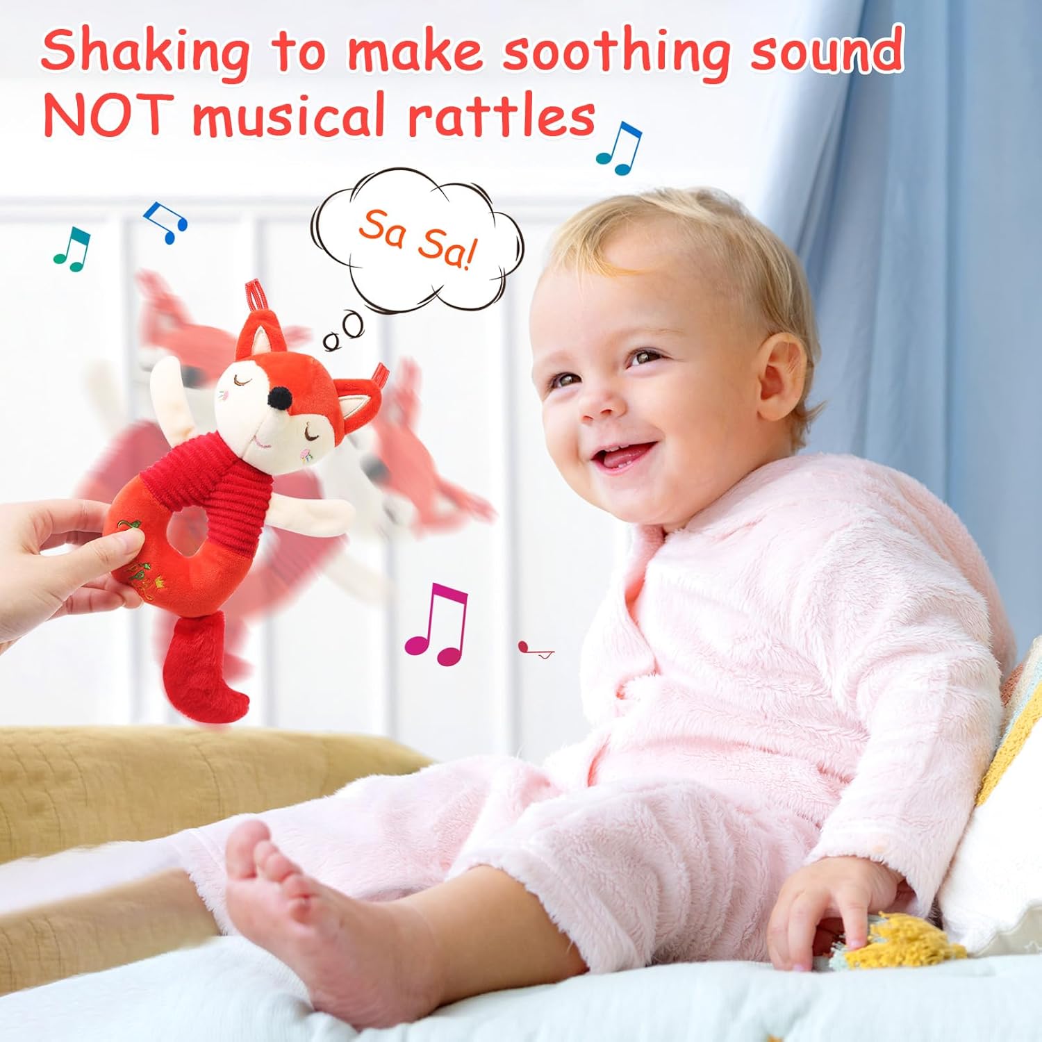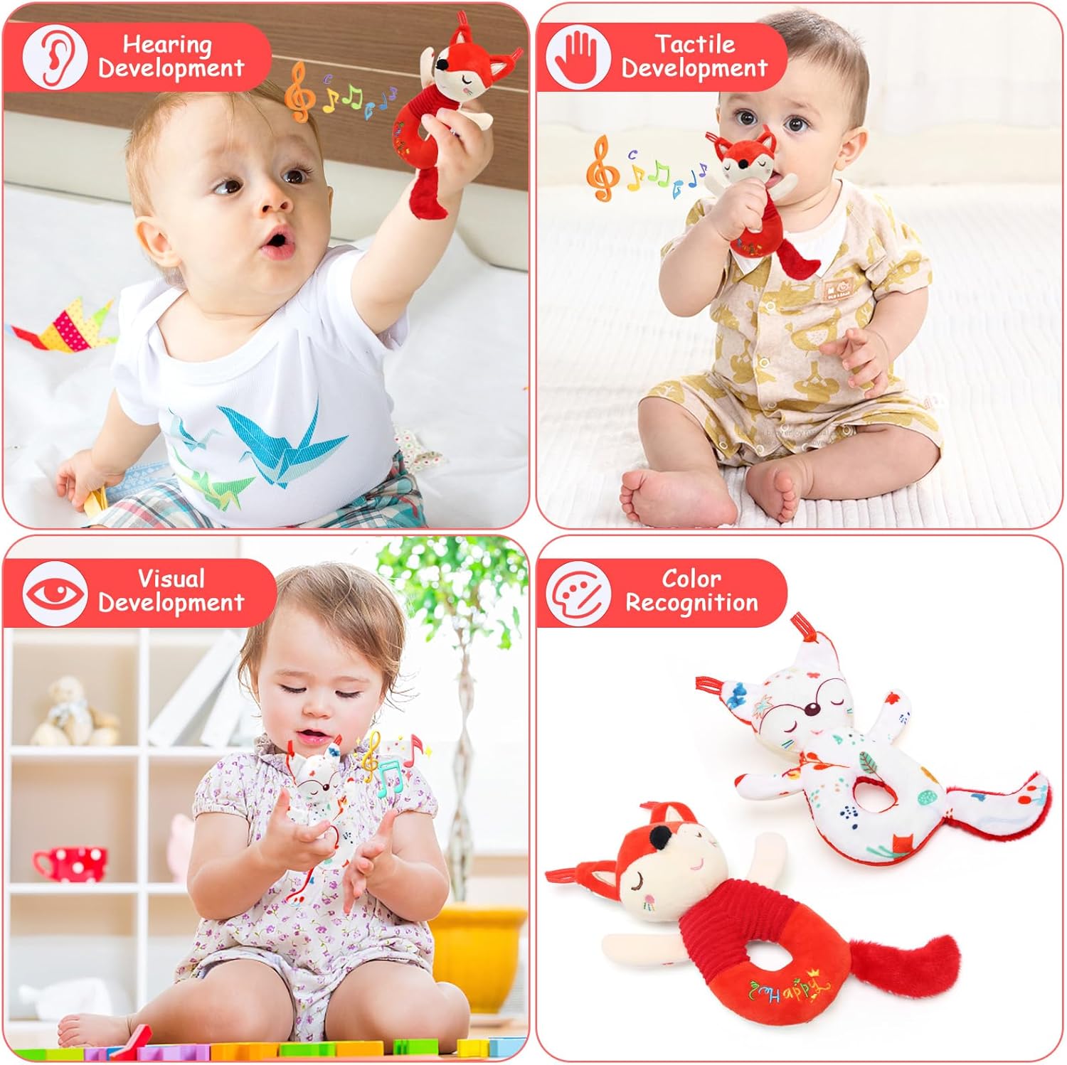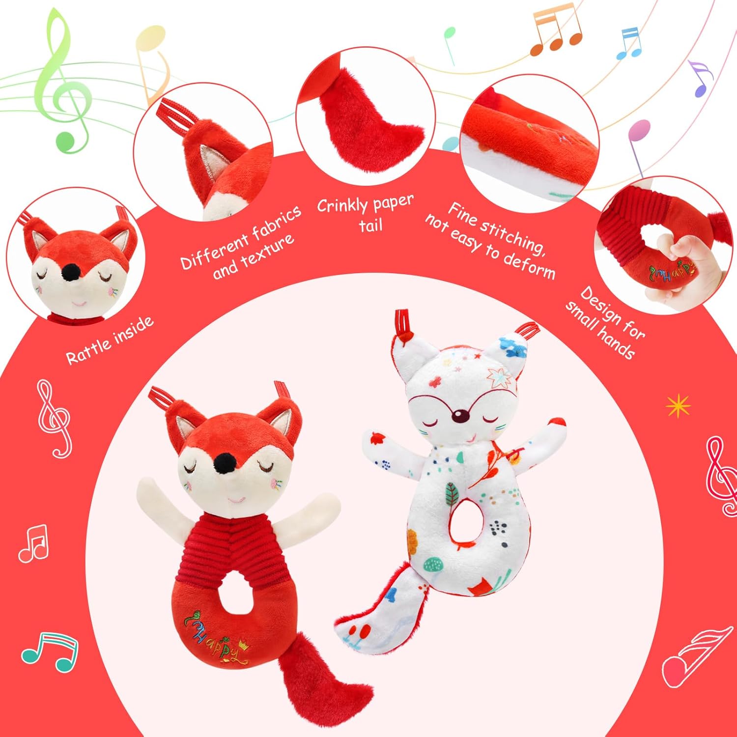 Giocattoli Sonaglio per Bambini a Doppia Faccia a Forma di Volpe - 2025 Nuovi sonagli di peluche per bambini da 0 a 12 mesi, realizzati in tessuto di velluto di cristallo con imbottitura in cotone PP, superfici morbide per la dentizione, design atossico e multi-texture, suono rilassante e carta stropicciata incorporata, materiale sicuro per la pelle dei bambini, che dona loro una sensazione morbida e confortevole. Giocattoli Educativi per Neonati - L'adorabile design a forma di volpe catturerà facilmente l'attenzione del bambino, i colori vivaci incoraggiano il tracciamento visivo, la coda frusciante e le orecchie a nastro stimolano l'esplorazione tattile, il suono rilassante del sonaglio quando si scuote sviluppa le capacità motorie e uditive. I giocattoli didattici per bambini a forma di volpe sviluppano la stimolazione sensoriale dei neonati, li tengono intrattenuti per ore e portano molto divertimento. Ispira il Bambino ad Afferrare - La dimensione ideale del design circolare in peluche è facile da afferrare per il bambino, illumina la capacità di percezione del bambino. È leggero e piccolo, un ottimo giocattolo per neonati per attività all'aperto, viaggi o passeggiate, può anche essere usato come giocattolo per seggiolino auto, giocattolo per passeggino e giocattolo accessorio per culla. Compagno di Giochi per Bambini - I giocattoli per neonati non sono solo sonagli per bambini, ma solo bambole per bambini. Un buon compagno per i bambini, porta gioia, sviluppa lo sviluppo sensoriale, calma il bambino e aiuta ad addormentarsi più facilmente. Il design a doppia faccia della volpe presenta i colori rosso e bianco, equivalenti per ottenere due graziosi sonagli per bambini. Ottimi Regali per Neonati - I nostri giocattoli educativi sonaglio sono i primi sonagli ideali per i neonati come regalo di compleanno per neonati/bambini/bambini piccoli, regalo per la doccia, regalo di Halloween, regalo del Ringraziamento, regalo di Natale, regalo di Capodanno e regalo per le feste. Sono adatti per giocattoli per bambini da 0 a 3 mesi, da 3 a 6 mesi, da 6 a 12 mesi. Si consiglia di lavare a secco o di pulire la superficie con un detergente.