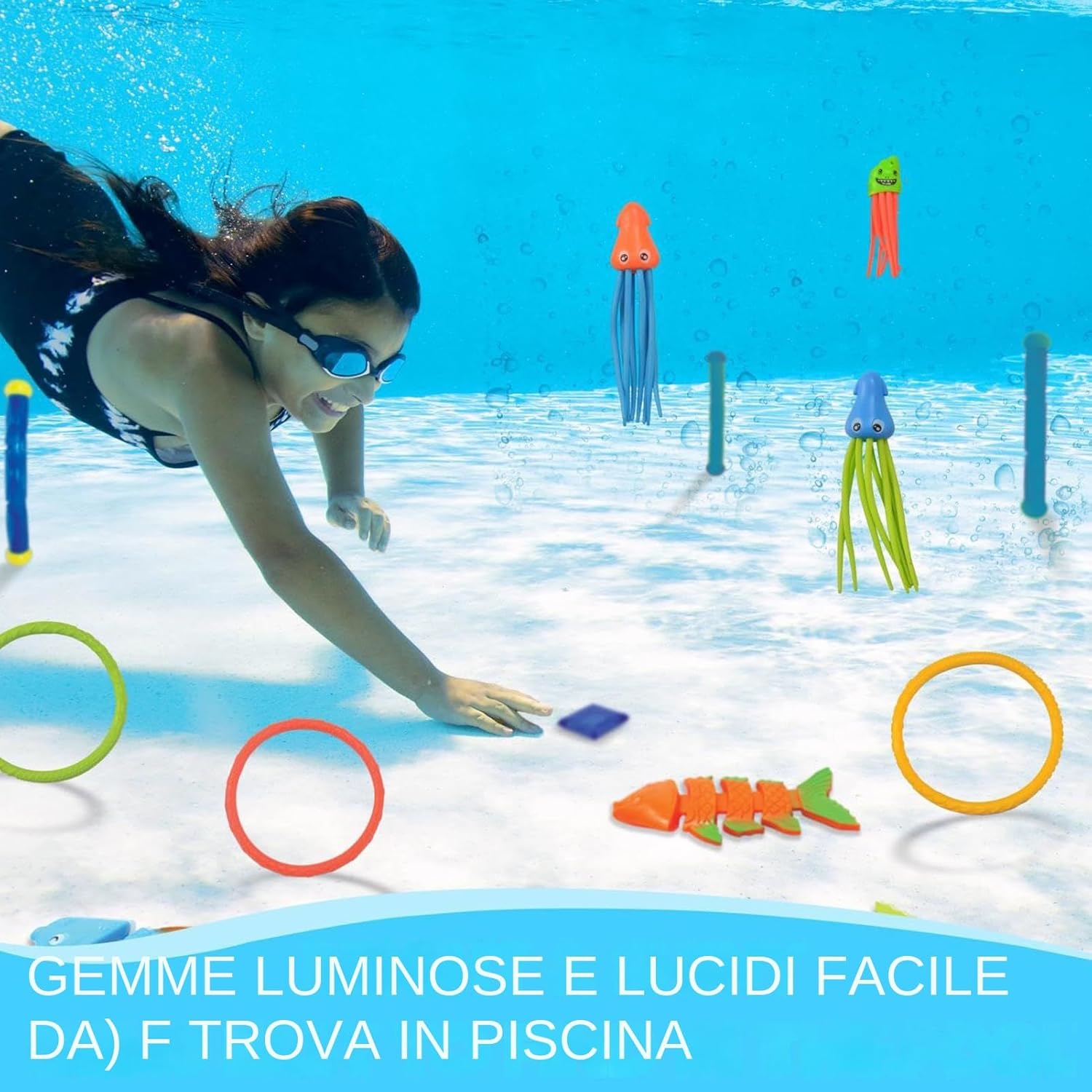 Set da 30 Pezzi Diversificati: Include vari giocattoli subacquei a tema marino che stimolano la scoperta attraverso la curiosità, offrendo giochi d'acqua multifunzione per divertimento infinito ed esplorazione durante le attività in piscina Compagni di tuffi vivaci: La miscela giocosa di tonalità accese e forme incantevoli ispirate al mare crea un'intensa stimolazione sensoriale, garantendo ore di divertimento grazie a design accattivanti e creativi che risaltano in acqua Sviluppo di abilità: Migliora la coordinazione motoria e le capacità di recupero attraverso giocattoli da piscina interattivi con strutture subacquee stabili, per un gameplay avvincente Interazione Familiare Guidata: Giochi subacquei che favoriscono momenti di condivisione attraverso modalità di gioco strutturate, promuovendo attività collaborative per rinforzare i legami emotivi tra genitori e figli con dinamiche coinvolgenti in piscina Giochi coinvolgenti: Design intelligente che si adatta perfettamente a piscine private, spiagge pubbliche e aree wellness, con componenti interconnessi per esperienze dinamiche che prolungano il divertimento estivo attraverso configurazioni sempre nuove