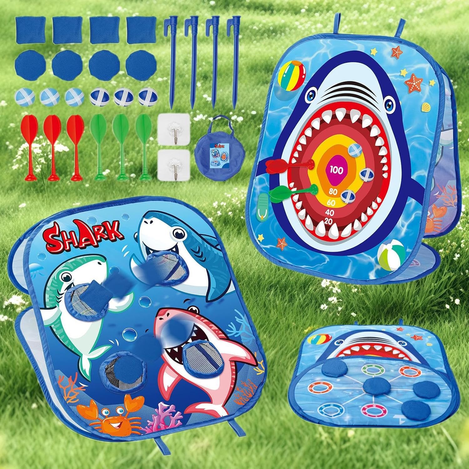 Intrattenimento flessibile: progettato per interni ed esterni, il gioco si adatta a giardino, salotto e camera da letto con facilità di trasporto e pronto all'uso in qualsiasi ambiente competitivo Sviluppo integrato: migliora la coordinazione del corpo attraverso la pratica di lancio degli obiettivi, sviluppa giocosamente il controllo della pista di lancio e aumenta la percezione spaziale e le capacità di integrazione sensoriale Esperienza di gioco senza preoccupazioni: i morbidi sacchetti antiscivolo garantiscono una presa sicura, mentre il materiale durevole garantisce un uso duraturo, così i bambini di tutte le età godono il gioco in modo sicuro senza rischio di lesioni Esperienza di gioco completa: con istruzioni illustrate e accessori di alta qualità, questo gioco di lancio consente varie formazioni, supporta l'interazione multiplayer e contiene un sacco di sabbia sufficiente per un divertimento duraturo. Design accattivante: progettato per bambini dai 3 ai 5 anni. Il concetto di colore brillante del gioco di tiro degli squali attira l'attenzione e supporta i viaggi di esplorazione giocosi.