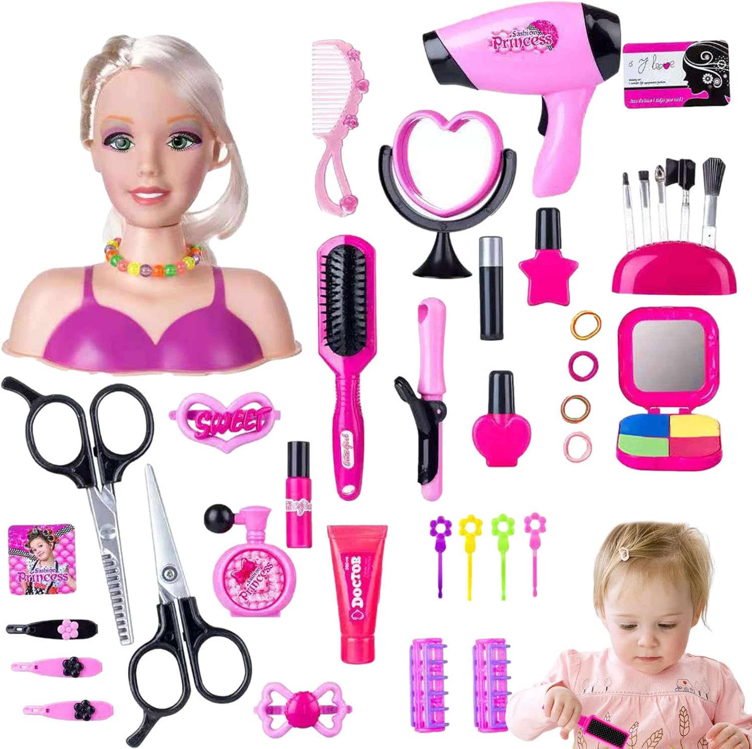 ♨Soddisfa la curiosità e impara trucco: questa testa di bambola per trucco può soddisfare la curiosità della ragazza e imparare a truccarsi. Quando la tua bambina riceve nostro kit per trucco, simula felicemente trucco. ♨Promuovi la capacità di apprendimento dei bambini: l'abilità dei bambini nel design pratico e dell'acconciatura può essere esercitata giocando alle bambole per lo styling e possono godersi l'esperienza divertente. ♨Promuove l'attenzione e la coordinazione occhio-mano: il set per trucco delle bambole è essenziale per promuovere l'attenzione e la coordinazione occhio-mano e aiutare i bambini a esplorare loro mondo ed esprimersi. ♨Comodo da trasportare: il gioco dei capelli della testa di bambola è una scatola carina, appositamente progettata per la tua bambina che può organizzare tutti i set di strumenti finti e metterli per portarli ovunque. ♨Regalo squisito: la bambola per acconciature è adatta per giochi di finzione, feste di principesse, borse per trucchi per ragazze principianti, feste, giochi genitore-figlio e un regalo perfetto per Natale e compleanni.