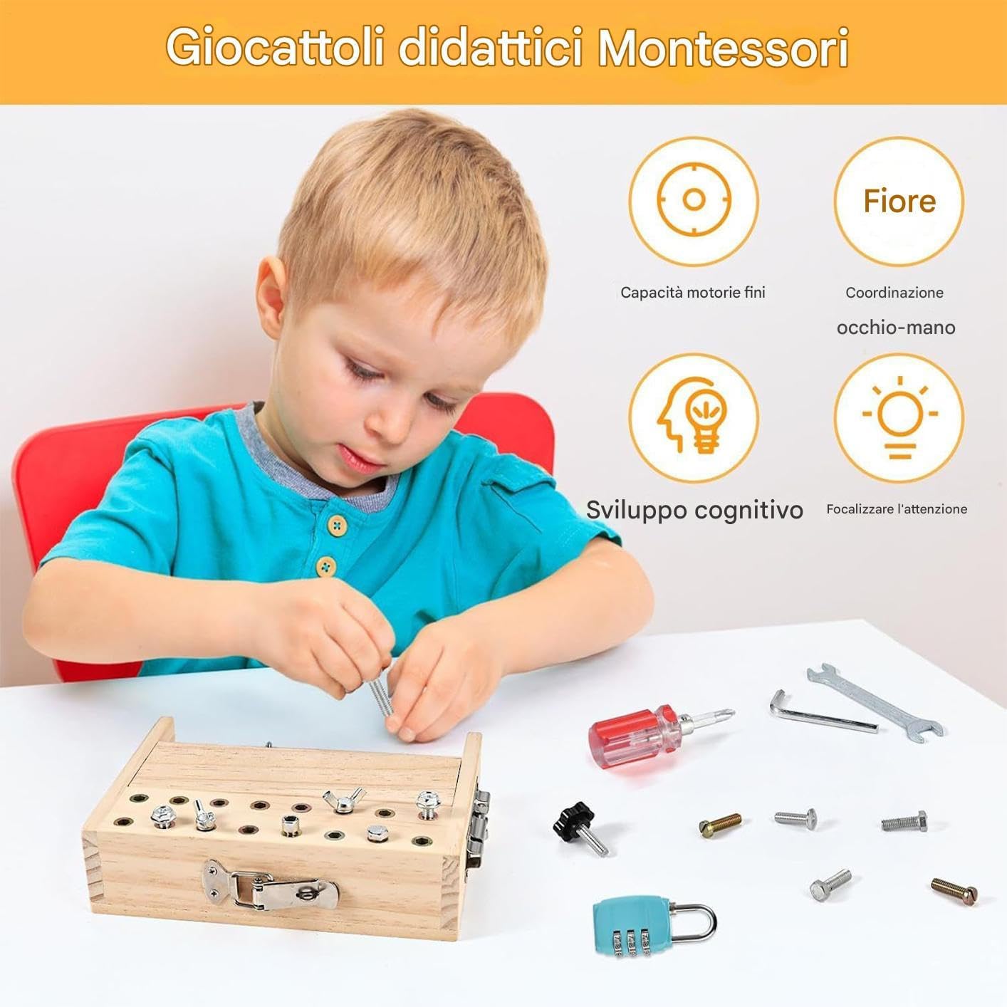 Facile da Portare: Combina portabilità e design compatto per soddisfare le esigenze di gioco in viaggio, rendendo semplice il trasporto e il riporre mentre supporta la mobilità interna per bambini Materiale Robusto: Realizzato in costruzione in legno per mantenere la forma a lungo termine e superfici resistenti all'usura, garantendo eccellente durata e integrità strutturale per valore di gioco duraturo Potenzia la Motricità Fine: Il set di cacciaviti giocattolo migliora la destrezza delle dita e supporta la coordinazione occhio-mano, con un design basato su principi che include aperture di serrature e avvitamenti per lo sviluppo di abilità nel gioco Pratico per Giocare: Lavorato con materiali naturali per una presa sicura, include bordi arrotondati e parti fisse che garantiscono equilibrio tra sicurezza e usabilità, con strumenti ergonomici a misura di bambino Regalo Ideale: Un giocattolo didattico come regalo di compleanno e ideale per le feste, crea un ricordo significativo che stimola la creatività offrendo divertimento duraturo ed esperienze di gioco coinvolgenti per bambini.