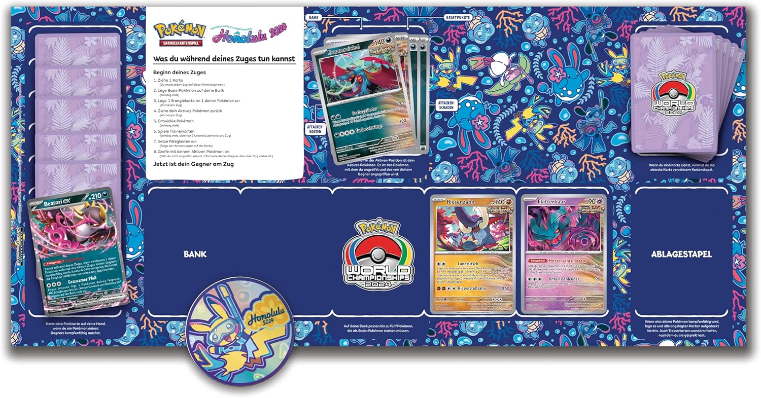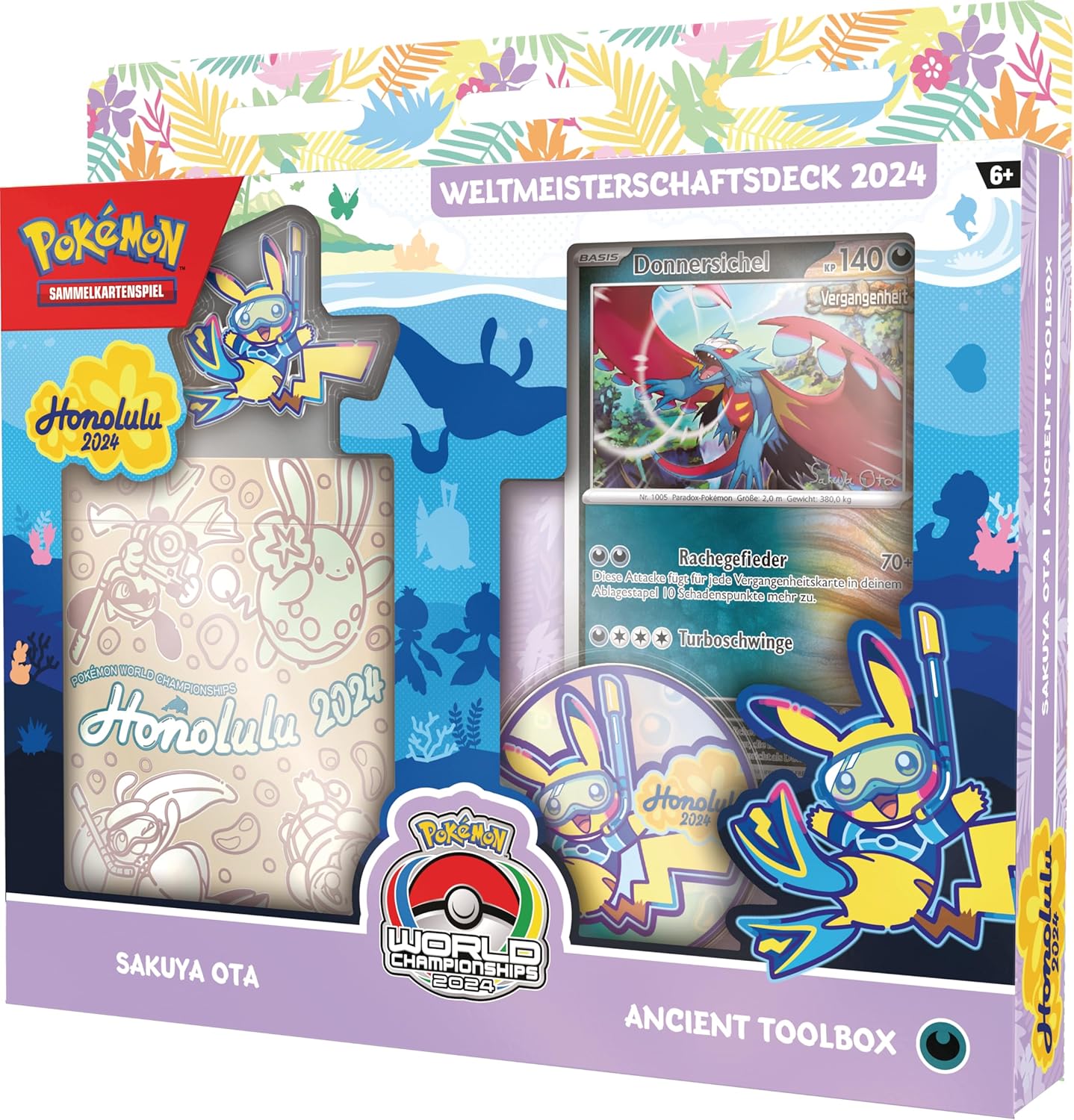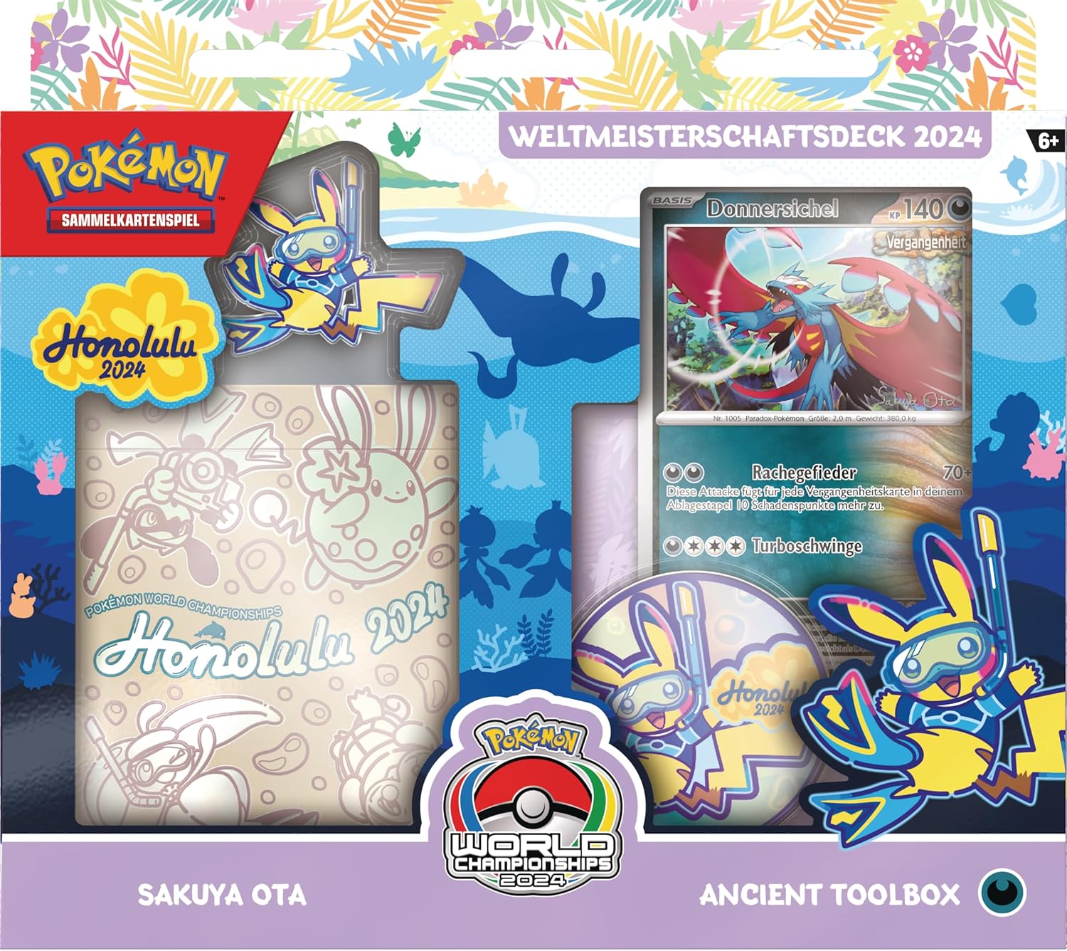 | Composants inclus | 1 carte à code pour JCC Pokémon Live, 1 jeu de 60 cartes des championnats du monde, 1 tapis de jeu et 1 affiche, cahier, broche, pièce de monnaie et boîte de rangement des Championnats du monde 2024 |