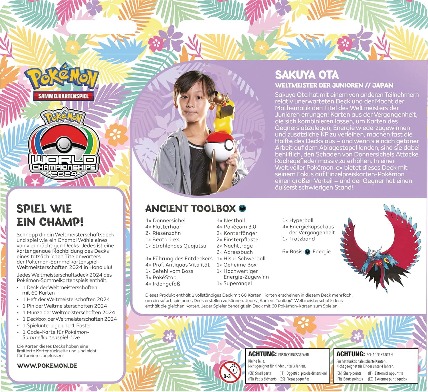 Prendi il mazzo della Coppa del Mondo di Sakuya Ota e gioca come un campionato. Questo potente mazzo di carte è una replica esatta del Gioco di Carte Collezionabili Pokémon del 2024. Questo pacchetto contiene 1 mazzo da 60 carte della Coppa del Mondo, 1 spilla speciale dei Campionati del Mondo 2024, 1 moneta della Coppa del Mondo 2024, 1 scatola da gioco, 1 tappetino da gioco e 1 poster. Riceverai anche 1 libretto dei Campionati Mondiali 2024 e 1 carta con codice del GCC Pokémon live. Le carte di questo set hanno un dorso in edizione limitata e non sono approvate dai tornei.