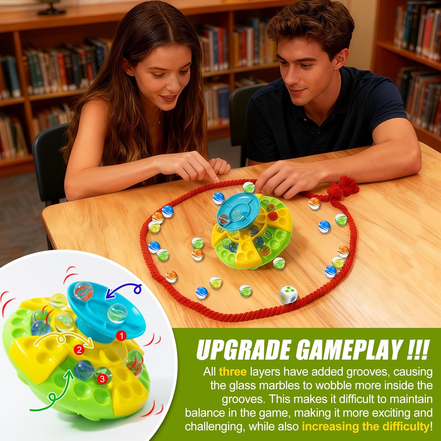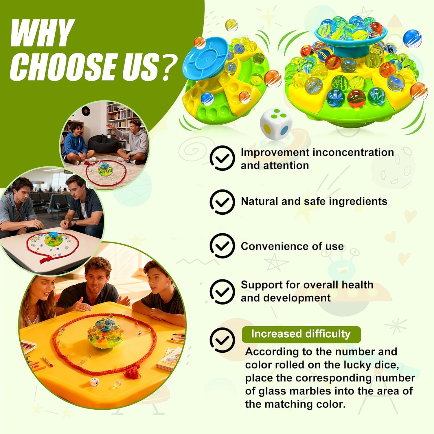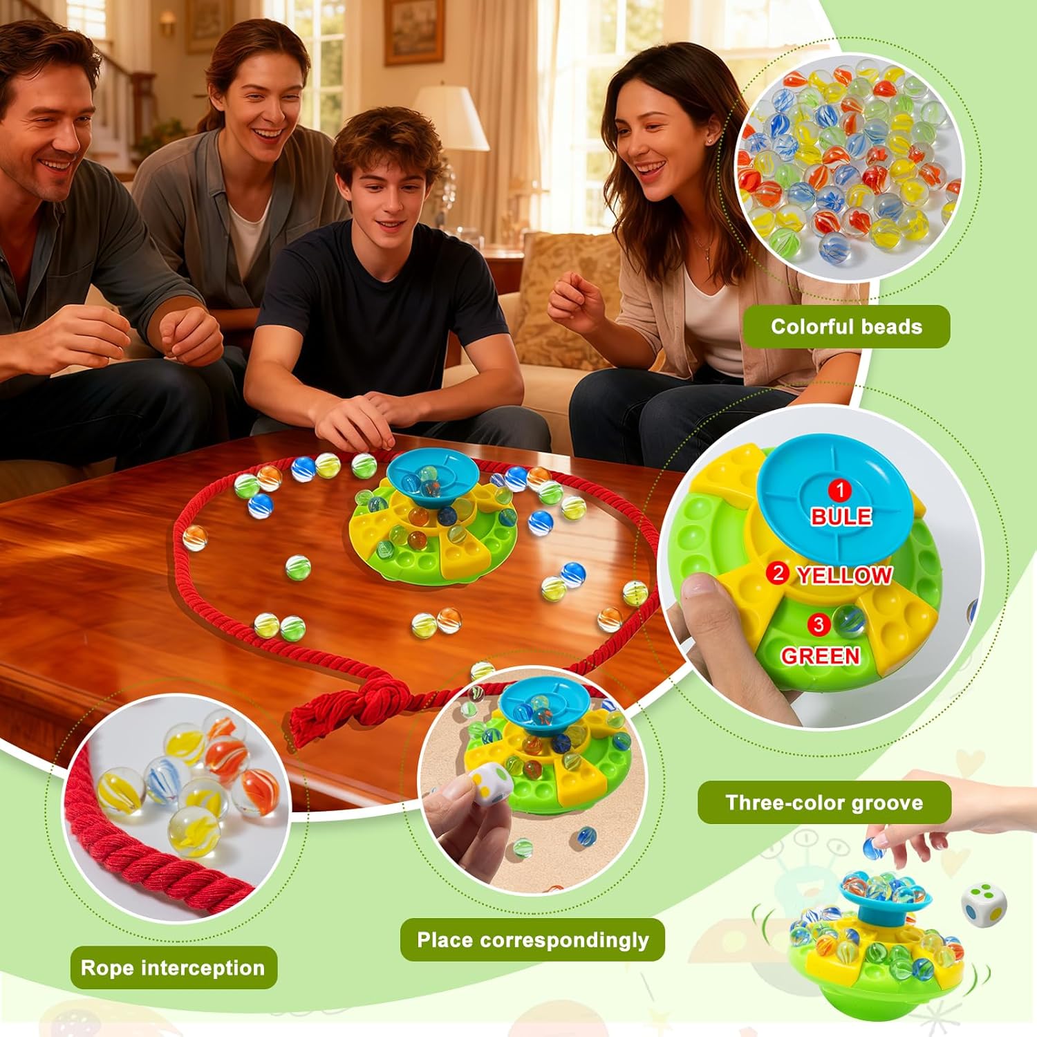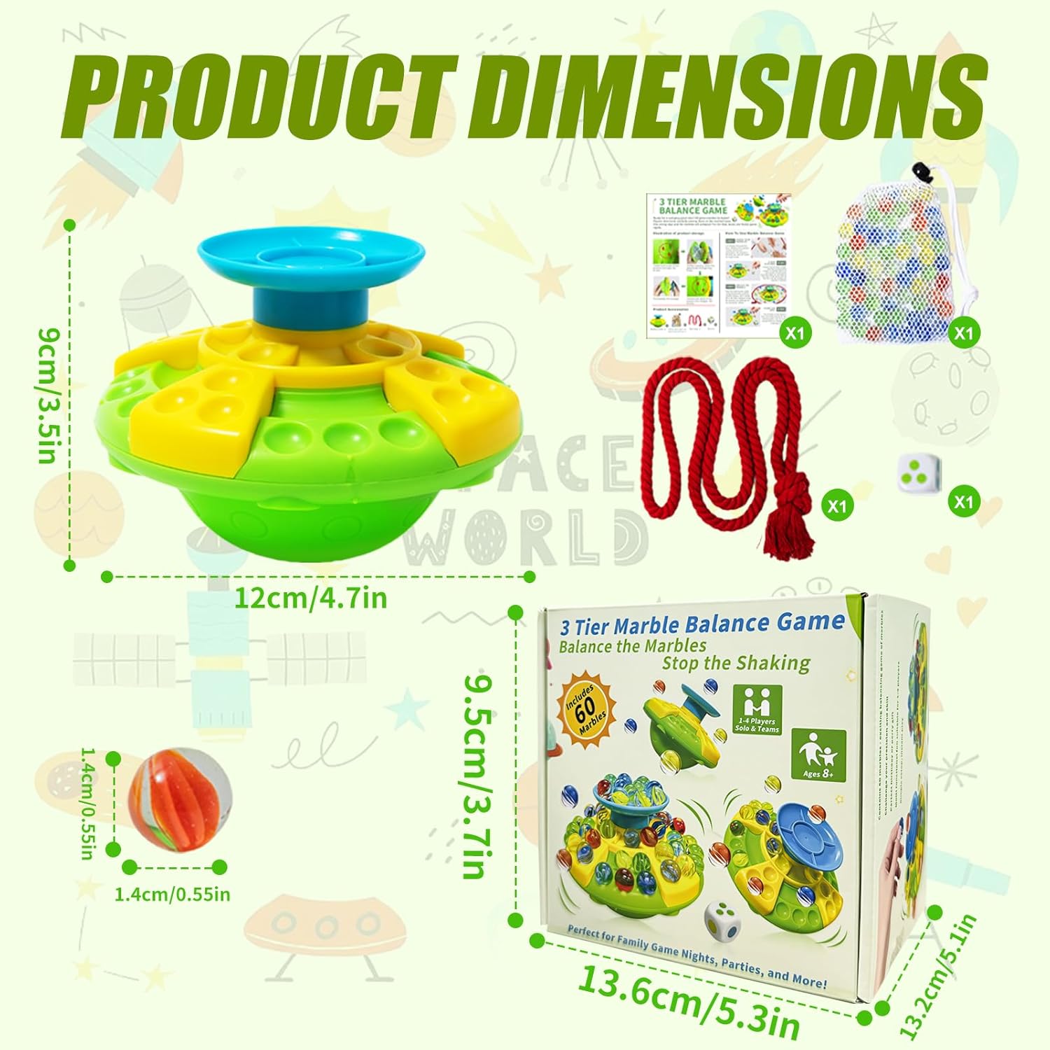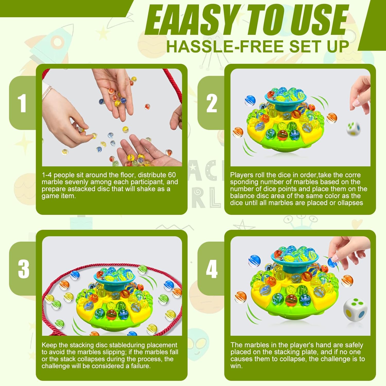 Coinvolgente gioco di equilibrio delle biglie: emozionante sfida di 60 colorati giochi di equilibrio delle biglie! Questo frenetico gioco di biglie presenta un'esclusiva base inclinata che offre un divertimento senza fine con l'equilibrio. Da 1 a 4 giocatori, a turno, posizionano le biglie sulla base e cercano di mantenere l'equilibrio senza ribaltarsi. Un'azione sbagliata può far cadere la biglia! Questo gioco di biglie garantisce un divertimento più duraturo, stimola la creatività e i giocattoli impilabili sono perfetti per adolescenti, adulti e giocatori più anziani. Migliora il gameplay: gioco di equilibrio dei marmi dotato di base di equilibrio, borsa a rete, un cubo e una corda per evitare traboccamenti; Posiziona il numero appropriato di perle di vetro nell'area colorata appropriata in base ai numeri e ai colori che appaiono sui dadi fortunati. Questi tre strati hanno scanalature aggiunte, rendendo più difficile mantenere l'equilibrio durante il gioco, aumentando la sfida e l'eccitazione del gioco. Configurazione rapida e intrattenimento istantaneo: gioco di biglie di vetro Nessuna regola complicata! L'obiettivo? Sii la prima persona a rimuovere tutte le biglie senza causare perdite! Quando non viene utilizzato, tutto il marmo può essere comodamente riposto in sacchetti o basi per mantenere tutto in ordine e pronto per la prossima volta. Facile da configurare e imparare, questo gioco oscillante offre divertimento immediato per il gioco individuale o di gruppo. Sviluppa la coordinazione occhio-mano: quando i giocatori bilanciano attentamente il marmo su una base oscillante, possono migliorare la coordinazione occhio-mano, la pazienza e la concentrazione. Ad ogni turno, gli adulti sviluppano capacità motorie e pensiero strategico, rendendoli perfetti per divertenti giochi di famiglia. Marble Game è un gioco da tavolo perfetto per la famiglia, adatto a famiglie e amici che si riuniscono e giocano alle feste. REGALO PERFETTO PER LE FESTE: il marmo di vetro è un regalo unico e accattivante che porta entusiasmo per compleanni, vacanze e feste. Il gioco del marmo è un regalo eccellente per varie feste e regali per feste, giochi da tavolo, regali per feste di Halloween, regali di Natale e premi per le aule scolastiche. È perfetto per le serate di gioco in famiglia e i giochi di festa!