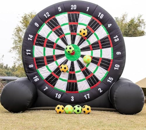 Pacchetto all-inclusive con freccette da calcio gonfiabili: il set è completo di un grande bersaglio gonfiabile per freccette da calcio, 8 palloni da calcio e una pompa per kickball, per garantirti tutto il necessario per una partita ricca di divertimento. Bersaglio gonfiabile per freccette da calcio con sistema appiccicoso: gioca senza frustrazioni con il nostro bersaglio progettato per una presa superiore. Tiene le palline saldamente in posizione, ma consente una facile rimozione, adatto a giocatori di tutte le taglie. Gonfiaggio rapido del gioco gonfiabile da calcio a freccette: gonfia questo gigantesco gioco in meno di 5 minuti! Alto più di 3 metri, guardalo prendere vita rapidamente: ricorda solo di mantenere il flusso d'aria costante durante il gioco. Bersaglio gonfiabile da calcio con freccette, costruzione durevole e di alta qualità: realizzato in tessuto Oxford 210D, il nostro bersaglio gonfiabile è resistente all'elettricità statica e offre una maggiore resistenza all'usura. Il suo design triangolare offre il 70% di stabilità in più rispetto ai bersagli da freccette standard. Giochi originali gonfiabili da calcio e freccette: scopri un nuovo gioco all'aperto preferito con il nostro esclusivo bersaglio gonfiabile per freccette. Perfetto per kick ball, long ball, giochi di tiro, home run derby e golf, è un regalo ideale e garantisce un divertimento senza fine.