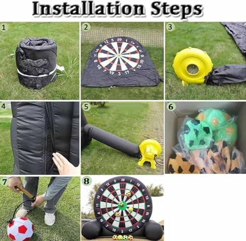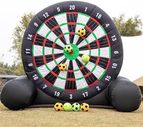 Bersaglio gonfiabile da calcio con freccette COSTRUZIONE RESISTENTE: Realizzato in materiale 420D di alta qualità, questo bersaglio gonfiabile da calcio con freccette è impermeabile, robusto e resistente all'usura. La sua resistenza alle temperature estreme e alla manipolazione intensa garantisce un divertimento duraturo. Tutte le cuciture sono rinforzate con tecnologia a doppia cucitura per una maggiore durata e tenuta stagna. Bersaglio gonfiabile per freccette da calcio, avanzato e adesivo: progettato per la massima aderenza, questo bersaglio garantisce che ogni pallone aderisca saldamente, creando un'esperienza di gioco stabile e coinvolgente. Scegli questo gioco di freccette per rendere i tuoi incontri più coinvolgenti, scatenare una competizione amichevole e creare ricordi indelebili. Freccette da calcio gonfiabili FACILE DA INSTALLARE: L'installazione è un gioco da ragazzi: basta collegare il soffiatore, gonfiare il bersaglio e tirare la valvola per iniziare il divertimento. Gonfia rapidamente gli 8 palloni da calcio inclusi con la pompa portatile e tuffati nell'azione. Ricordati di tenere il soffiatore collegato per un gonfiaggio costante durante la partita. Bersaglio da calcio gonfiabile UTILIZZO VERSATILE: Perfetto per diverse occasioni, questo bersaglio da calcio gonfiabile è ideale per competizioni familiari o attività di team building. Utilizzabile in diversi contesti, come campi di allenamento professionali, cortili, palestre, scuole ed eventi calcistici comunitari, è la scelta ideale per incontri a tema calcistico. Bersaglio da calcio gonfiabile con freccette SET COMPLETO DI ACCESSORI: il bersaglio per freccette misura 3 x 3,7 m (L x A) ed è dotato di un soffiatore da 370 W, 8 palloni da calcio, una pompa manuale, un telo per toppe, 4 corde e 4 picchetti. Prova il divertimento del calcio combinato con le freccette: ideale per riunioni con la famiglia e gli amici o per chiunque cerchi un intrattenimento emozionante.