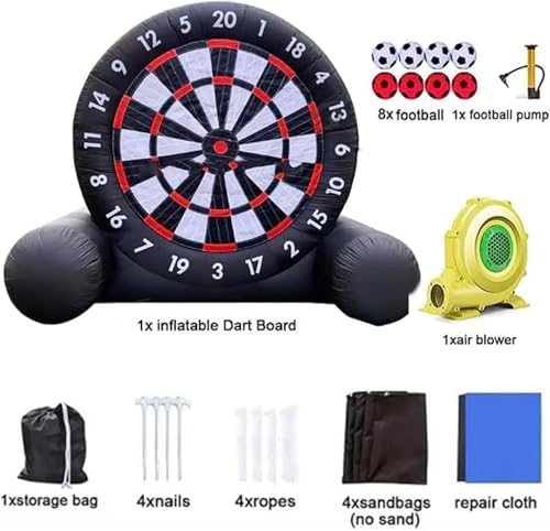 Gioco di freccette: installazione rapida e semplice: il potente soffiatore da 370 W gonfia il bersaglio in soli 3 minuti. Basta chiuderlo con la cerniera prima di gonfiarlo. Si sgonfia facilmente e occupa solo 0,3㎡ una volta piegato. La confezione include una comoda borsa per il trasporto e un set completo di accessori, tra cui picchetti antigraffio e sacchi di sabbia per un doppio fissaggio e resistenza al vento. È necessario un gonfiaggio continuo durante il gioco. Gioco di freccette Costruzione professionale e durevole: realizzato in tessuto Oxford antistatico 210D con cuciture doppie, questo bersaglio gonfiabile per freccette è progettato per essere resistente all'usura e agli strappi. La sua struttura triangolare migliora la stabilità del 70% e il bersaglio autoriparante presenta un'elevata adesività per una facile rimozione senza danneggiare le palline. Gioco di freccette: opzioni di gioco versatili: con oltre 15 modi creativi di giocare, questo bersaglio gonfiabile per freccette include 8 palloni da calcio in feltro e supporta varie attività all'aperto come calci, lanci, tiri e modalità competitive. Goditi giochi originali esclusivi e un divertimento senza fine, adatto per gare di freccette, fuoricampo, golf e altro ancora. Bersaglio appiccicoso migliorato per il gioco delle freccette: niente più preoccupazioni per le freccette che cadono. Questo bersaglio è appositamente progettato per la massima aderenza e una presa superiore, rendendo facile anche per i giocatori più piccoli recuperare le freccette dal bersaglio. Pacchetto completo di accessori per il gioco delle freccette: il set di freccette gonfiabili è dotato di un grande bersaglio gonfiabile per freccette da calcio, un soffiatore elettrico, una pompa da calcio, birilli, picchetti, corde, telo di riparazione, borsa per il trasporto e sacchi di sabbia per tutte le tue esigenze di gioco.