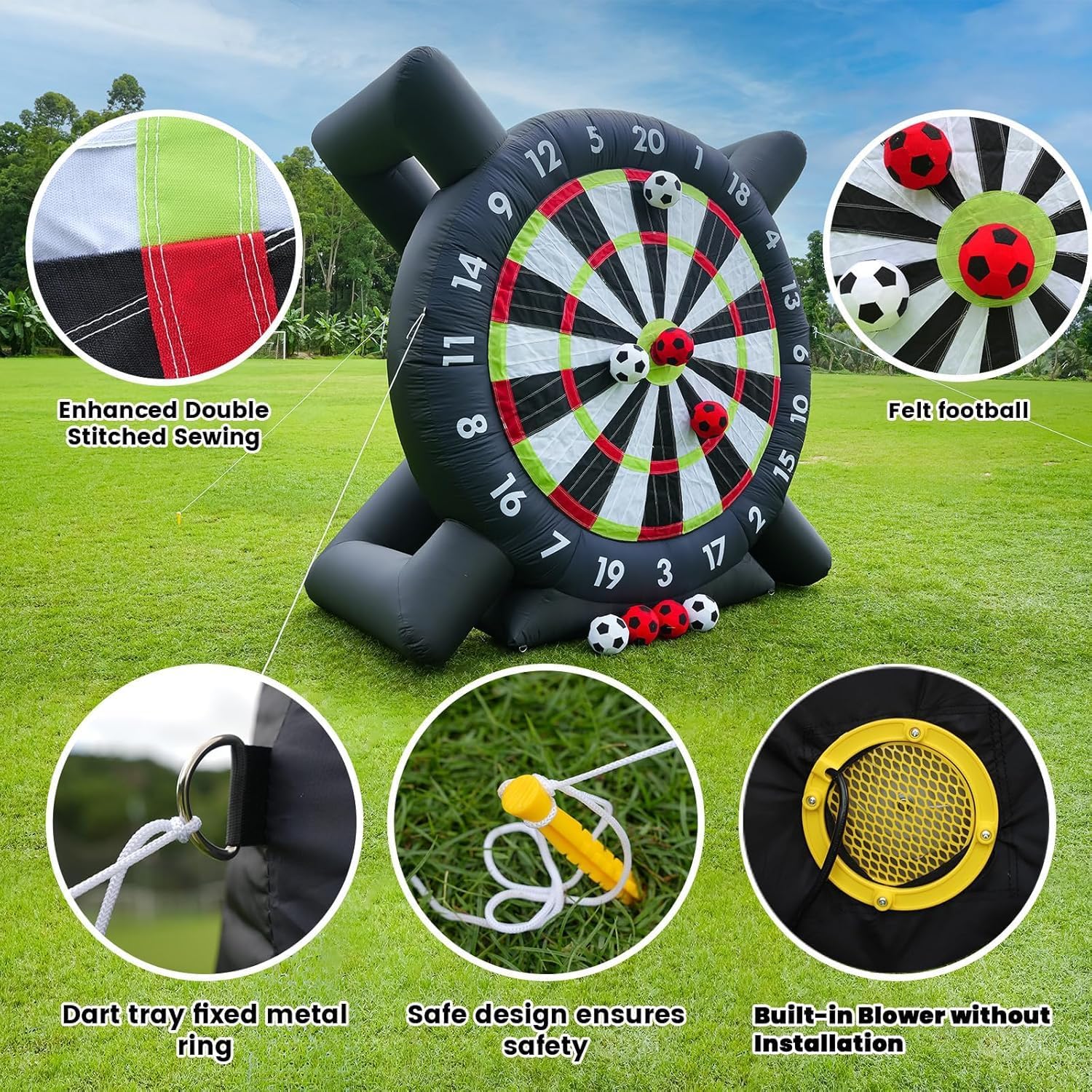 Gioco di freccette MATERIALE DI ALTA QUALITÀ: Realizzato in resistente tessuto Oxford 210D, il nostro bersaglio gonfiabile per freccette presenta una struttura robusta e un'avanzata tecnologia a doppia cucitura. È progettato per resistere al caldo e al freddo, agli strappi e all'elettricità statica, offrendo al contempo un'eccellente ritenzione dell'aria, garantendo un'esperienza di gioco di prima qualità. Gioco di freccette SPAZIOSO BERSAGLIO GONFIABILE DA CALCIO PER FRECCETTE: una volta completamente gonfiato, il nostro bersaglio da calcio per freccette è alto 3 o 4 metri. Questo gioco gigante unisce l'emozione del calcio e delle freccette, dove i giocatori calciano un pallone da calcio verso il bersaglio gonfiabile, guadagnando punti in base al punto in cui atterra la palla. Gioco di freccette: MIRA PRECISA E COLPI ADESIVI: Grazie alle superfici ultra-adesive, il nostro bersaglio per freccette garantisce che ogni freccetta aderisca saldamente all'impatto. Questo design non solo garantisce un'aderenza eccellente, ma massimizza anche il divertimento e l'entusiasmo per tutti i giocatori, rendendolo perfetto sia per adolescenti che per adulti. Gioco di freccette SET COMPLETO INCLUSO: il pacchetto include tutto il necessario per divertirti con questo gigantesco gioco di freccette da calcio gonfiabile, tra cui il bersaglio gonfiabile, un pallone da calcio, un soffiatore, una pompa dell'aria, otto picchetti da terra, quattro corde e quattro sacchi di sabbia, rendendolo un'attività all'aperto ideale o una scelta regalo unica. Gioco di freccette PROCESSO DI GONFIAGGIO RAPIDO: goditi un'installazione rapida poiché questo gioco gigante si gonfia in meno di 5 minuti, consentendo azione e divertimento immediati. Si prega di notare che è necessario un gonfiaggio continuo durante l'uso.