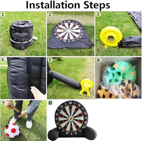 Gioco di freccette: installazione rapida e stoccaggio senza sforzo: l'installazione è un gioco da ragazzi con le nostre freccette gonfiabili da calcio, che richiedono solo 2 minuti o meno. Basta chiudere la cerniera prima di gonfiarle. Una volta sgonfie, le freccette si ripiegano in modo compatto per un facile trasporto e stoccaggio. Assicurarsi di evitare oggetti appuntiti durante lo spostamento e sollevarle per evitare danni. Gioco di freccette: maggiore durata e stabilità: il nostro bersaglio gonfiabile per freccette da calcio misura 3 metri per 3 metri ed è realizzato in tessuto Oxford 210D di alta qualità, che offre un'eccezionale resistenza all'usura e proprietà antistatiche. Tutti i giunti sono dotati di doppia cucitura e la superficie autoriparante ha una forte aderenza, consentendo un facile smontaggio senza danneggiare la palla. Caratteristiche del prodotto: il nostro set include 8 palloni da calcio in feltro, introducendo un nuovo ed entusiasmante sport che unisce calcio e freccette. Il grande bersaglio gonfiabile è perfetto per persone di tutte le età, con superfici gonfiabili e autoadesive, dove è possibile calciare i morbidi palloni da calcio verso il grande bersaglio in velcro. Tieni il punteggio o inventa i tuoi giochi per un divertimento extra. Gioco di freccette perfetto per vari eventi: questo bersaglio gonfiabile per freccette da calcio è ideale per gli appassionati di calcio e rugby, per i servizi di noleggio, per le scuole, per le gite in spiaggia, i campi estivi, le riunioni aziendali, gli eventi della comunità, le feste in giardino e per promuovere uno stile di vita attivo con amici e familiari, promuovendo al contempo il lavoro di squadra. Accessori inclusi per il gioco delle freccette: il set include 8 palloni da calcio, 1 soffiatore, 1 pompa ad aria, 8 picchetti, 4 corde e 4 sacchi di sabbia. Il nostro servizio clienti è disponibile 24 ore su 24, 7 giorni su 7, pronto ad assistervi per qualsiasi domanda sui nostri prodotti, indipendentemente dal fatto che decidiate di acquistarli o meno.