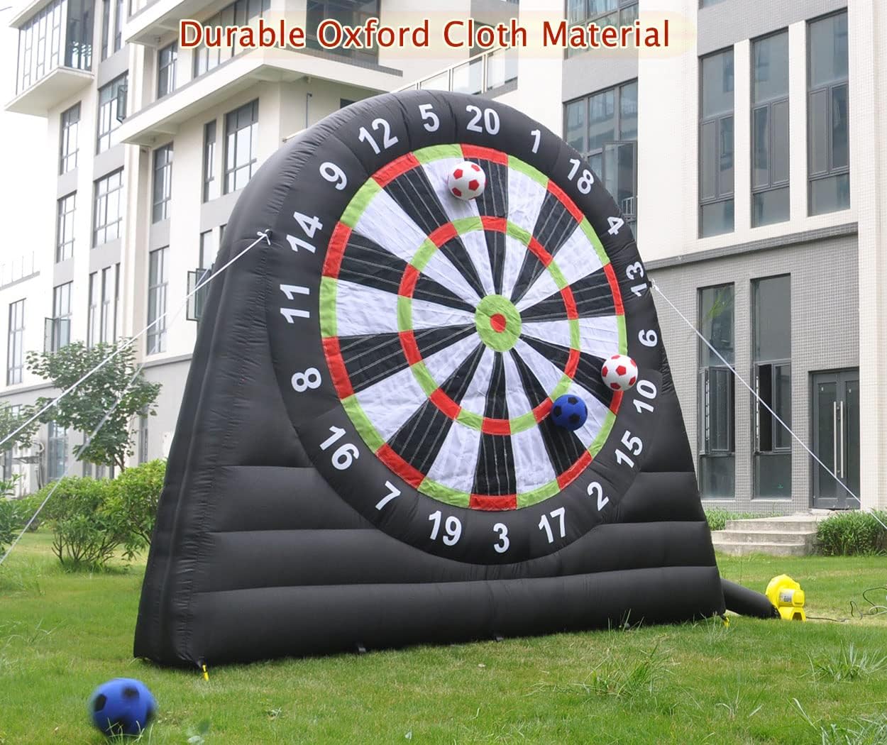 Freccette da calcio gonfiabili. Montaggio e stoccaggio rapidi: gonfia le freccette da calcio giganti in soli 2 minuti con flusso d'aria continuo quando collegate, assicurando che rimangano gonfie per tutta la durata della partita. Ricordatevi di chiudere la cerniera prima di gonfiarle e di aprirle semplicemente per sgonfiarle e riporle dopo l'uso. Freccette da calcio gonfiabili Design leggero e resistente - Realizzato in tessuto Oxford di alta qualità, questo bersaglio misura 3 metri di larghezza e 3,3 metri di altezza, il che lo rende leggero per un facile trasporto e resistente per un uso prolungato. Perfetto per riporre o viaggiare. Freccette da calcio gonfiabili Caratteristiche di gioco innovative: combinando calcio e freccette, questo bersaglio gonfiabile di grandi dimensioni è progettato per tutte le età. La sua superficie autoadesiva e il design gonfiabile garantiscono un'esperienza di gioco morbida e sicura. Calcia le morbide palline da calcio contro il bersaglio in velcro per un divertimento senza fine. Freccette da calcio gonfiabili. Applicazioni versatili: ideali per appassionati di calcio, aziende di noleggio, scuole, gite in spiaggia, campi estivi, eventi aziendali e riunioni di comunità. È un modo fantastico per godersi uno stile di vita attivo e promuovere il lavoro di squadra tra amici e familiari. Nota sui prodotti internazionali: tieni presente che gli articoli internazionali potrebbero avere termini diversi, essere venduti dall'estero e potrebbero variare rispetto ai prodotti locali per quanto riguarda vestibilità, fasce d'età e lingua dell'etichettatura o delle istruzioni del prodotto.