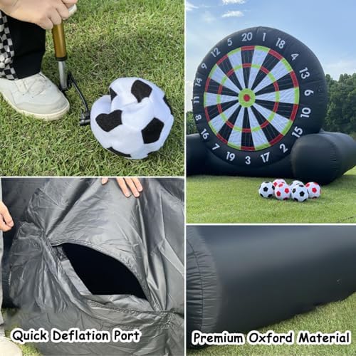 Gioco di freccette: maggiore durata e stabilità: realizzato in tessuto Oxford 210D, questo bersaglio gonfiabile per freccette resiste all'elettricità statica ed è progettato per una maggiore resistenza all'usura. Grazie alle giunture a doppia cucitura, offre una migliore tenuta all'aria e una lunga durata, rendendolo in grado di resistere alla pressione per una durata prolungata. Gioco di freccette con design super adesivo: il bersaglio extra adesivo garantisce che ogni pallone da calcio aderisca saldamente, offrendo la stessa soddisfazione delle freccette tradizionali. Questo gioco gonfiabile per esterni aumenta il divertimento e la sfida, offrendo ai giocatori un gratificante senso di realizzazione. Divertimento con le freccette per tutte le occasioni: arricchisci i tuoi incontri all'aperto con i nostri giochi gonfiabili da calcio, dove il calcio incontra le freccette per un'esperienza esaltante. Perfetti per le competizioni a squadre e divertenti per famiglie, amici e chiunque cerchi emozioni forti alle feste in giardino, in palestra o a scuola. Gioco di freccette Cosa è incluso: il bersaglio gonfiabile per freccette misura 3 m x 3,7 m (L x A) ed è dotato dell'attrezzatura essenziale: 1 soffiatore da 350 W, 8 palloni da calcio, 1 pompa manuale, 1 telo di riparazione, 4 corde e 4 chiodi da terra. Scegli questo sport coinvolgente per un'esperienza indimenticabile e un divertimento senza fine. Gioco di freccette: facile da montare e riporre in modo compatto: il gioco di freccette gonfiabile si monta rapidamente in meno di 2 minuti. Basta chiuderlo con la cerniera prima di gonfiarlo. Può essere facilmente gonfiato e sgonfiato, consentendo di riporlo in modo compatto dopo l'uso. Ricordarsi di tenere lontani oggetti appuntiti e di sollevare con cautela il dardo durante il trasporto per evitarne l'usura.
