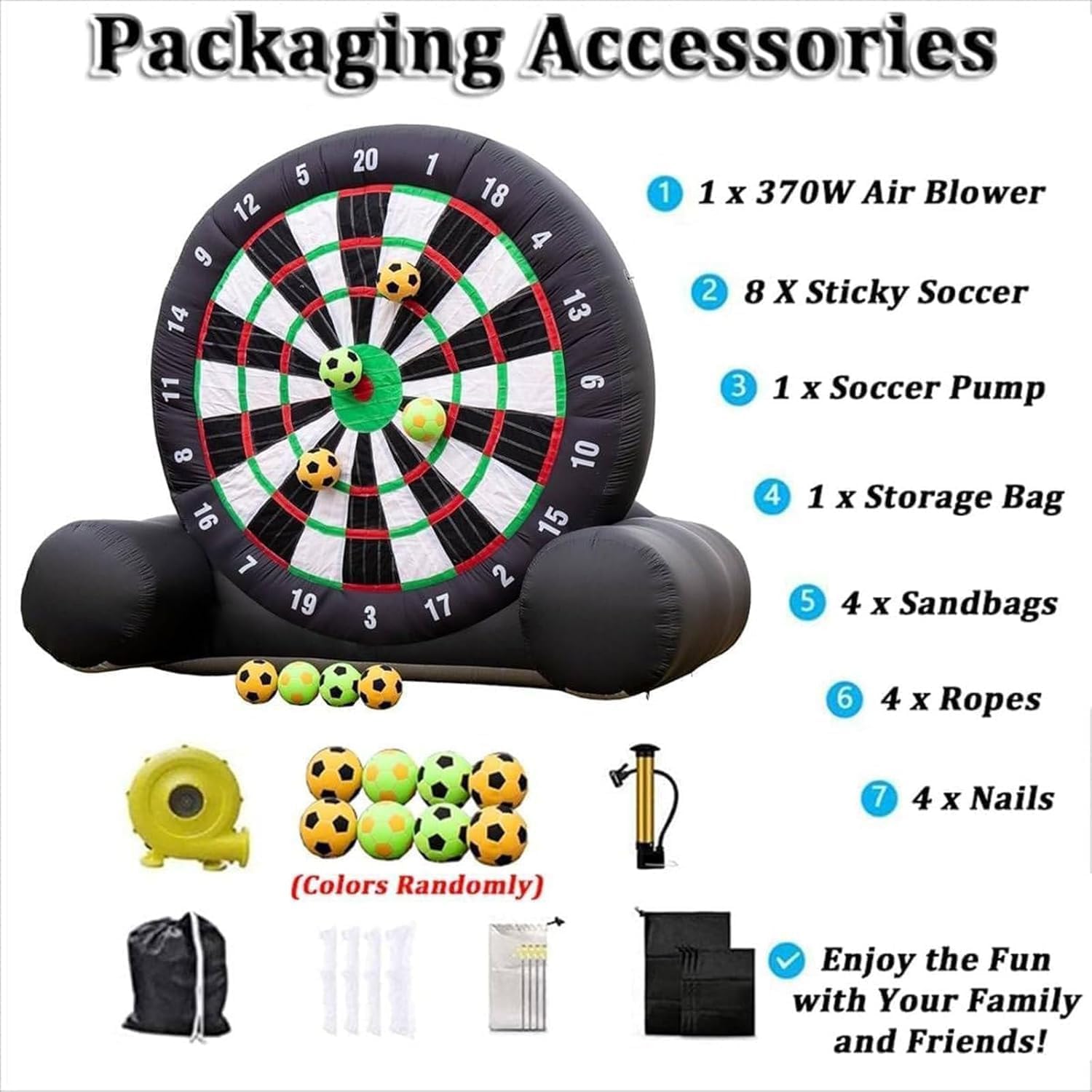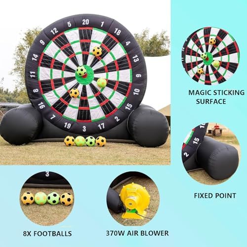Gioco di freccette: installazione rapida e comodo stoccaggio: le freccette gonfiabili da calcio sono progettate per un'installazione rapida in meno di 2 minuti. Assicurati di chiuderle con la cerniera prima di gonfiarle. Una volta sgonfie, possono essere facilmente ripiegate in pezzi compatti per un trasporto e uno stoccaggio senza problemi. Fai attenzione agli oggetti appuntiti durante la manipolazione e sollevale per ridurre al minimo l'usura. Gioco di freccette Maggiore durata e stabilità: il nostro bersaglio gonfiabile per freccette da calcio misura 3 metri per 3 metri ed è realizzato in tessuto Oxford 210D, antistatico e con una resistenza all'usura superiore. Le giunture a doppia cucitura e la superficie del bersaglio autoriparante garantiscono una solida aderenza, consentendo un facile smontaggio senza danneggiare la palla. Gioco di freccette: design creativo e coinvolgente: include 8 palloni da calcio in feltro. Questo sport innovativo unisce il calcio alle freccette, rendendolo perfetto sia per bambini che per adulti. Il grande bersaglio gonfiabile per freccette è dotato di una superficie autoadesiva, che rende semplice e divertente calciare il pallone sul bersaglio in velcro. Puoi tenere il punteggio o inventare i tuoi giochi. Gioco delle freccette Uso versatile: ideale per gli appassionati di calcio e rugby, nonché per servizi di noleggio, scuole, gite in spiaggia, campi estivi, riunioni aziendali, eventi comunitari, feste in giardino e per chiunque cerchi uno stile di vita attivo con la famiglia e gli amici, promuovendo al contempo il lavoro di squadra. Gioco di freccette Set completo di accessori: include 8 palloni da calcio, 1 soffiatore, 1 pompa ad aria, 8 picchetti, 4 corde e 4 sacchi di sabbia. Il nostro servizio clienti è disponibile 24 ore su 24, 7 giorni su 7. Che tu acquisti da noi o meno, puoi contattarci in qualsiasi momento per informazioni sui nostri prodotti.