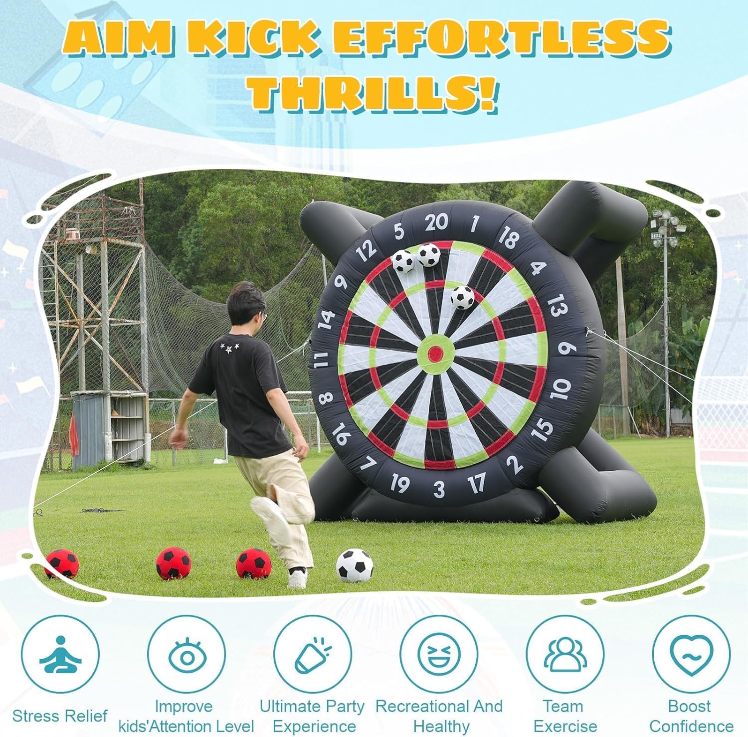 Base ultra stabile per freccette da calcio gonfiabili: realizzata in resistente tessuto in PVC, la freccetta gonfiabile è progettata per resistere all'usura e prevenire l'elettricità statica. La sua base migliorata garantisce la stabilità anche in caso di vento, garantendo un'esperienza di gioco affidabile. Gioco di freccette gonfiabile da calcio all'aperto: goditi ore di divertimento con 8 palloni da calcio in feltro inclusi in colori casuali. Football Darts unisce l'emozione del calcio e delle freccette, con un grande bersaglio in velcro che permette anche ai giocatori più piccoli di calciare facilmente le palline pelose e di attaccarle al bersaglio. Gonfiaggio rapido del gioco gonfiabile da calcio a freccette: gonfia questo gigantesco gioco fino a oltre 3 metri di altezza in meno di 5 minuti, con tempi di attesa minimi. Continua a divertirti gonfiandolo continuamente durante l'uso e ricorda di chiudere la cerniera prima di iniziare il gonfiaggio. Bersaglio da calcio gonfiabile: cosa ottieni: il pacchetto include un bersaglio da 3,6x2,1x3 m (12x6,9x10 piedi), un potente soffiatore da 370 W, 8 palloni da calcio, una pompa manuale, un telo di riparazione, 4 corde e 4 picchetti da terra. Scegli questo gioco sportivo con bersaglio da calcio per un'esperienza eccezionale e indimenticabile ovunque tu giochi. Ampie applicazioni del bersaglio gonfiabile per freccette da calcio: il bersaglio gonfiabile per freccette da calcio per esterni è perfetto per gli appassionati di calcio e football, le aziende di noleggio, le scuole, le gite in spiaggia, i campi estivi, gli eventi aziendali, le riunioni della comunità, le feste in giardino e chiunque voglia promuovere il divertimento attivo e il lavoro di squadra tra amici e familiari.