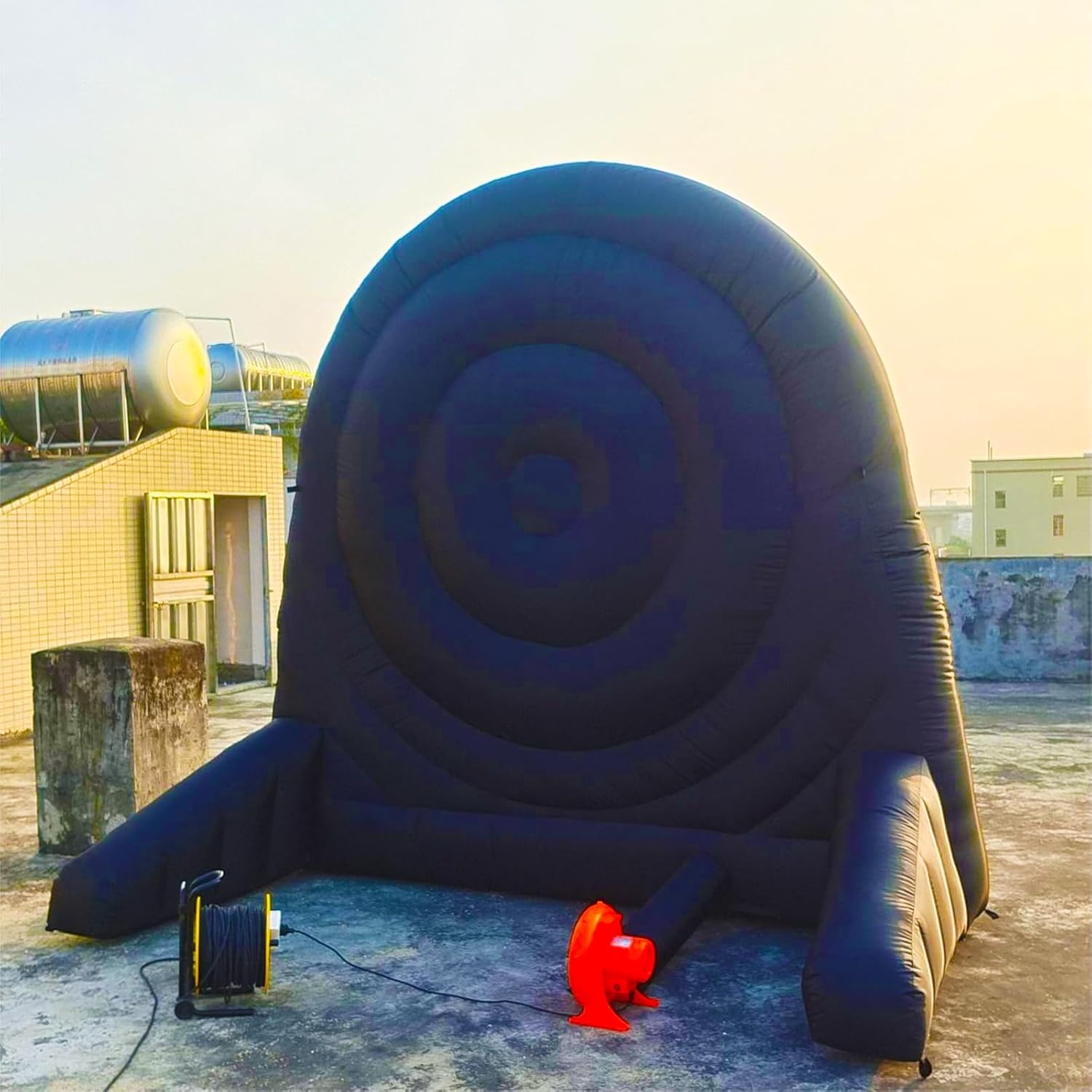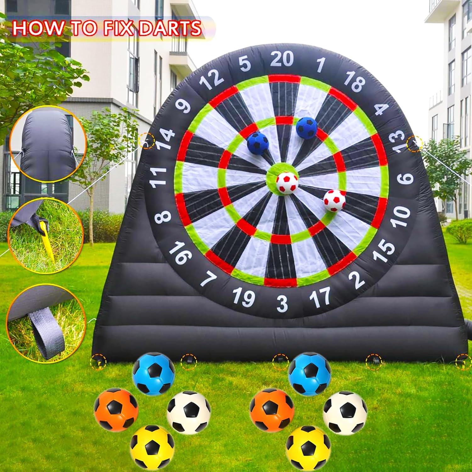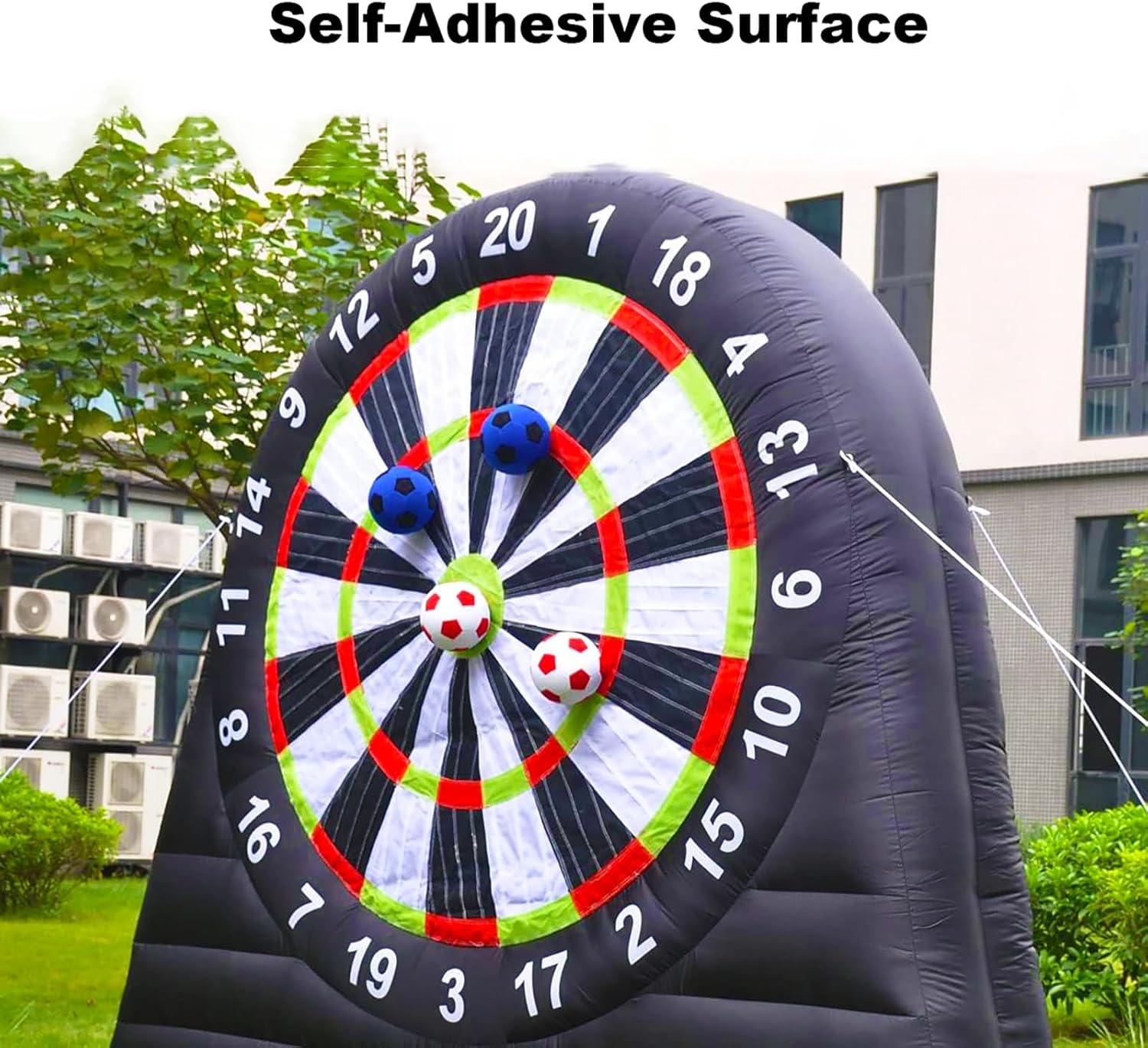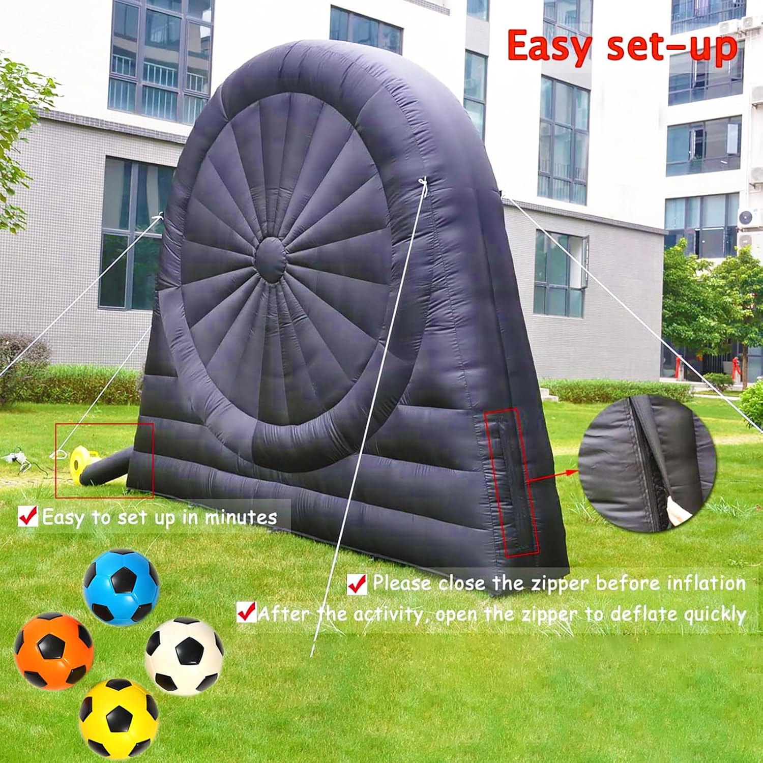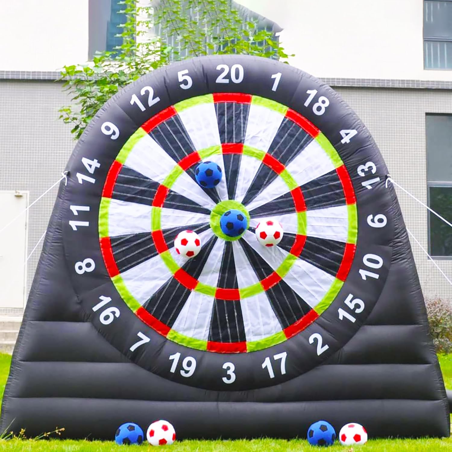 【Bersaglio Extra Adesivo】---Niente più palline che cadono dal bersaglio. Realizzato per garantire la massima adesione e una presa extra, ma comunque facile da staccare dal bersaglio anche per i giocatori più piccoli. 【Materiale】---Dimensioni del nostro bersaglio gonfiabile per freccette da calcio: 3 m x 3 m (larghezza x altezza); il bersaglio gonfiabile è realizzato in tessuto Oxford 210D, in grado di prevenire l'elettricità statica e garantire una maggiore resistenza all'usura. Tutti i giunti delle freccette da calcio sono realizzati con tecnologia a doppia cucitura per una maggiore tenuta d'aria e durata. 【Installazione Rapida】--- Ci vogliono solo 2 minuti per gonfiare il bersaglio gigante per freccette da calcio e mantenerlo gonfio per tutta la durata dello spettacolo quando è collegato alla corrente, in modo da non dover perdere molto tempo per installarlo; ricordarsi di chiudere la cerniera prima di gonfiarlo. Al termine del gioco, aprire la cerniera per sgonfiarlo e riporlo rapidamente. 【Caratteristiche】---Il Kick Darts è l'ultimo sport che unisce il calcio e le freccette. -Il bersaglio da calcio è adatto a bambini e adulti; tutti i bersagli gonfiabili hanno una superficie autoadesiva; si calciano palloni da calcio pelosi contro l'enorme bersaglio alto 3 metri, si tiene il punteggio o si inventa il proprio gioco. 【Applicazione】---Fantastico per gli appassionati di calcio e football, ma anche per attività di noleggio, scuole, giornate in spiaggia, campi estivi, eventi aziendali, gruppi comunitari, feste in giardino e amici e familiari per godersi uno stile di vita attivo e promuovere il lavoro di squadra.