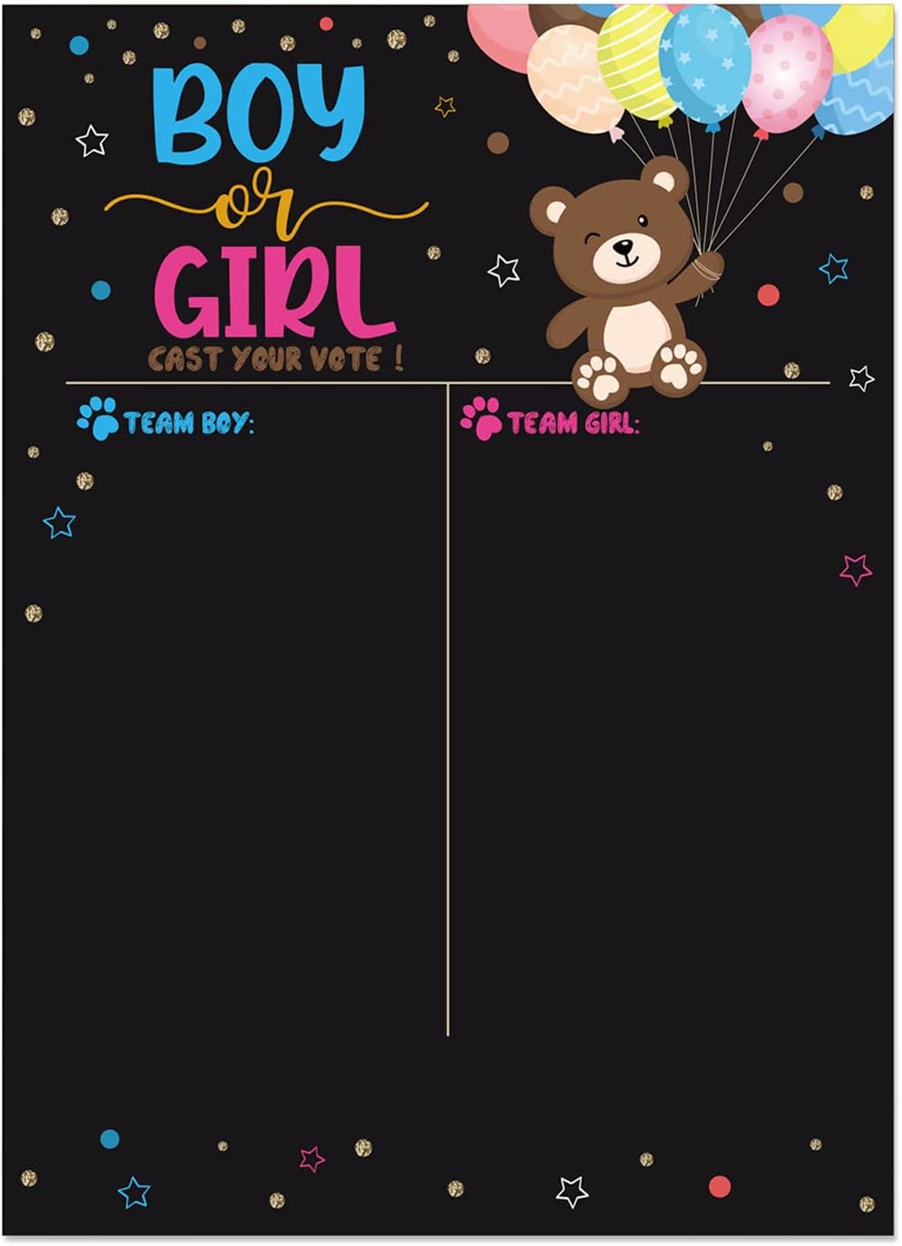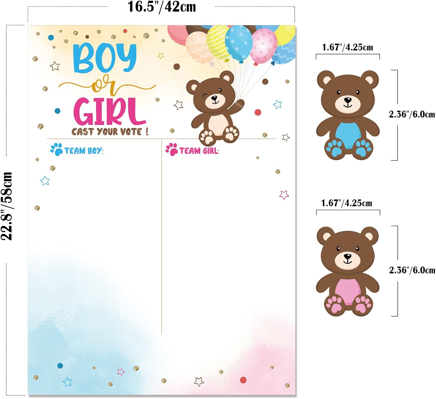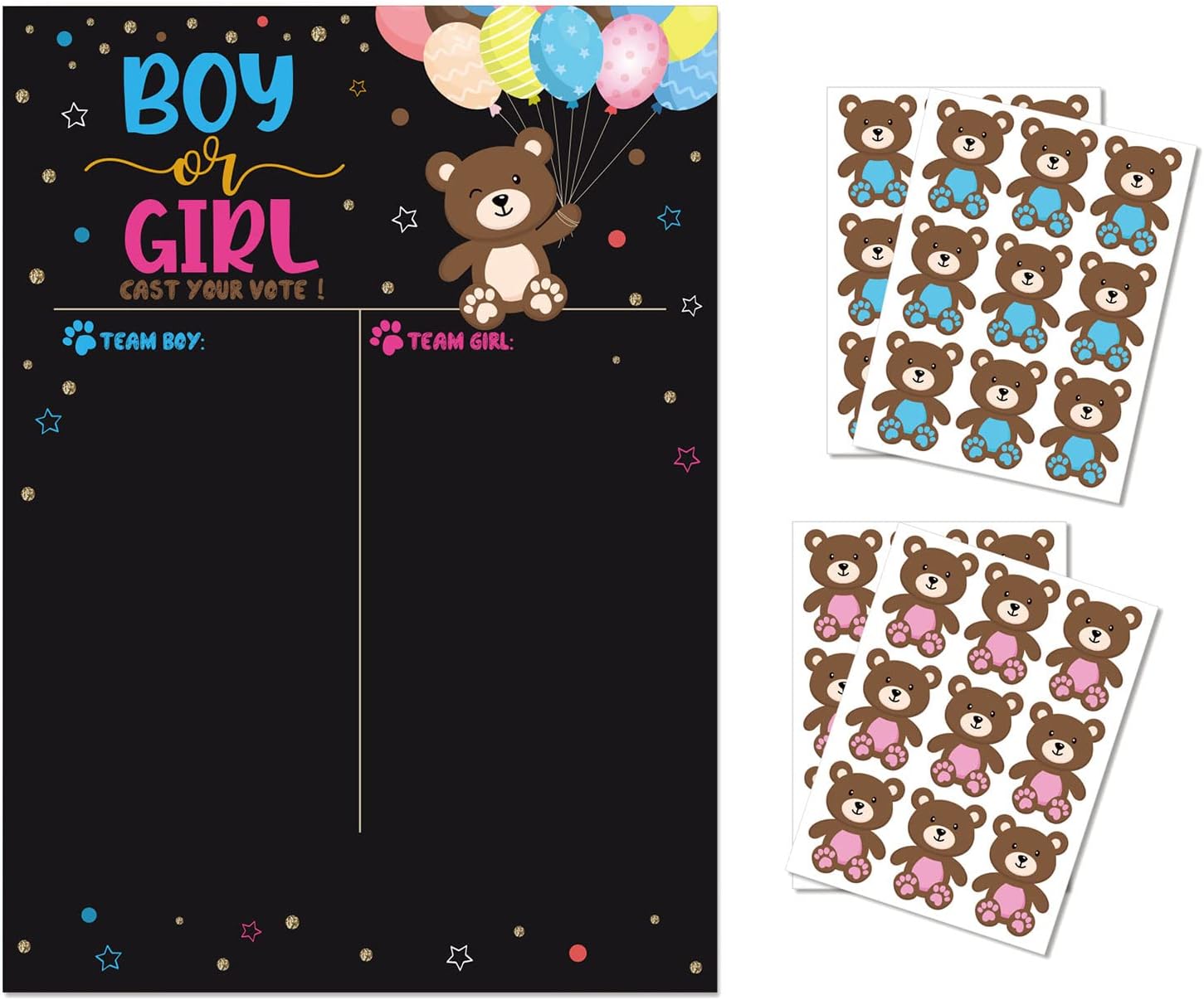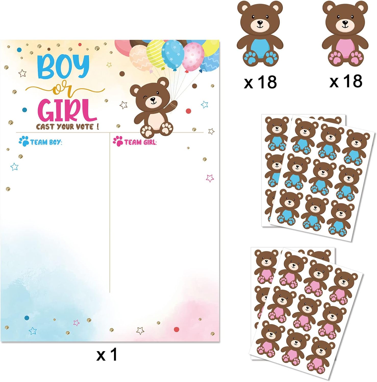I predittori di giochi per baby shower sono realizzati in carta, durezza e materiali umidi per mantenere a lungo termine 36 adesivi di genere (18 per ragazzo, 18 per ragazze, 18 per ragazze), sufficienti per la maggior parte delle feste come giochi di baby shower, previsioni divertenti porteranno più risate e memoria alla tua collezione Poster di previsione per baby shower: il design delle dimensioni di 16,5 x 22,8 pollici consente agli ospiti di rimanere con spazio sufficiente per gli ospiti di rimanere incollati La confezione include: 1 poster di previsione per bambini Jender, 18% pancia d'orso per ragazze), 18% adesivi per bambini (pancia blu) Ricordo: il poster di previsione per baby shower è per feste pubbliche di genere e le celebrazioni più importanti come nuovi genitori
