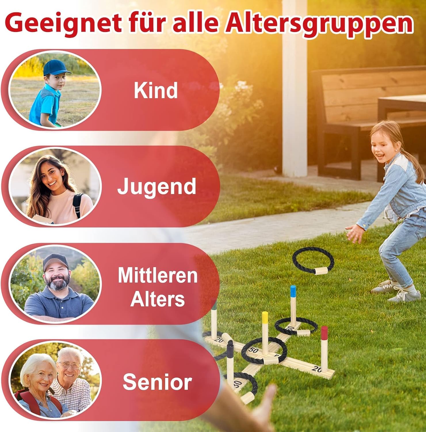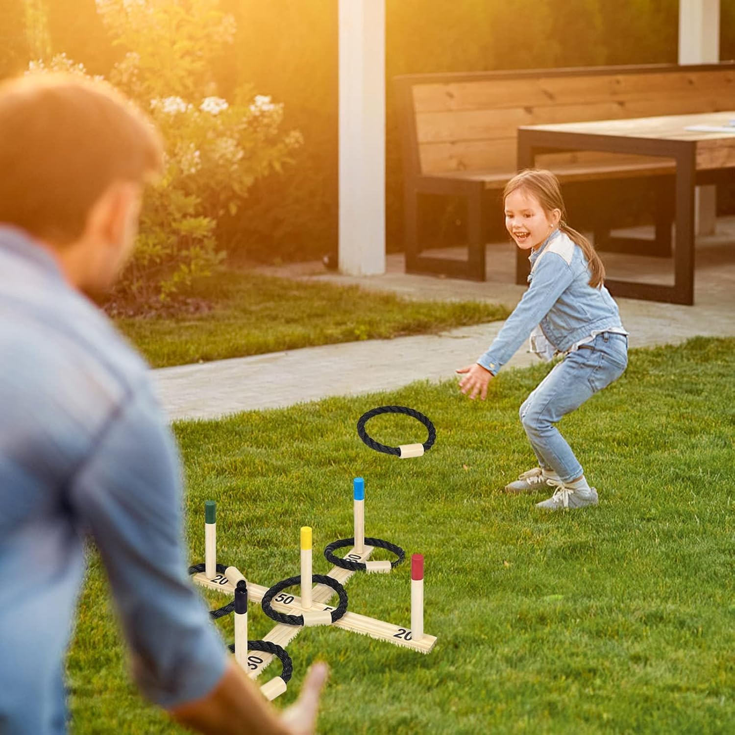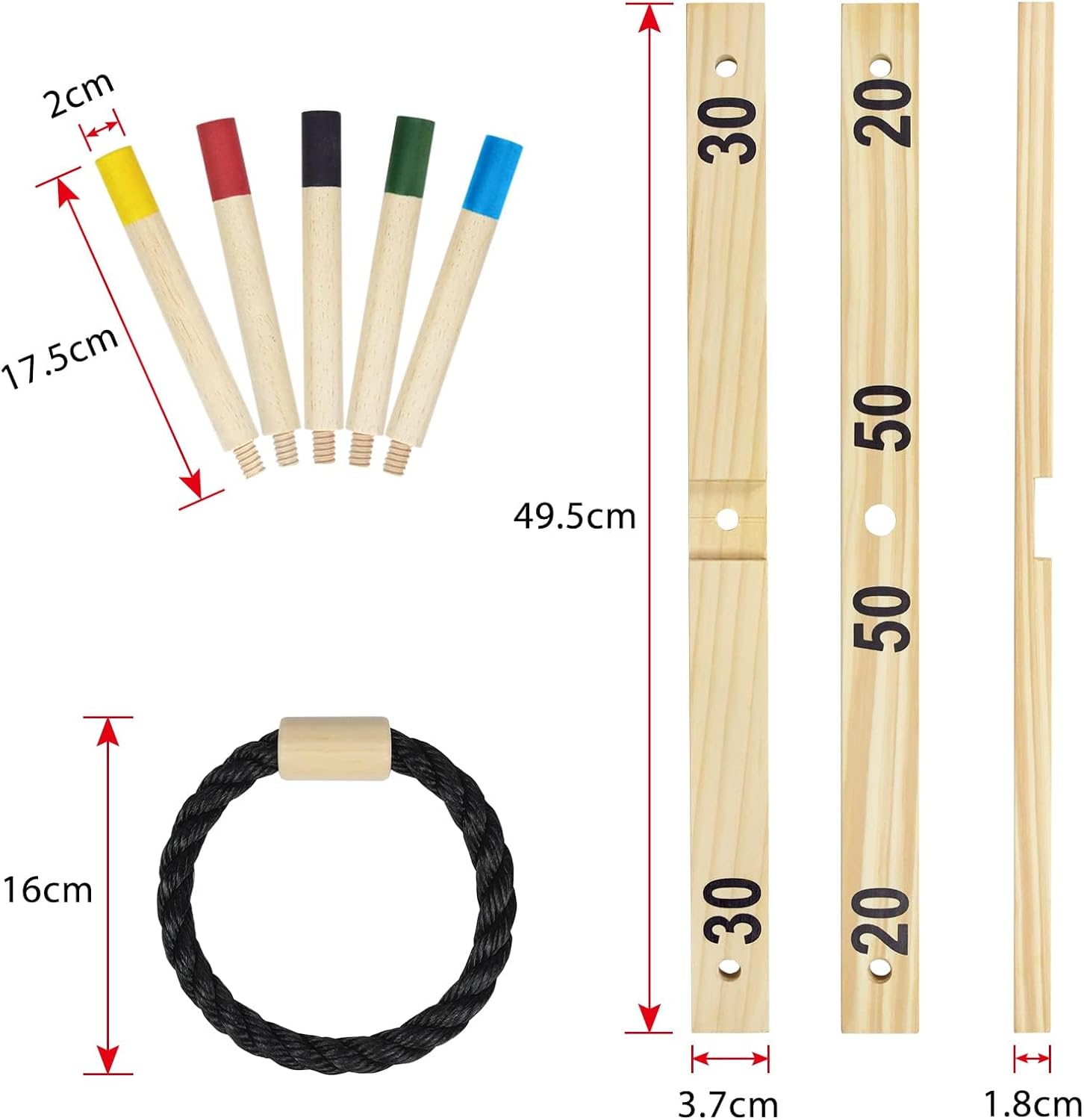 Divertimento immediato garantito: il nostro gioco di anelli in legno si monta e smonta rapidamente e senza sforzo, ideale per l'intrattenimento in viaggio in vacanza, parchi o giardino. Perfetto gioco di famiglia: il gioco di lancio ad anelli non solo promuove il divertimento di tutte le età, ma anche l'apprendimento e l'interazione insieme all'interno della famiglia, rendendolo un gioco ideale per le riunioni di famiglia. Materiale durevole: realizzato in legno di pino di alta qualità, il nostro gioco di lancio offre robustezza e resistenza alle intemperie per un divertimento duraturo. Corde di lancio ergonomiche: dotato di anelli di corda in nylon resistenti, facili da impugnare e lanciare, questo giocattolo da giardino garantisce una piacevole sensazione di gioco e una migliore coordinazione occhio-mano. Versatile e divertente: questo gioco di lancio in legno è una scelta eccellente per feste in giardino, feste in famiglia o semplicemente pomeriggi rilassanti all'aperto, e offre ore di intrattenimento per bambini e adulti.