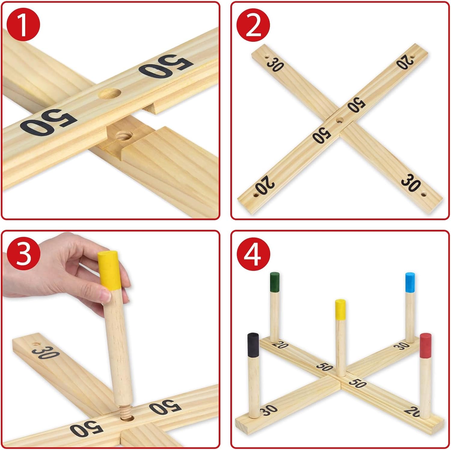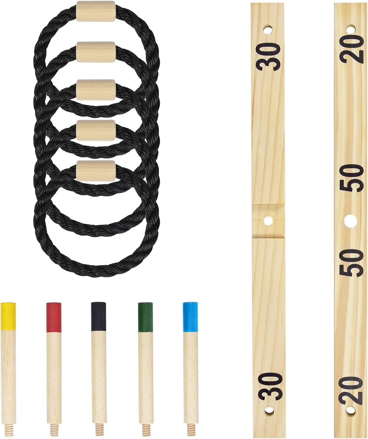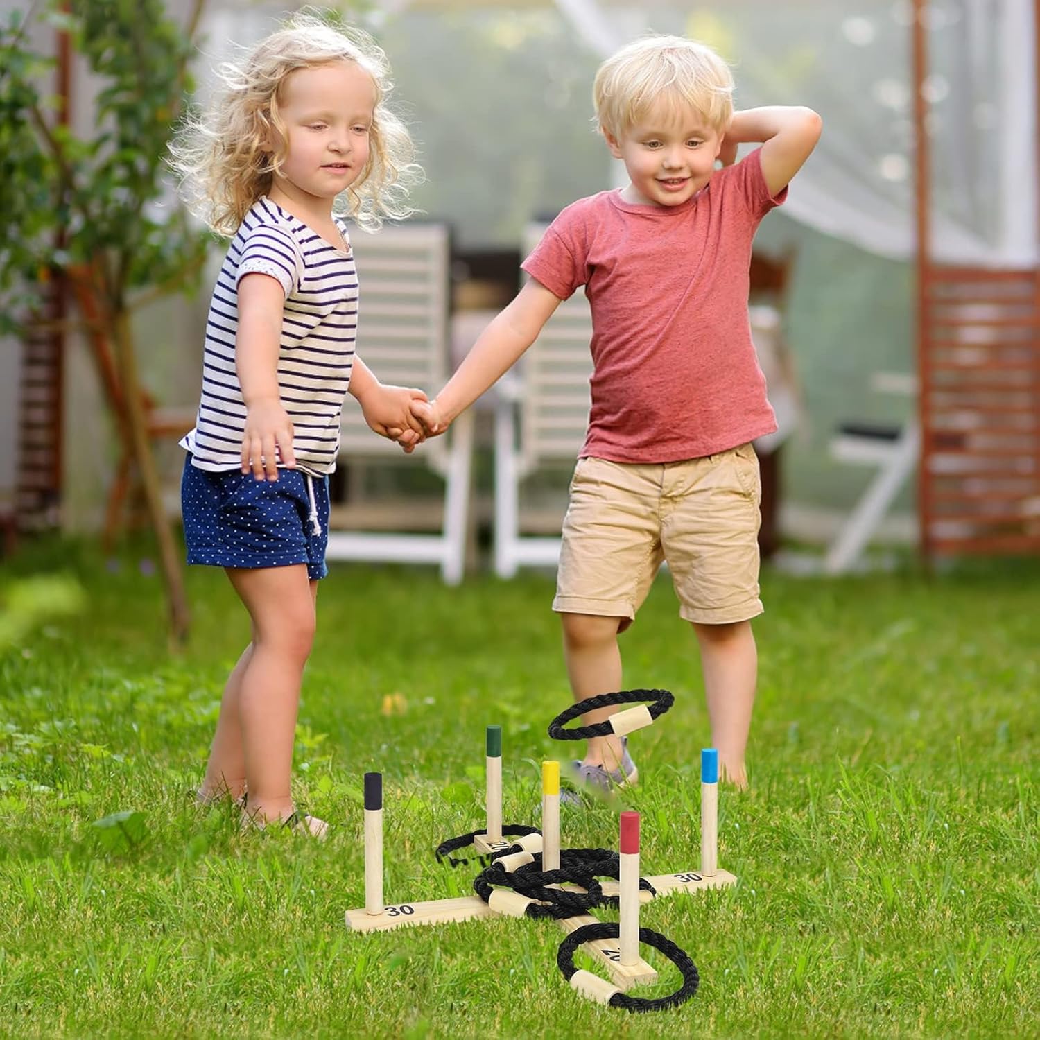 Divertimento immediato garantito: il nostro gioco di anelli in legno si monta e smonta rapidamente e senza sforzo, ideale per l'intrattenimento in viaggio in vacanza, parchi o giardino. Perfetto gioco di famiglia: il gioco di lancio ad anelli non solo promuove il divertimento di tutte le età, ma anche l'apprendimento e l'interazione insieme all'interno della famiglia, rendendolo un gioco ideale per le riunioni di famiglia. Materiale durevole: realizzato in legno di pino di alta qualità, il nostro gioco di lancio offre robustezza e resistenza alle intemperie per un divertimento duraturo. Corde di lancio ergonomiche: dotato di anelli di corda in nylon resistenti, facili da impugnare e lanciare, questo giocattolo da giardino garantisce una piacevole sensazione di gioco e una migliore coordinazione occhio-mano. Versatile e divertente: questo gioco di lancio in legno è una scelta eccellente per feste in giardino, feste in famiglia o semplicemente pomeriggi rilassanti all'aperto, e offre ore di intrattenimento per bambini e adulti.