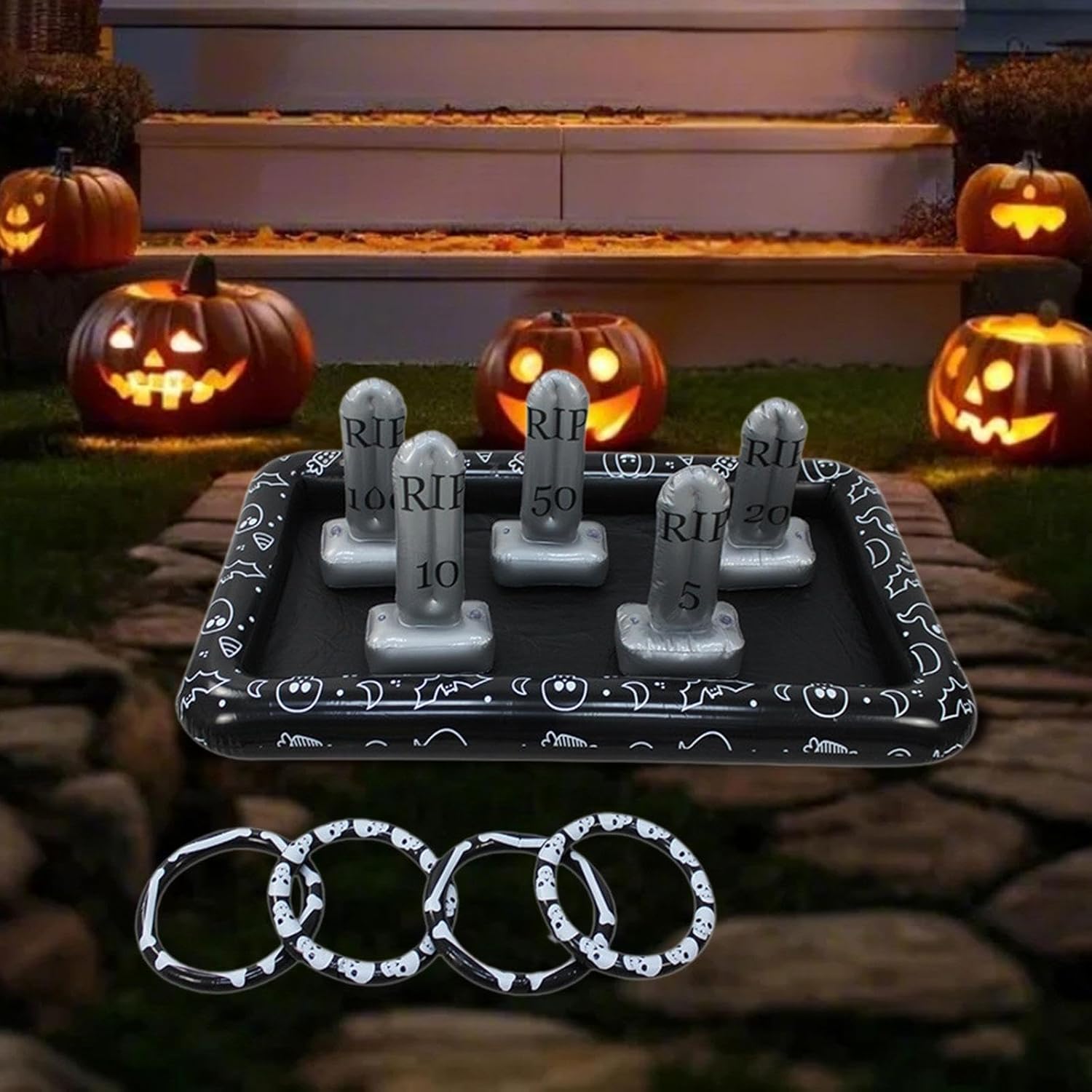 【Facile da gonfiare e sgonfiare】: basta gonfiare e posizionare la lapide gonfiabile sulla base, quindi riempirla d'acqua per renderla stabile sull'erba o sul pavimento. Gioca con questi anelli per ottenere punti. Aggiungi divertimento alla tua famiglia con questo gioco di lancio degli anelli. 【Ottime dimensioni per i giochi di carnevale】: Gioco di lancio di anelli con lapide gonfiabile di grandi dimensioni 145 cm x 85 cm / 57,09 pollici x 33,46 pollici. 10 in 1, questo set include 1 base gonfiabile, 5 lapidi mobili e 4 anelli di lancio. Ci sono 5, 10, 20, 50, 100 punti, puoi iniziare una competizione. 【Robusto e facile da riporre】: puoi usarlo molte volte, gioca a questo divertente gioco di lancio con i tuoi amici durante Halloween che ti durerà per tutta la stagione 【Giochi di Halloween per bambini】: Crea una divertente festa sportiva o un carnevale scolastico con il gioco del lancio de anelli. Gioca a questi giochi per aiutare a sviluppare la coordinazione occhio-mano del bambino; contare anelli durante il gioco può allenare le capacità matematiche. 【Divertente gioco da giardino per feste 】: posiziona questi anelli gonfiabili a forma di lapide nel tuo giardino, prato e all'aperto. Questa è un'ottima festa di Halloween. La tua famiglia e i tuoi amici lo adoreranno! Questo è un gioco da aggiungere al tuo .