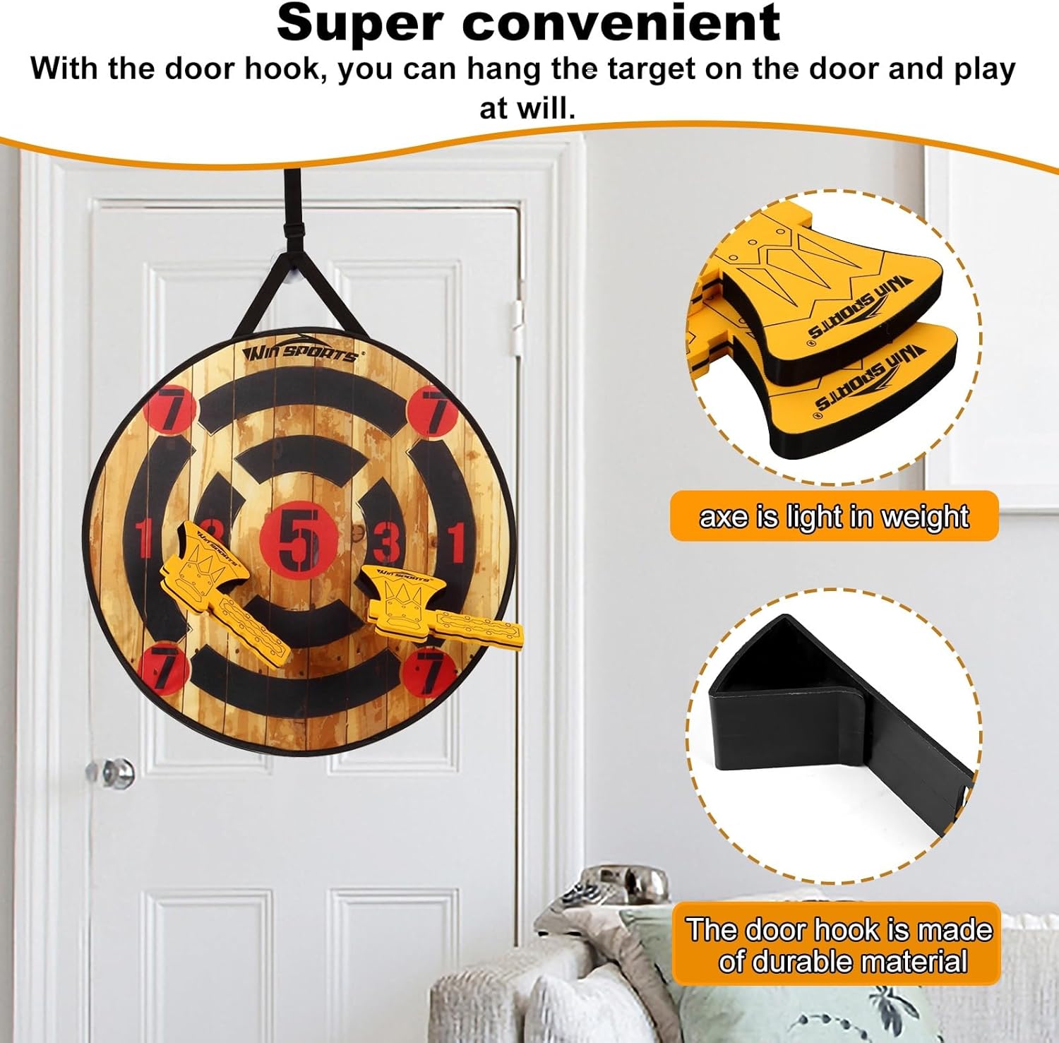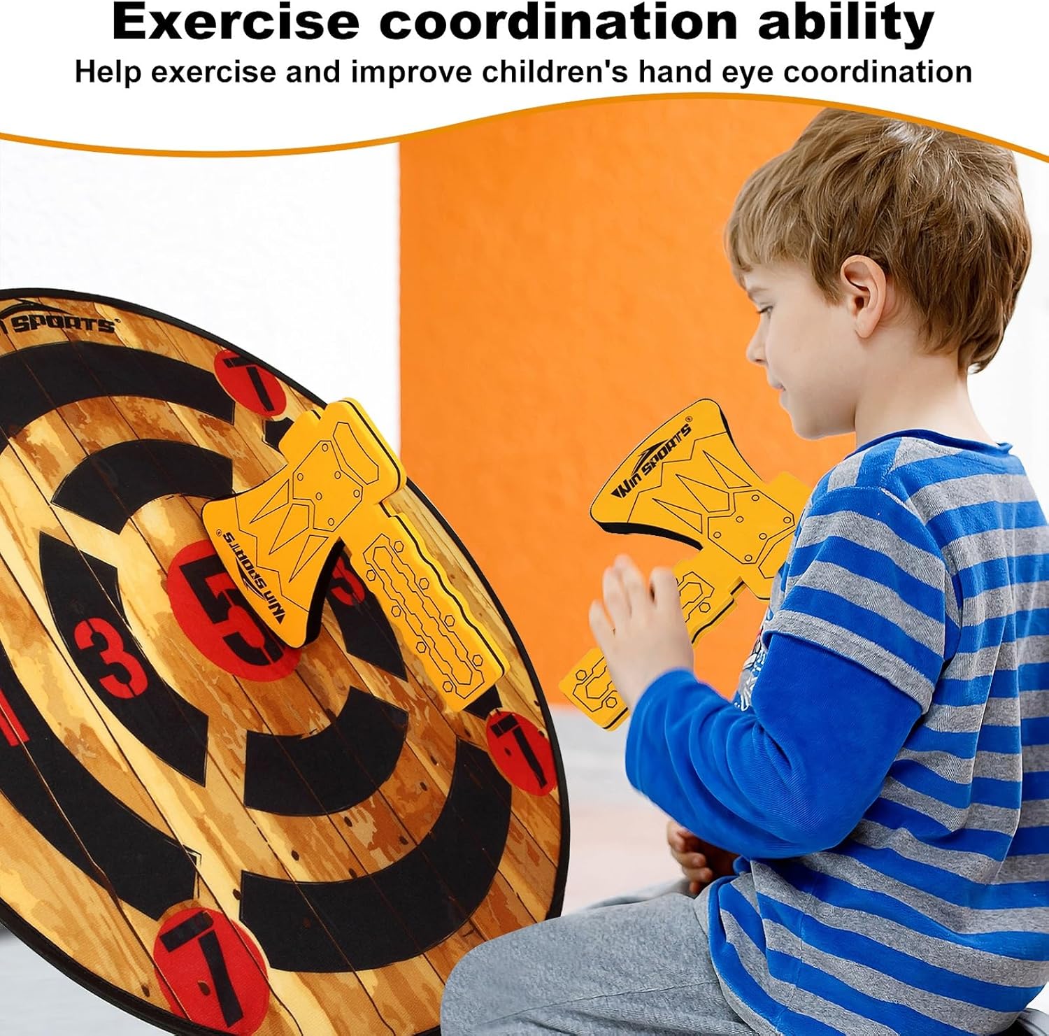 Set da lancio dell'ascia: bambini e adulti si divertiranno con questa interpretazione intelligente e sicura del popolare trend del gioco del lancio dell'ascia che sta investendo la nazione. I giocatori, a turno, lanciano le due robuste asce in schiuma contro il nostro bersaglio con ceppo di legno a strappo per determinare il campione finale. MIGLIORA LE ABILITÀ MOTORIE: Perfetto per i bambini dai 3 anni in su, questo gioco di lancio dell'ascia per bambini può aiutare i tuoi piccoli con l'equilibrio e la coordinazione occhio-mano. Come bonus, tenere traccia del punteggio può aiutare a rafforzare i concetti matematici. Attacca il bersaglio centrale: ciascuna delle due asce in schiuma incluse è avvolta in velcro, che aderisce al bersaglio in tessuto di legno al contatto. Ogni anello sul bersaglio vale 1, 2, 3 o 4 punti - il Bullseye vale 6 punti. Gioco di freccette sicuro: l'ascia è molto leggera e non ha spigoli vivi, il che può evitare lesioni ai bambini e ai muri. La ventosa e il gancio per appendere inclusi offrono opzioni flessibili per appendere il bersaglio all'interno o all'esterno. Leggero e portatile: le assi in schiuma e il bersaglio rotondo a rotazione e piegatura rapida si adattano perfettamente all'interno della borsa per il trasporto/conservazione con cordoncino inclusa, rendendolo facile da riporre e portare al parco, al lago o alla festa del taglialegna.