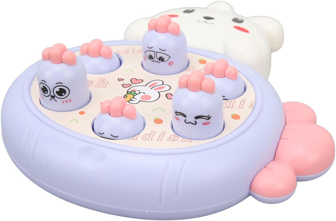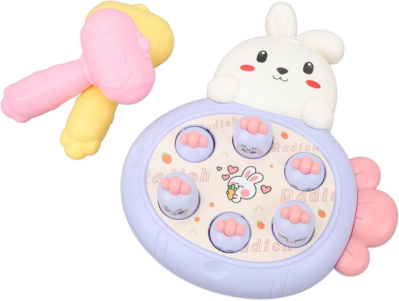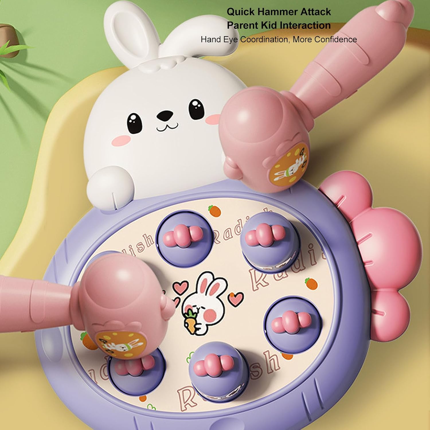 Modalità PK: questo gioco di martelli per talpe ha 2 martelli per il PK tra genitori e bambini. Avvia un gioco di famiglia Talpa per migliorare l"interazione genitore-figlio. Coordinazione occhio-mano: questo giocattolo martellante favorisce le abilità motorie e migliora la concentrazione e la coordinazione occhio-mano del bambino. Stile cartone animato: questo giocattolo martellante presenta anche uno stile carino e accattivante di coniglio e carota che diventerà presto il pezzo preferito del tuo. Materiale sicuro: questo giocattolo da corsa per realizzato in materiale plastico innocuo con superficie liscia e angoli arrotondati, è sicuro ed estremamente resistente. Ventose: questo giocattolo per martelli talpe è dotato di 2 ventose sul retro, che possono essere fissate saldamente al piano del tavolo e alla parete lisciante.