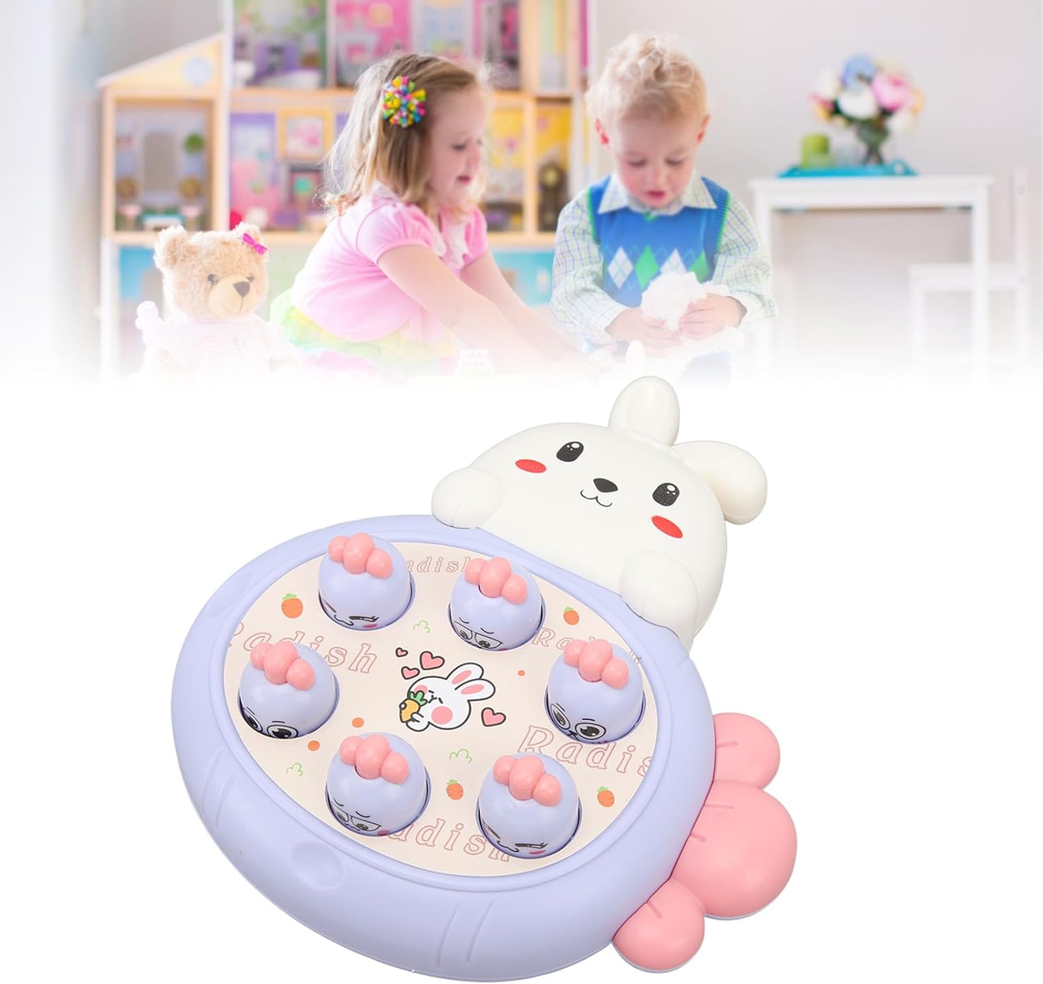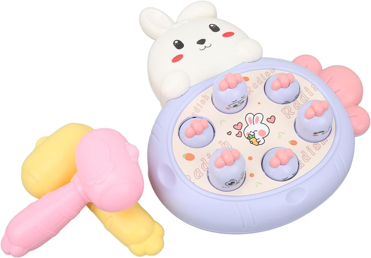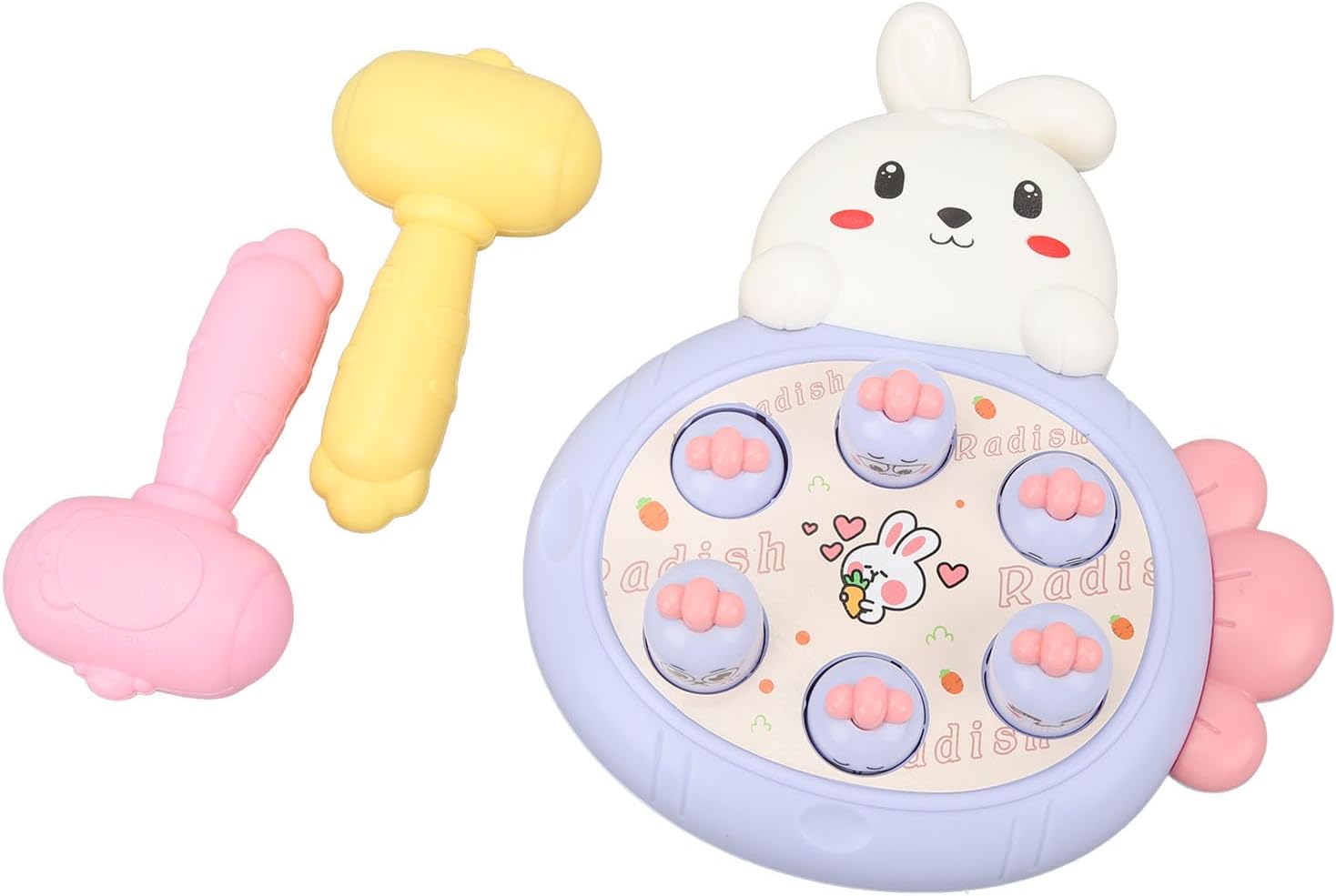 Modalità PK: questo gioco di martelli per talpe ha 2 martelli per il PK tra genitori e bambini. Avvia un gioco di famiglia Talpa per migliorare l"interazione genitore-figlio. Coordinazione occhio-mano: questo giocattolo martellante favorisce le abilità motorie e migliora la concentrazione e la coordinazione occhio-mano del bambino. Stile cartone animato: questo giocattolo martellante presenta anche uno stile carino e accattivante di coniglio e carota che diventerà presto il pezzo preferito del tuo. Materiale sicuro: questo giocattolo da corsa per realizzato in materiale plastico innocuo con superficie liscia e angoli arrotondati, è sicuro ed estremamente resistente. Ventose: questo giocattolo per martelli talpe è dotato di 2 ventose sul retro, che possono essere fissate saldamente al piano del tavolo e alla parete lisciante.
