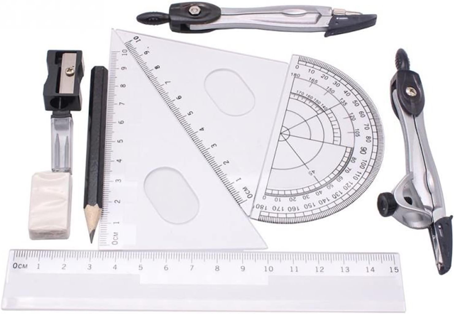 Set di strumenti di geometria per tutti i livelli di studenti. Con scale inglesi, grande precisione. La confezione include: 2 ES in metallo, 1 gomma, 1 temperamatite in metallo, 1 righello, 1 set quadrato (30°/60°), 1 set quadrato (45°), 1 goniometro, 1 portamine per BUSSOLA, 1 confezione di mine per portamine. Materiale: plastica + metallo, dimensioni imballo (L*L): 19,5*9,3 cm. Cancelleria scolastica perfetta per studenti e insegnanti.