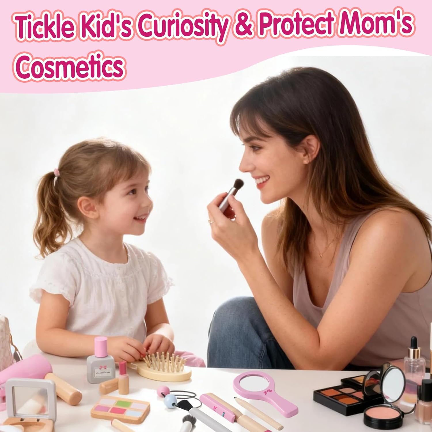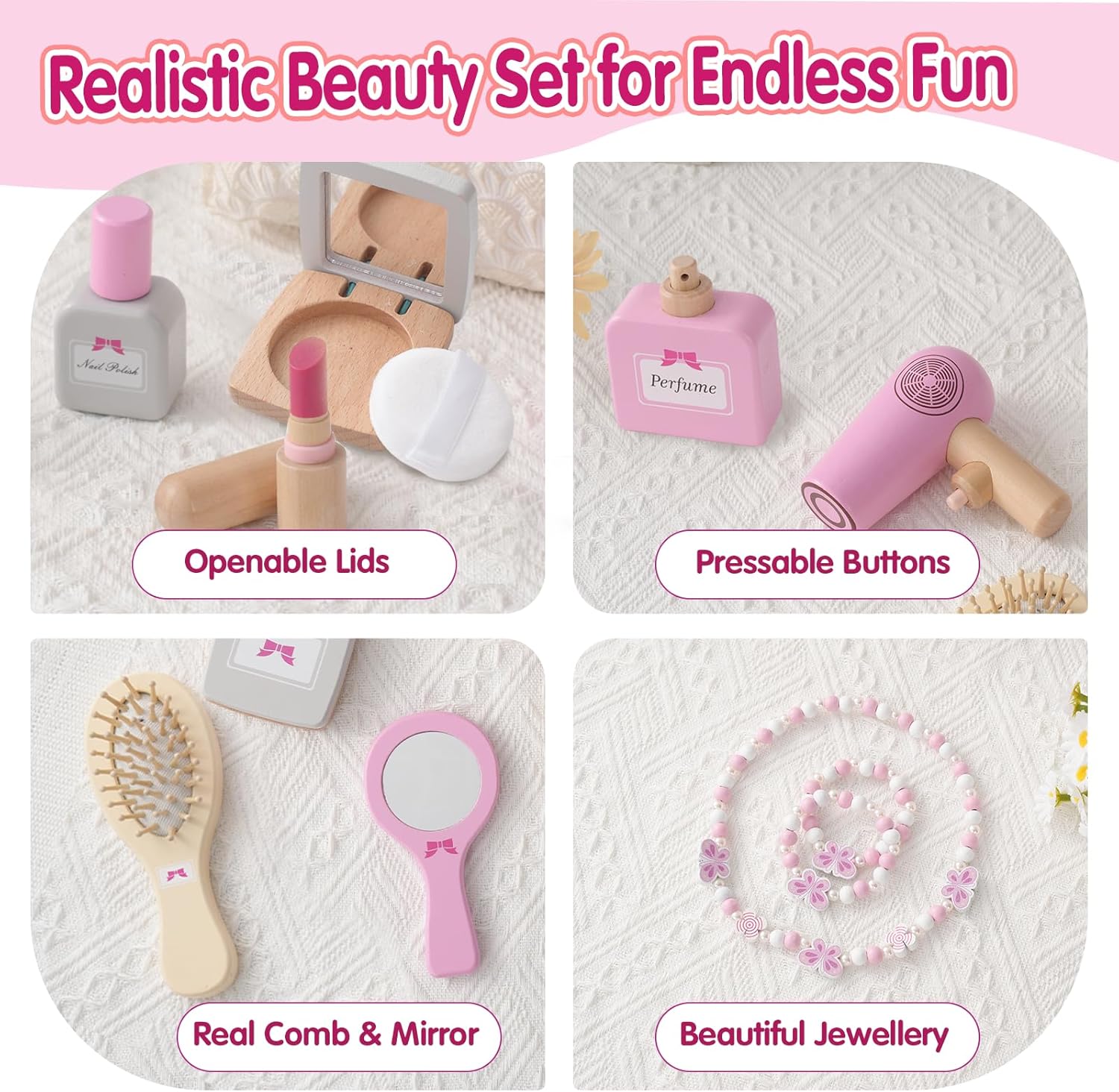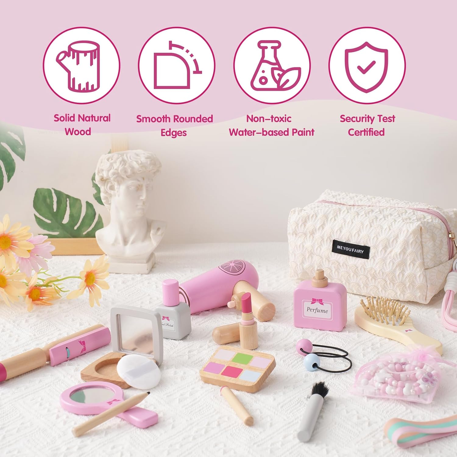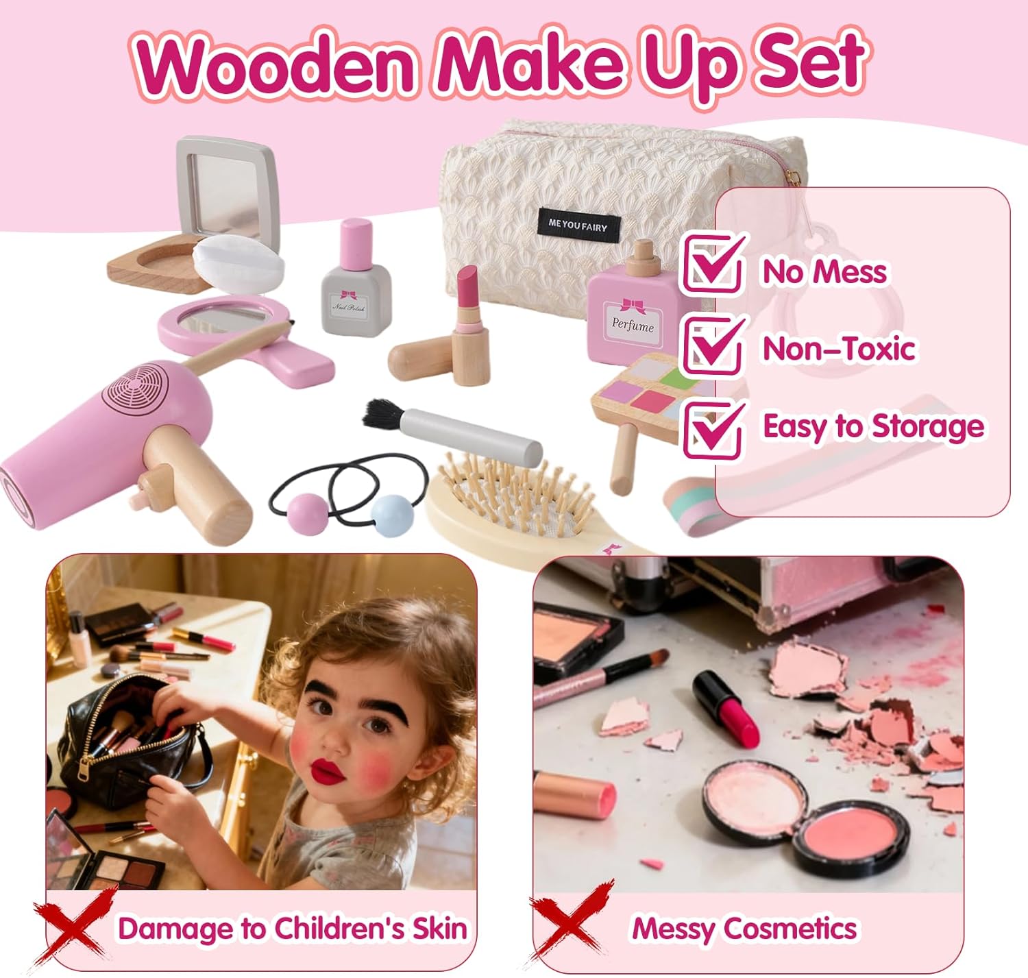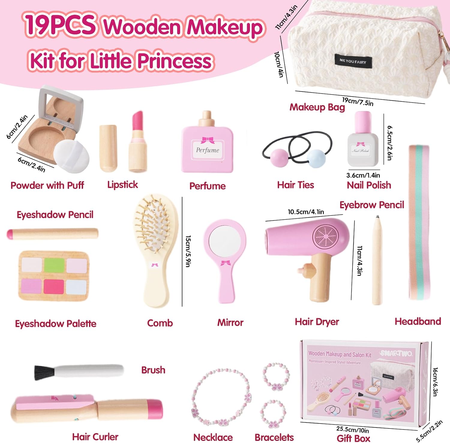 Set completo da 19 pezzi: asciugacapelli, ferro arricciacapelli, pettine, specchio, elastici per capelli, 2 fasce per capelli, profumo, cipria, ombretto, matita per sopracciglia, rossetto, pennello, smalto, collana, braccialetto, borsa per cosmetici. Con ricchi accessori e forme realistiche, questo set di cosmetici da gioco offre ai piccoli un divertimento duraturo. Giocattolo per imparare a truccare: le bambine amano imitare la mamma mentre si trucca. Questo set di trucchi in legno soddisfa la curiosità dei bambini senza creare disordine e protegge i cosmetici della mamma. La borsa per la conservazione in dotazione rende il set di trucco per legno facile da riporre e trasportare. Giocattolo a rulli per ragazze: questo kit di trucco contiene tutto per trucchi e parrucchieri e offre diverse possibilità di gioco. Sia come parrucchiere o estetista, i bambini possono allenare giocosamente le loro capacità motorie, promuovere la loro lingua, immaginazione e comunicazione sociale. Design adatto ai bambini: realizzato in legno di alta qualità e vernice a base d'acqua, robusto e durevole. Tutti gli accessori con bordo arrotondato e nessun rischio di lesioni per i bambini. Misura perfetta per le piccole mani del bambino. Ottima idea regalo: colore delicato, design carino e confezionato in una bella scatola di cartone. Questo set di valigetta per il trucco è un regalo perfetto per le ragazze, sia per compleanno, Pasqua, Natale, Ringraziamento o festa dei bambini. Età consigliata: 3-6 anni.
