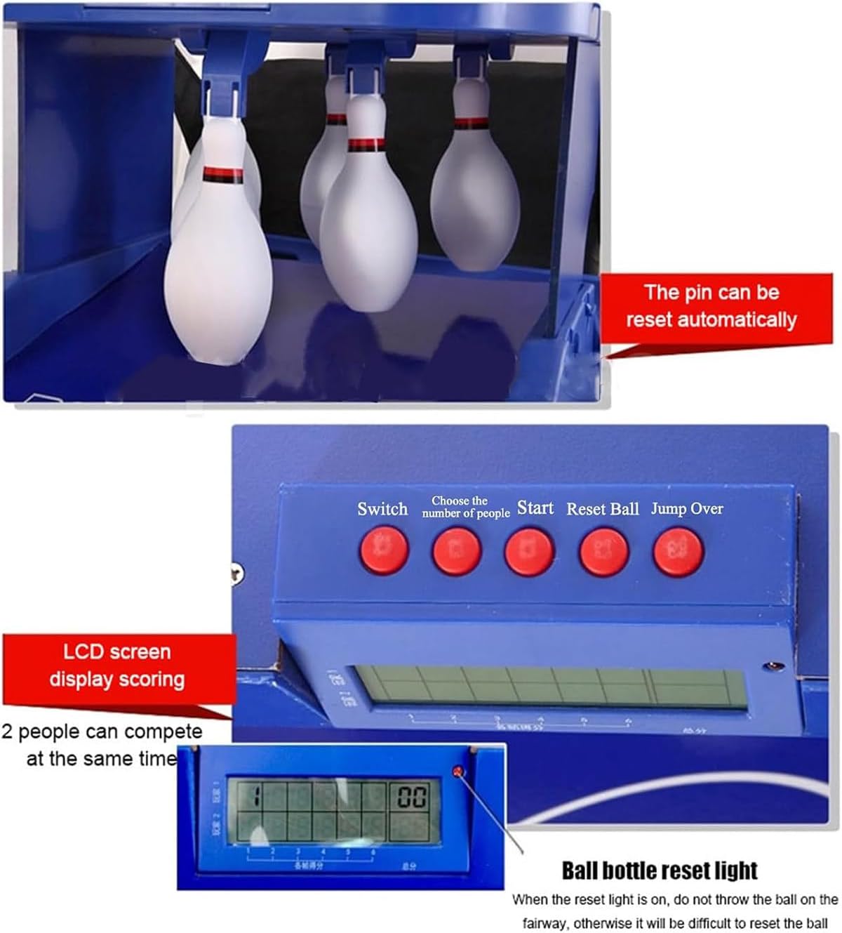 ★【SET DA BOWLING ELETTRONICO】Il set da bowling è dotato di funzioni di ritorno automatico della palla e punteggio, è alimentato a batteria e facile da usare. Il set da bowling include 6 birilli in plastica e 2 palle da bowling. I birilli e le palle da bowling sono realizzati in plastica di alta qualità, atossica e sicura per i bambini. ★【ARCO DI RITORNO AUTOMATICO DELLA PALLA】Quando lanci la palla nella bottiglia, questa si resetterà automaticamente emettendo un suono simulato di reset, rendendo il gioco più realistico e pratico. ★【DISPOSITIVO DI PUNTEGGIO ELETTRONICO A LED】Supporta il gioco da una o due persone contemporaneamente. L'obiettivo è abbattere il maggior numero possibile di birilli. Durante il gioco, il segnapunti elettronico a LED registrerà automaticamente il tuo punteggio e condividerà il divertimento della competizione. ★【FACILE DA INSTALLARE】Set da bowling elettrico portatile per uso domestico, che semplifica e velocizza l'installazione del gioco. Simula bene il peso relativo della palla ed è abbastanza liscio da poter essere ripiegato quando non in uso, senza lasciare angoli. ★【INTRATTENIMENTO GENITORI-BAMBINI】Il bowling è divertente, interessante, competitivo e stimolante. Il bowling da tavolo può avvicinare le persone. È un ponte di comunicazione tra famiglia e figli, rendendo la famiglia più armoniosa e gioiosa.