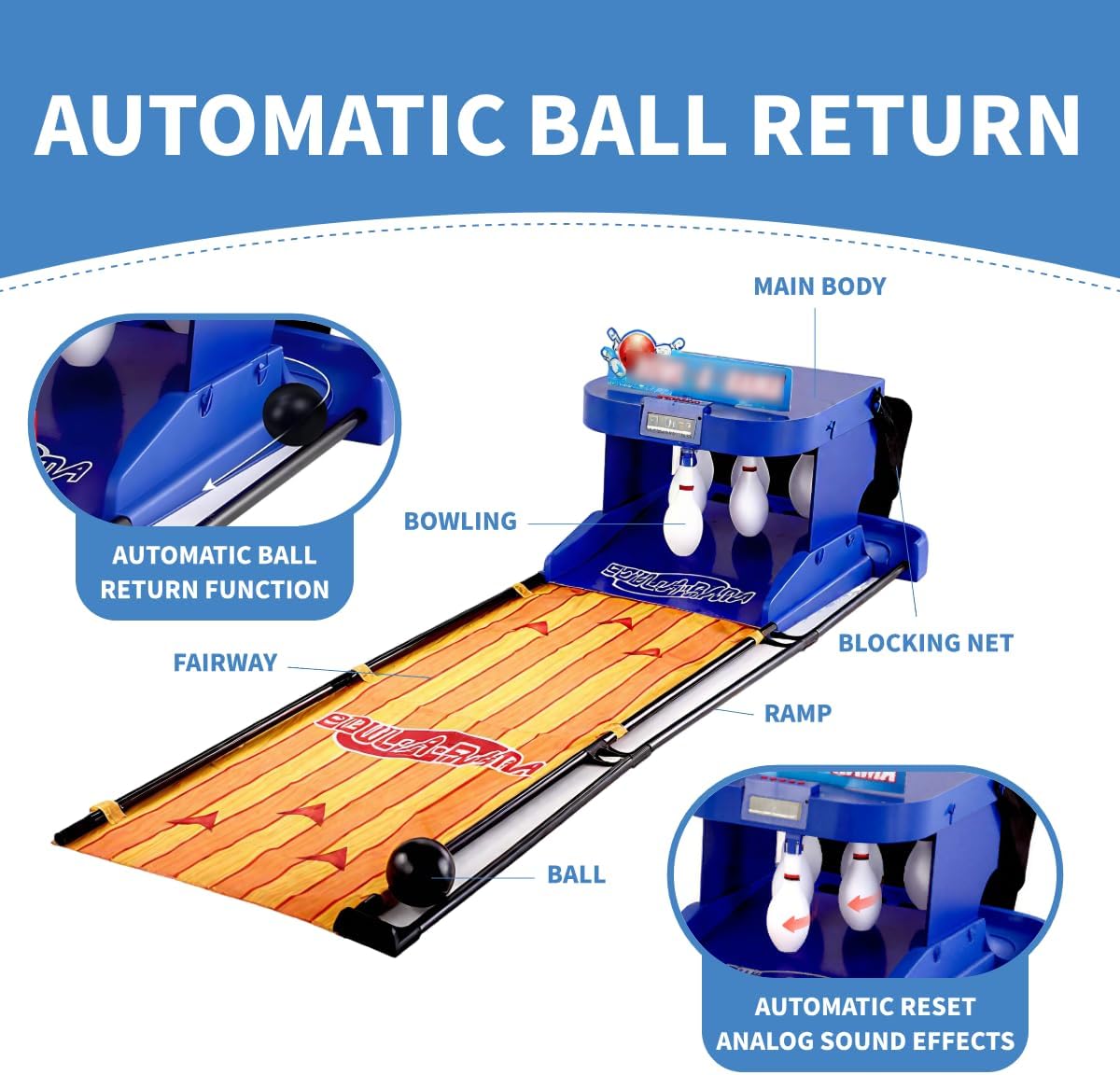 【Bowling elettronico per interni】Questo set da bowling è dotato di ritorno automatico della pallina e punteggio. È alimentato a batteria e facile da usare, e include 6 birilli e 2 palline, entrambi in plastica, il che lo rende adatto ai bambini. 【Punteggio elettronico automatico】Supporta il gioco interattivo per uno o due giocatori, con un tabellone segnapunti elettronico a LED che registra automaticamente il punteggio. 【Ritorno automatico della pallina】Quando la pallina viene lanciata sui birilli, questi tornano automaticamente nella loro posizione originale con un suono simulato di ritorno, rendendo il gioco più realistico e pratico. 【Intrattenimento genitori-figli】Il bowling è divertente, competitivo e basato sulle abilità, avvicinando le persone. Funge da ponte per la comunicazione tra famiglie e bambini, promuovendo armonia e felicità. 【Installazione semplice】Questo set da bowling elettrico portatile e di grandi dimensioni, perfetto per l'uso familiare, consente un'installazione di gioco rapida e semplice, simula accuratamente il peso delle palline e si ripiega per risparmiare spazio.