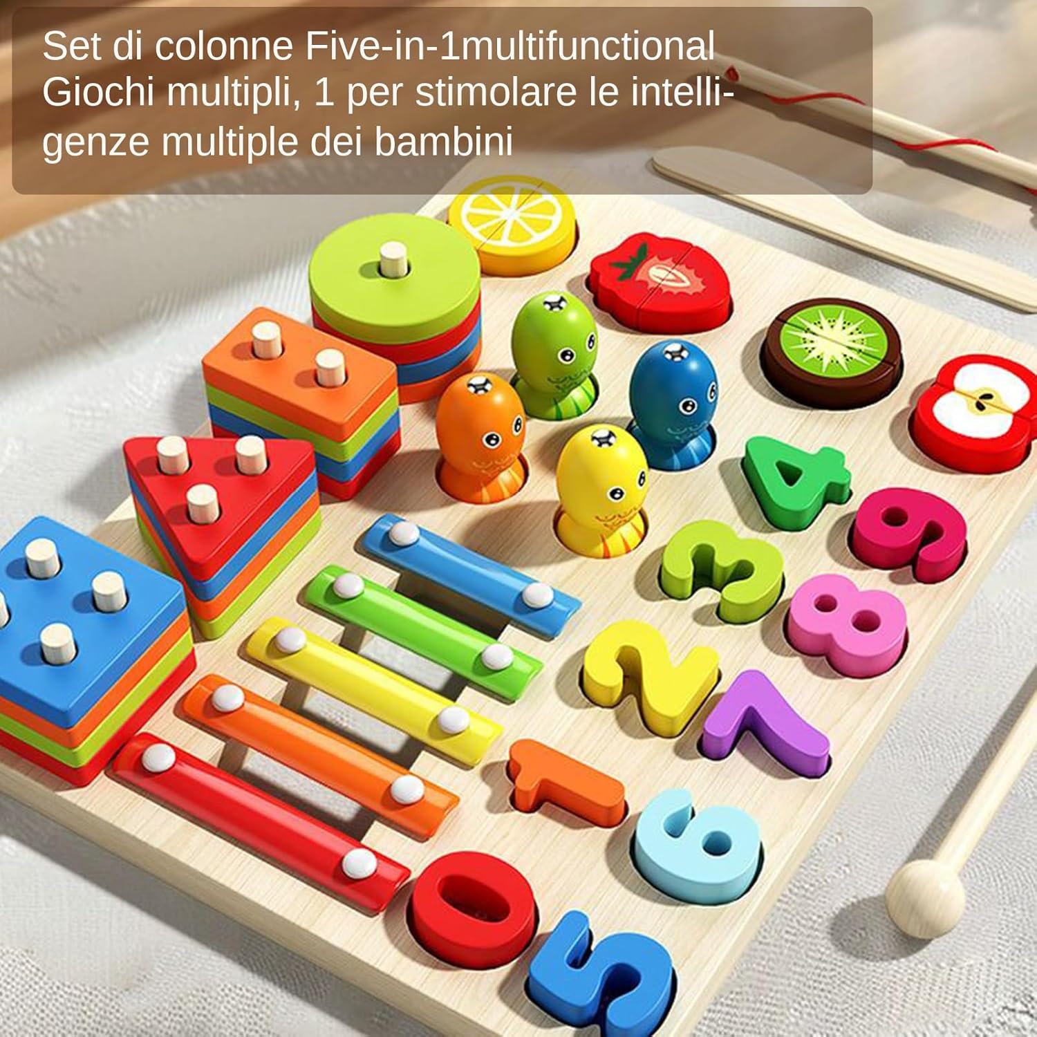 Regalo Creativo: Incoraggia lo sviluppo cognitivo infantile mentre sperimentano il divertimento di ordinare le forme, eccellente che dimostra attenzione e favorisce la loro creatività illimitata e uso immaginativo nelle fasi di crescita Costruzione : Struttura in legno spesso anti-crepa, finemente levigata per eliminare ogni irregolarità, offre un'esperienza sicura per l'utilizzo prolungato da parte dei bambini Materiali Solidi: Design in legno naturale con finitura ad acqua sicura, caratterizzato da superfici delicate che coccolano la pelle tenera per comfort continuativo. Uso Multifunzionale:Stimola le capacità cognitive attraverso giochi di forme, numeri e frutta, potenziando concentrazione, coordinazione manuale e curiosità per l'apprendimento durante attività educative coinvolgenti Operazione intuitiva: Grazie ai moduli interattivi, i bambini sviluppano pensiero logico e competenze fondamentali per l'apprendimento precoce, affinando movimenti precisi e potenziando la loro innata curiosità