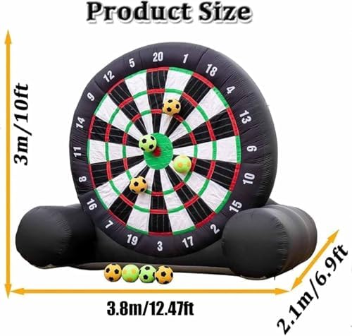 Bersaglio gonfiabile da calcio per esterni. Costruzione durevole e stabile: misura 3 x 3 metri ed è realizzato in tessuto Oxford 210D per migliorare la resistenza all'usura e prevenire l'elettricità statica. Le giunzioni a doppia cucitura garantiscono una tenuta stagna e una durata superiori, mentre il design triangolare del telaio offre una maggiore stabilità rispetto ai bersagli tradizionali. Set di freccette e calcio gonfiabile per esterni: dotato di un pallone da calcio in feltro di alta qualità, questo sport unico unisce calcio e freccette in un gioco emozionante. Il bersaglio gonfiabile di grandi dimensioni è alto ben 3 metri, il che lo rende perfetto per giocatori di tutte le età. Bersaglio da calcio gonfiabile per esterni. Montaggio rapido e pratico: monta il bersaglio da calcio gonfiabile in meno di 2 minuti con il minimo sforzo. Ricordati solo di chiudere la cerniera prima di gonfiarlo. Una volta sgonfiato, si ripiega in dimensioni compatte per un facile trasporto e stoccaggio. Tienilo lontano da oggetti appuntiti per mantenerlo in buone condizioni. Freccette da calcio gonfiabili per esterni. Divertimento versatile per tutte le occasioni: questa coinvolgente attività è ideale per chi desidera affinare le proprie abilità o per le squadre che competono per il punteggio più alto. Goditi ore di intrattenimento in giardini, palestre, scuole, eventi comunitari o gite aziendali, promuovendo al contempo una sana competizione. Freccette da calcio gonfiabili per esterni Pacchetto completo di accessori incluso: goditi un'esperienza senza problemi con tutti gli accessori necessari, tra cui un soffiatore elettrico, una pompa da calcio, un ago per palline, chiodi da terra, corde, telo di riparazione, una borsa per il trasporto e sacchi di sabbia per una maggiore stabilità.