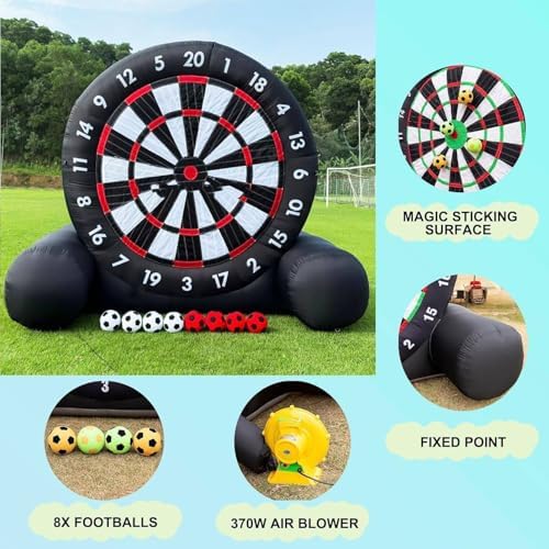 Freccette da calcio gonfiabili per esterni. Installazione rapida e semplice: il potente soffiatore da 370 W gonfia il bersaglio in soli 3 minuti. Basta chiuderlo con la cerniera prima di gonfiarlo. Si sgonfia facilmente e occupa solo 0,3㎡ una volta piegato. La confezione include una comoda borsa per il trasporto e un set completo di accessori, tra cui picchetti antigraffio e sacchi di sabbia per un doppio fissaggio e resistenza al vento. È necessario un gonfiaggio continuo durante il gioco. Bersaglio gonfiabile da calcio per esterni. Costruzione professionale e durevole: realizzato in tessuto Oxford antistatico 210D con cuciture doppie, questo bersaglio gonfiabile è progettato per essere resistente all'usura e agli strappi. La sua struttura triangolare migliora la stabilità del 70% e il bersaglio autoriparante presenta un'elevata adesività per una facile rimozione senza danneggiare le palline. Bersaglio gonfiabile da calcio e freccette per esterni. Opzioni di gioco versatili: con oltre 15 modi creativi di giocare, questo bersaglio gonfiabile per freccette include 8 palloni da calcio in feltro e supporta varie attività all'aperto come calci, lanci, tiri e modalità competitive. Goditi giochi originali ed esclusivi e un divertimento senza fine, adatto per gare di freccette, fuoricampo, golf e altro ancora. Bersaglio gonfiabile da calcio per esterni con freccette adesive: niente più preoccupazioni per le freccette che cadono. Questo bersaglio è appositamente progettato per la massima aderenza e una presa superiore, rendendo facile anche per i giocatori più piccoli recuperare le freccette dal bersaglio. Bersaglio gonfiabile per freccette da calcio per esterni Pacchetto completo di accessori: il set di freccette gonfiabili è dotato di un grande bersaglio gonfiabile per freccette da calcio, un soffiatore elettrico, una pompa da calcio, birilli, picchetti, corde, telo di riparazione, borsa per il trasporto e sacchi di sabbia per tutte le tue esigenze di gioco.