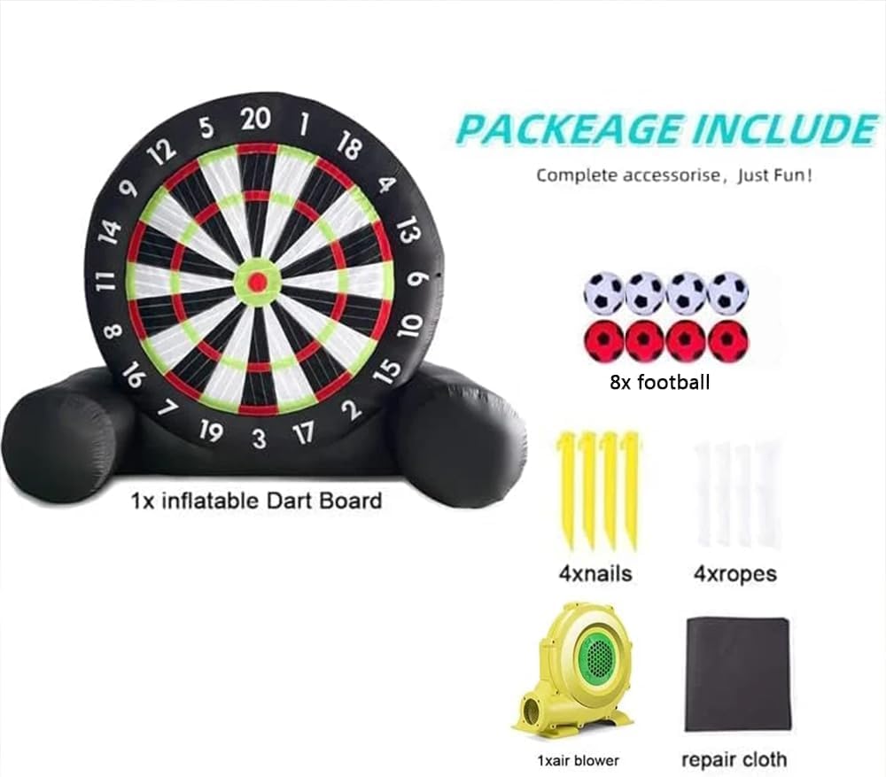 Bersaglio gonfiabile per freccette da calcio. Realizzato in tessuto Oxford 210D, il bersaglio gonfiabile è progettato per prevenire l'elettricità statica e migliorare la resistenza all'usura. La tecnologia a doppia cucitura migliora l'ermeticità e la durata, mentre il design triangolare del telaio garantisce stabilità. Freccette da calcio gonfiabili Include un pallone da calcio in feltro da calciare contro il bersaglio gonfiabile di grandi dimensioni da 3x3 metri, che combina calcio e freccette per un divertimento adatto sia a bambini che ad adulti. La superficie autoadesiva assicura che le palline aderiscano all'impatto. Freccette da calcio gonfiabili. Montaggio rapido in meno di 2 minuti, con gonfiaggio e sgonfiaggio facili. Dotato di cerniera per un gonfiaggio sicuro e ripiegabile in dimensioni compatte per un comodo stoccaggio e trasporto. Si consiglia cautela in prossimità di oggetti appuntiti per evitare danni. Freccette gonfiabili da calcio. Perfette per lo sviluppo delle abilità o per il gioco di squadra competitivo, offrono un intrattenimento senza fine in vari contesti, come cortili, palestre, scuole ed eventi comunitari. Ideali per rafforzare i legami familiari o per il team building sul posto di lavoro. Il set di freccette gonfiabili da calcio è dotato di un set completo di accessori, tra cui un soffiatore elettrico, una pompa da calcio, un ago per palline, un chiodo da terra, corde, un telo di riparazione, una borsa per il trasporto e sacchi di sabbia, per garantirti tutto il necessario per un divertimento immediato.