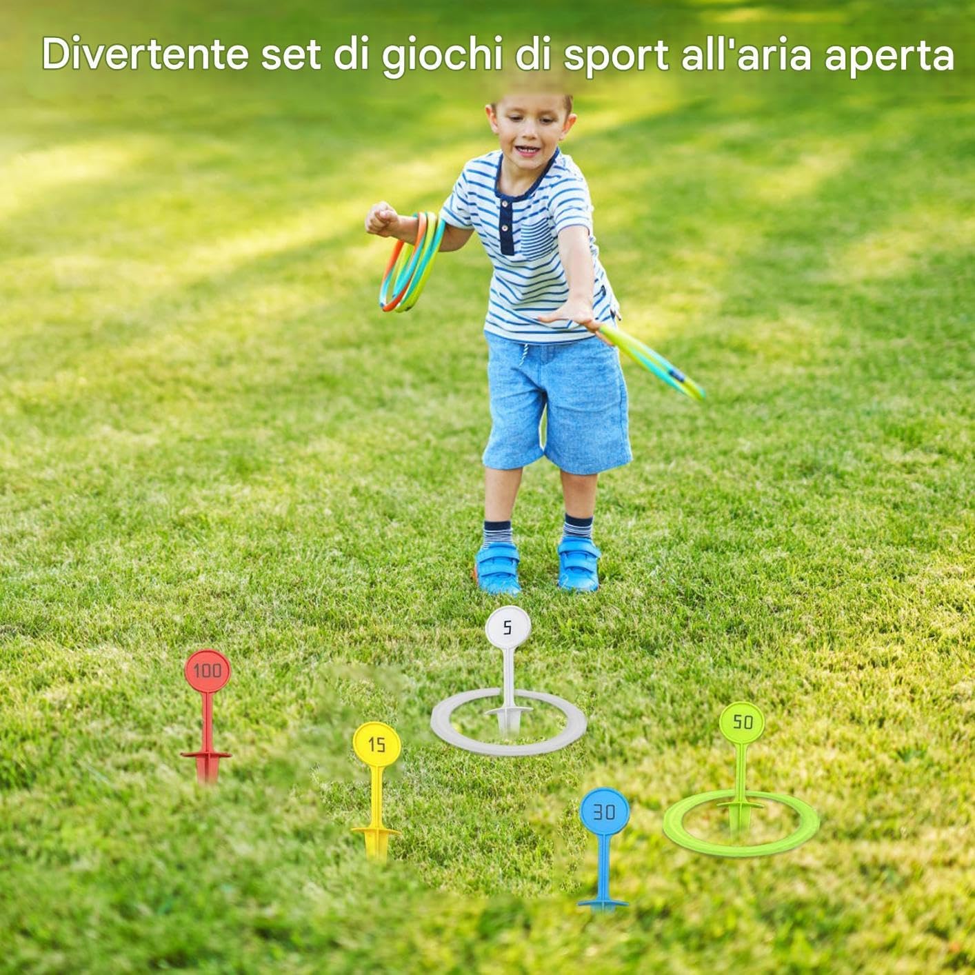 Divertimento all'Aperto: Progettato con tinte luminose e ad alta visibilità, il set per lancio degli anelli aumenta la visibilità e aiuta la coordinazione occhio-mano, per attività ricreative esterne ed esercitazioni di precisione sul bersaglio Sviluppo Abilità Cognitive:Migliora le capacità logiche con questo gioco educativo per tutte le età, ideale per apprendere la matematica e distinguere i colori durante sessioni di gioco coinvolgenti Portabilità Assoluta:Gioco da giardino portatile per campeggio e raduni, installazione immediata migliora ogni esperienza familiare senza Giocattolo Sicuro:Giocattolo sicuro con punteggio a colori e anelli facili da maneggiare, offre divertimento dinamico ma semplice per tutte le età, favorendo l'interazione sociale durante giochi di gruppo con amici e familiari Divertimento Creativo:: Questo versatile gioco ad anelli è un regalo , unisce gioco di coordinazione e strategia, stimola l'attività fisica e garantisce divertimento assicurato durante feste o momenti di gioco informali.