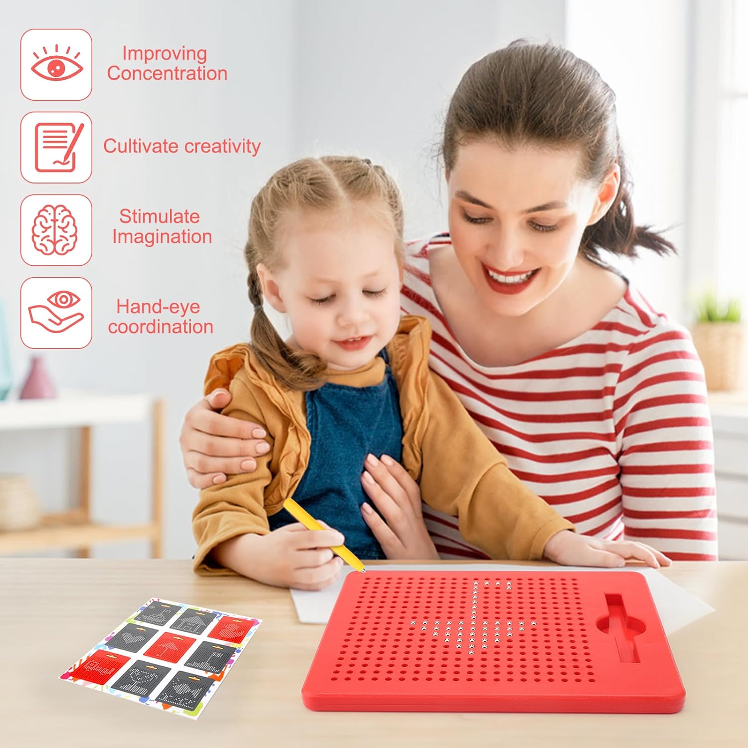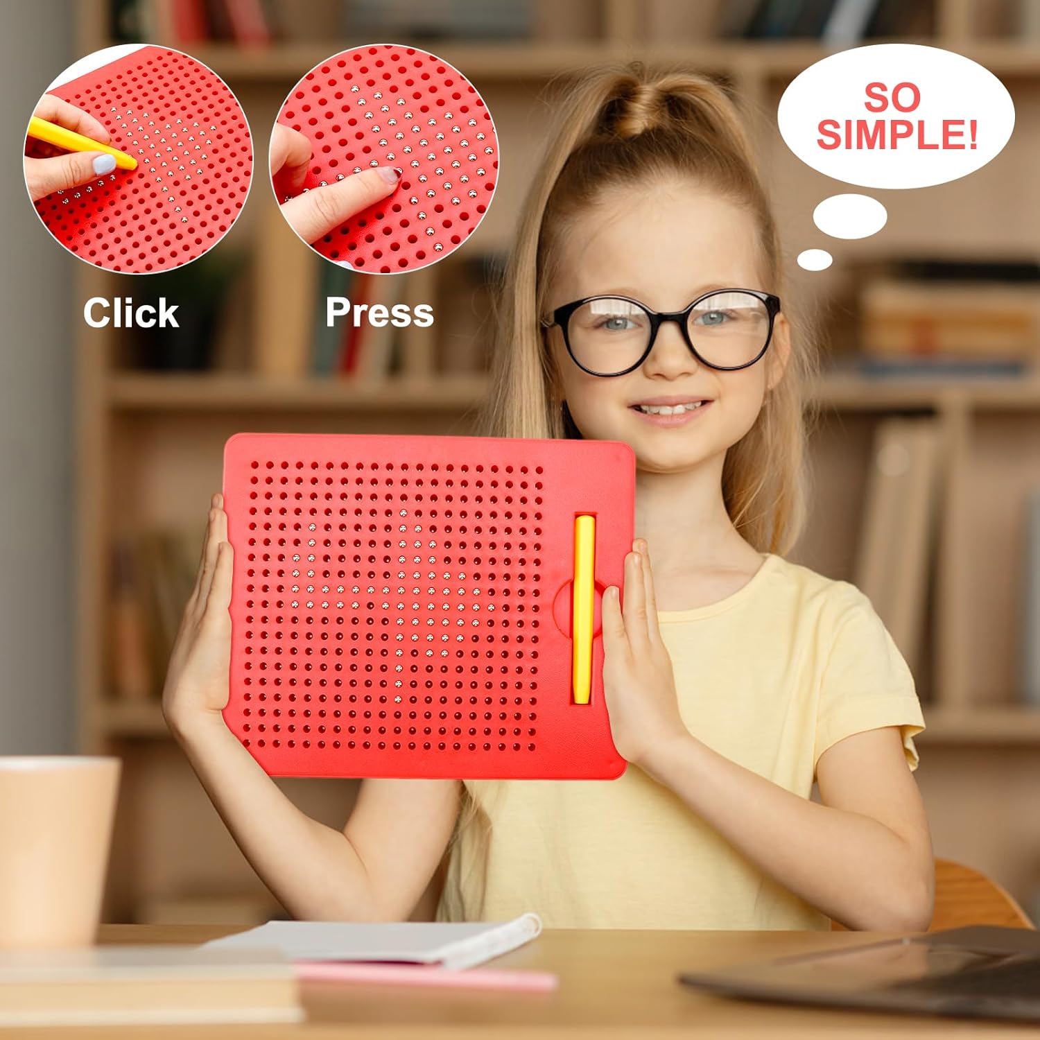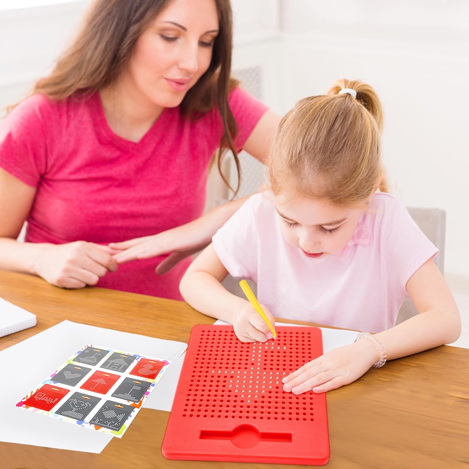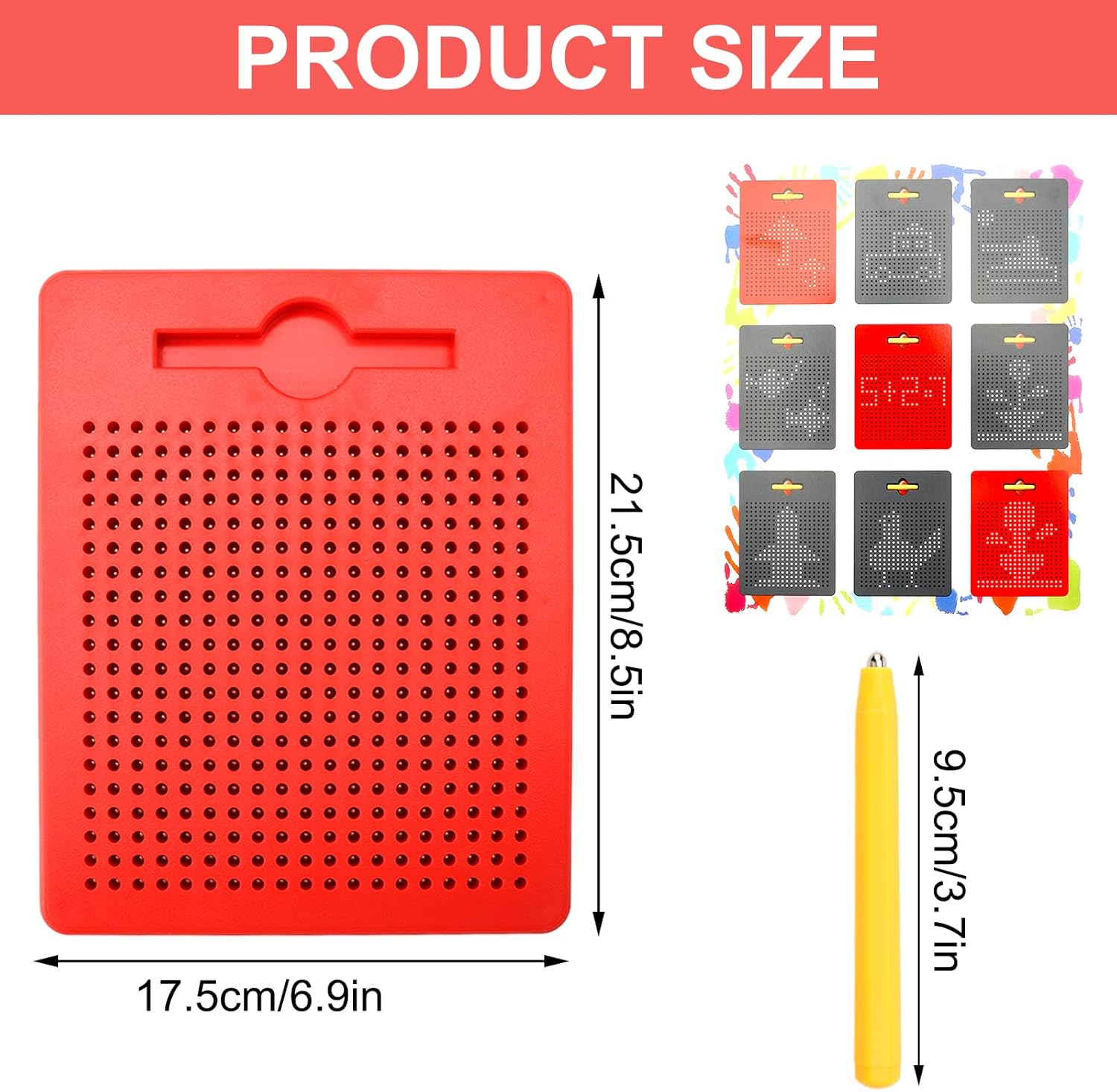 Materiale sicuro: la lavagna magica magnetica è realizzata in materiale ABS atossico di alta qualità + sfere magnetiche, che non si danneggiano facilmente, durevole e resistente all'usura e adatta ai bambini. Le sfere magnetiche sono più grandi dei piccoli fori e aderiscono saldamente alla lavagna magica e non cadono facilmente. Facile da usare: basta utilizzare la punta magnetica per tirare le sfere magnetiche sulla superficie e disegnare modelli, numeri e lettere. Le linee indesiderate possono essere facilmente cancellate con un solo tocco o la punta della penna. La lavagna da disegno magnetica misura 21,5 x 17,5 cm, facile da trasportare in viaggio. Giocattolo educativo ideale: questo gioco magnetico per bambini può essere integrato in diverse attività di apprendimento in modo giocoso e aiuta i bambini a sviluppare la coordinazione occhio-mano, le abilità motorie, la regolazione della forma, il riconoscimento dei colori e il pensiero logico precoce e migliorare la loro concentrazione e pazienza. Interazione genitore-figlio: i genitori possono giocare con i loro bambini a lavagna magnetica per migliorare la comunicazione emotiva con i loro bambini mentre giocano. I genitori possono incoraggiare i bambini a scoprire il loro lato artistico e ispirarli a imparare con divertimento. I bambini possono anche stimolare la loro immaginazione e creatività per creare sorprese e divertimento. Regalo perfetto: questo giocattolo magnetico è un regalo perfetto per bambini dai 3 anni in su, ideale come giocattolo educativo per la festa dei bambini, Natale, compleanni, giorno del Ringraziamento, ecc. o come giocattolo da viaggio. Divertente tavolo da disegno magnetico è sufficiente per i bambini a giocare lontano dagli schermi elettronici per ore.